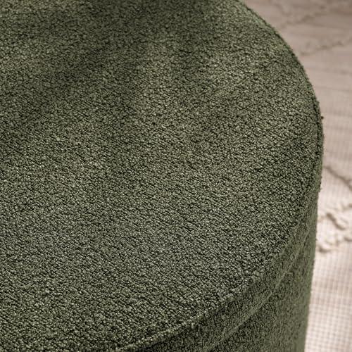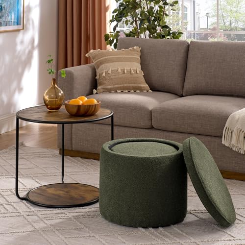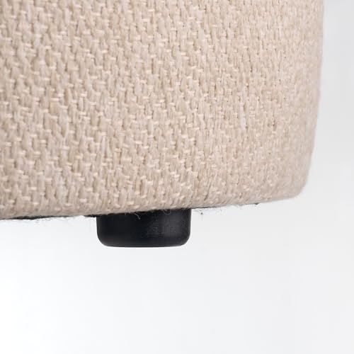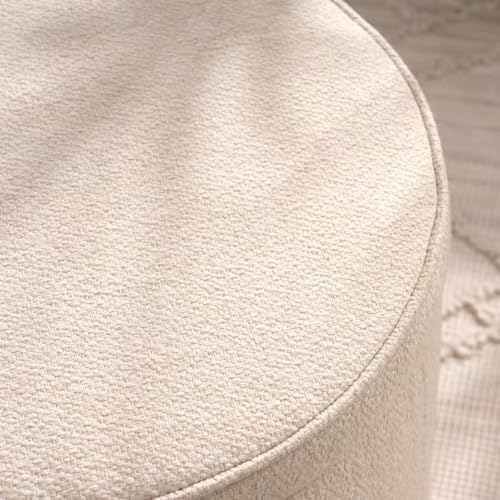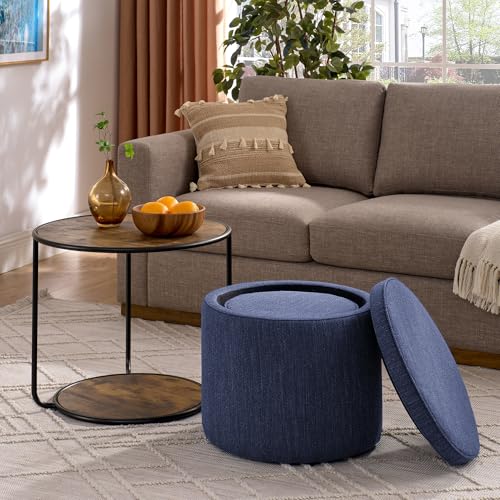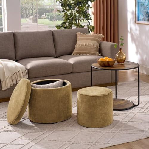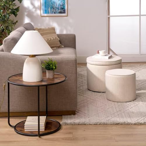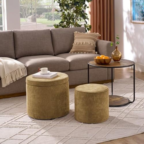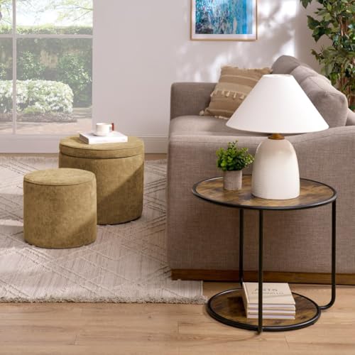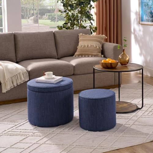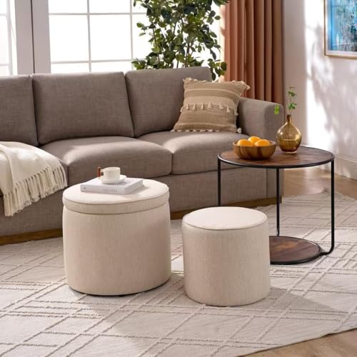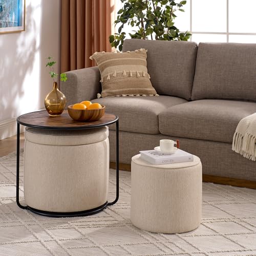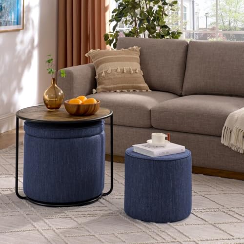 Round Storage Ottoman and Coffee Table Set - 2 Pcs Linen Upholstered Nesting Tables with Storage for Living Room and Bedroom, Versatile Ottoman and Vanity Stool Combo