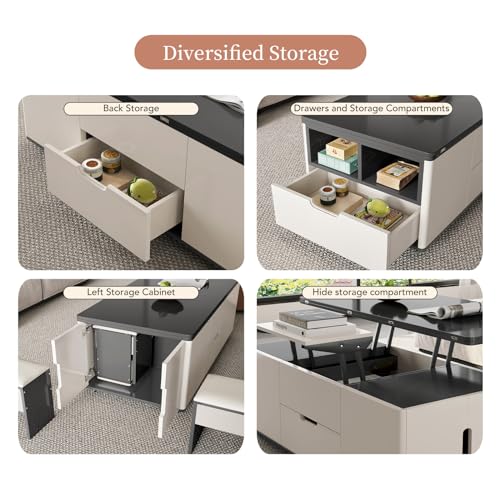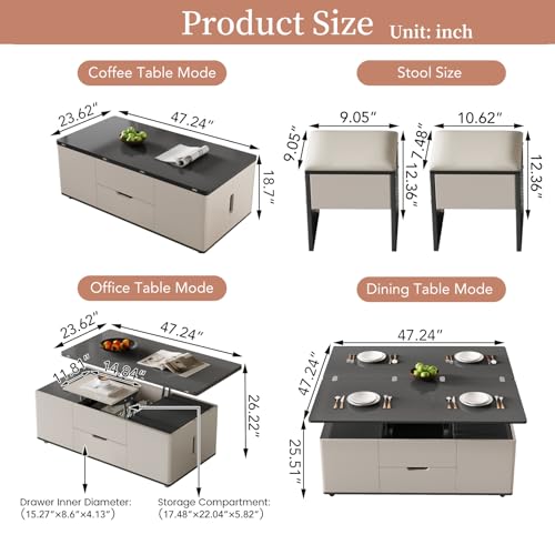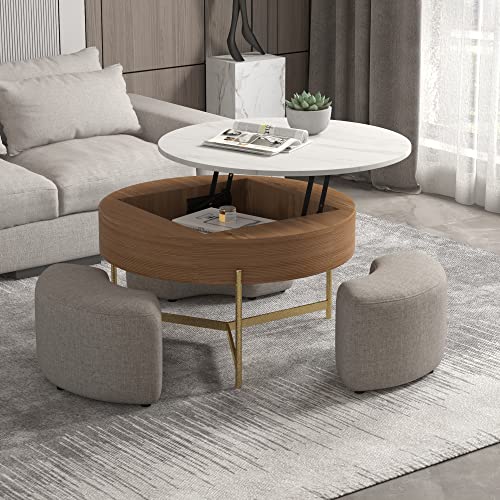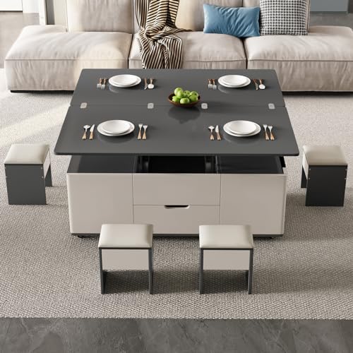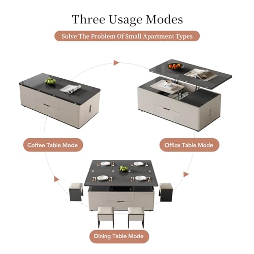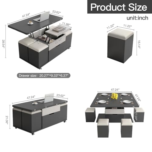 Lifting Coffee Table with 4 Stools 3 in 1 Center Table with Storage Side Table Convert to Dining Table Multifunctional Saving Space for Living Room Apartment Wheels