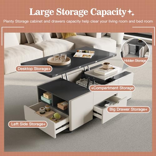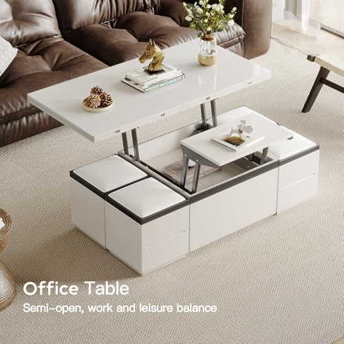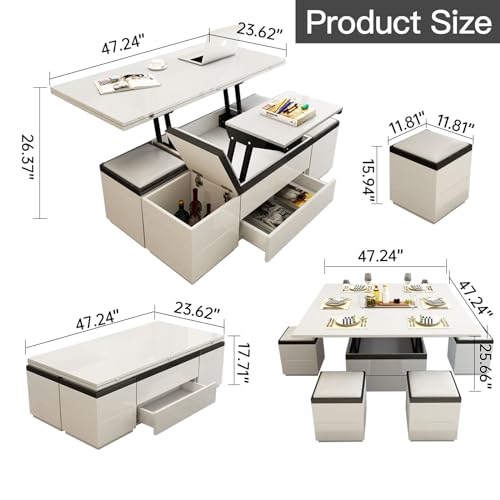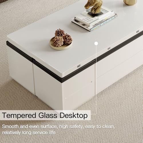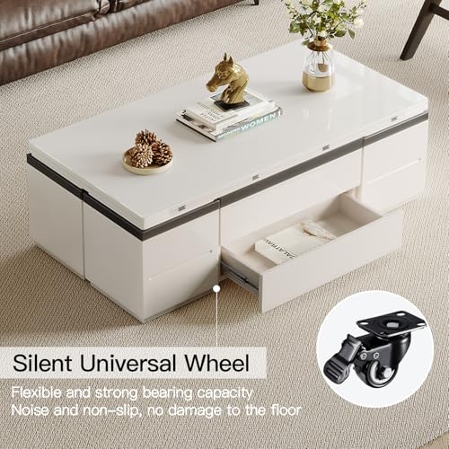 Sturdy Coffee Table with Lifting Top,Multifunction Modern Coffee Table with Four Stools,Storage Extendable End Tables for Living Room,Apartment,Eating Area,White