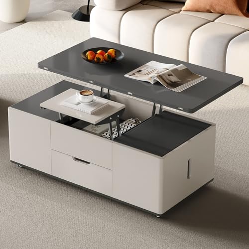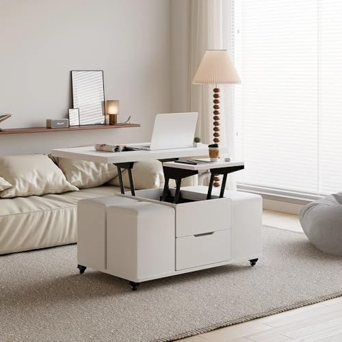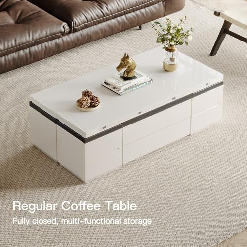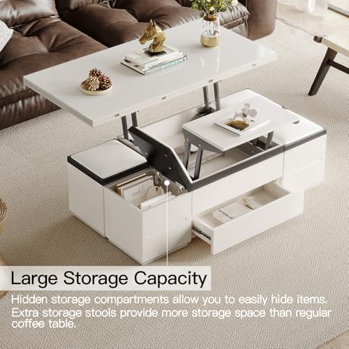 homary White Lift Top Coffee Table with Hidden Storage, 3 in 1 Multi-Function Modern Folding Center Table with 4 Stools and Casters