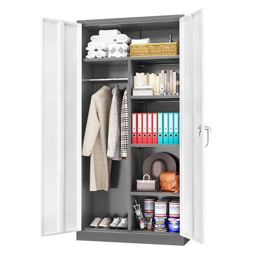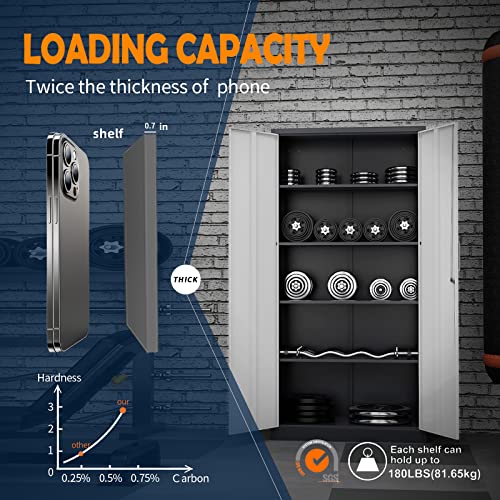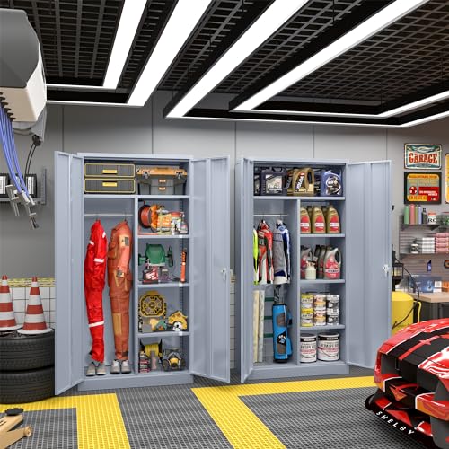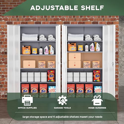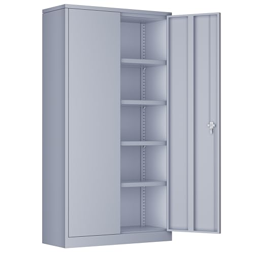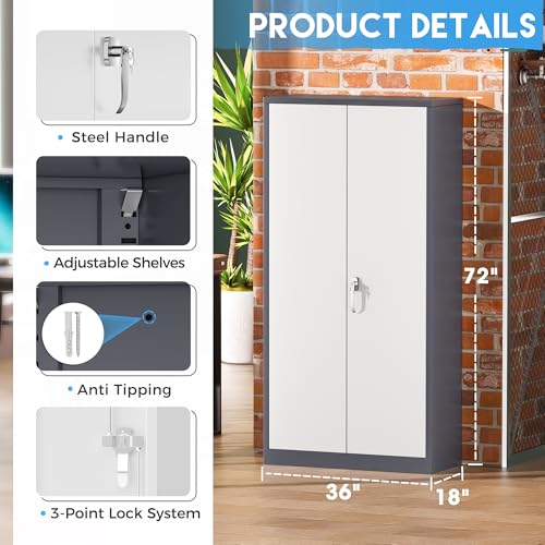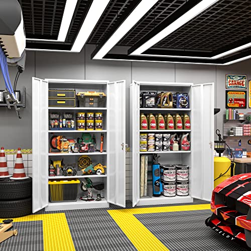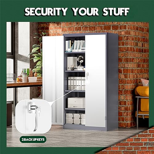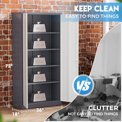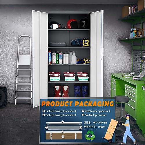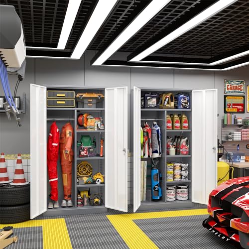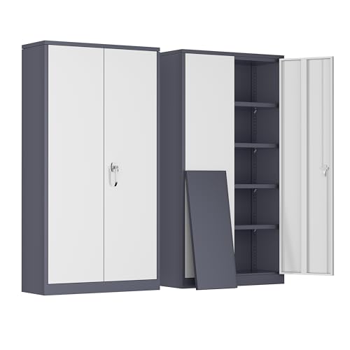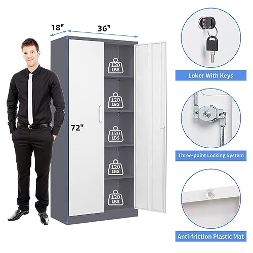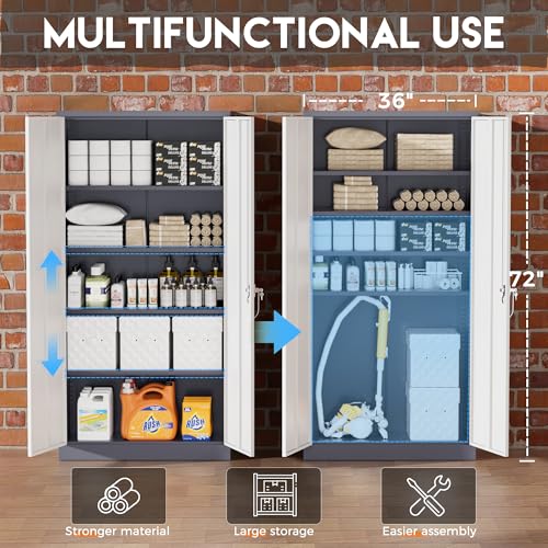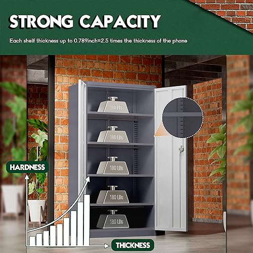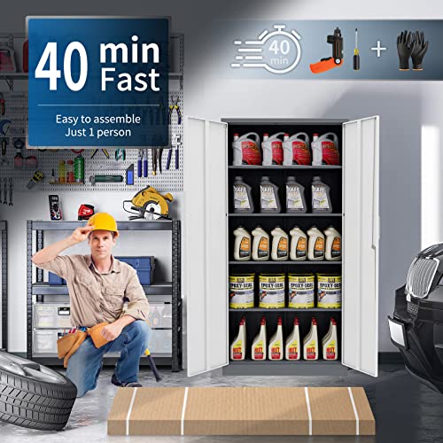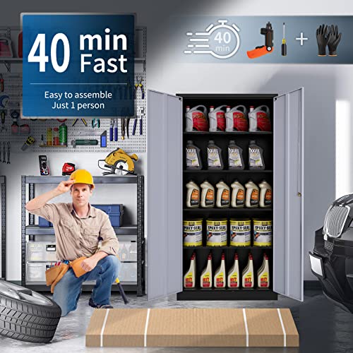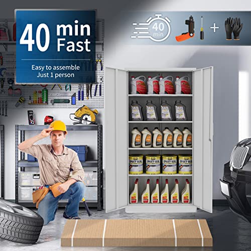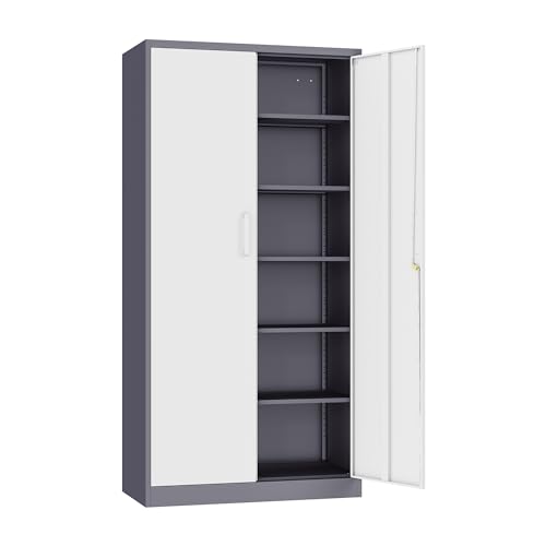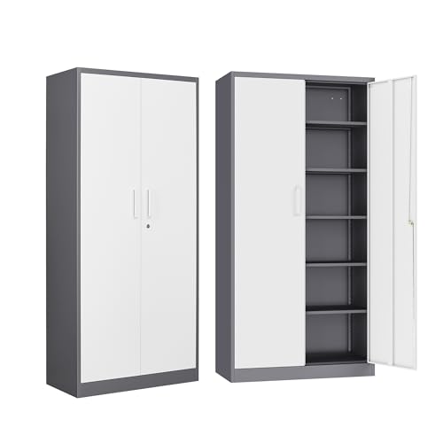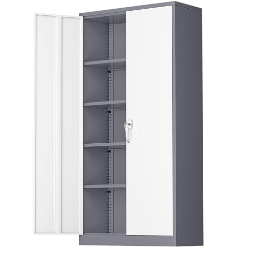 Yizosh Metal Garage Storage Cabinet with 2 Doors and 5 Adjustable Shelves - 71" Steel Lockable File Cabinet,Locking Tool Cabinets for Office,Home,Garage,Gym,School (Gray White)