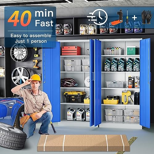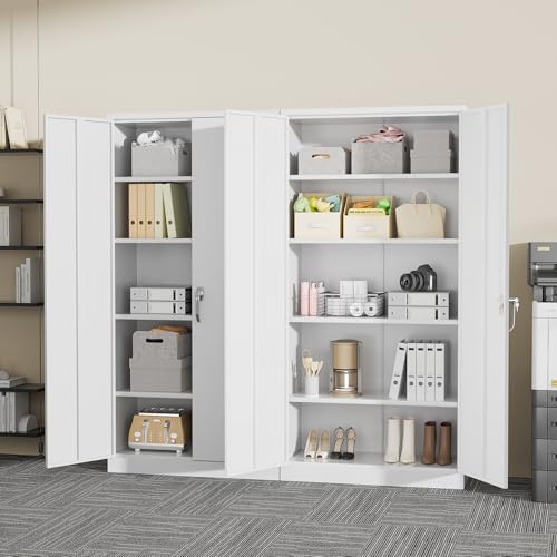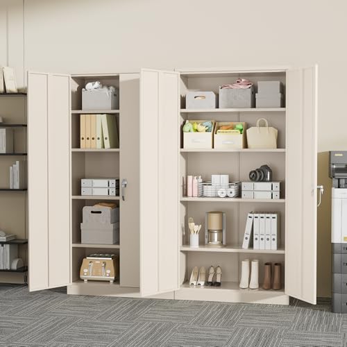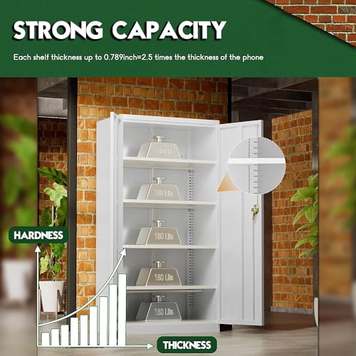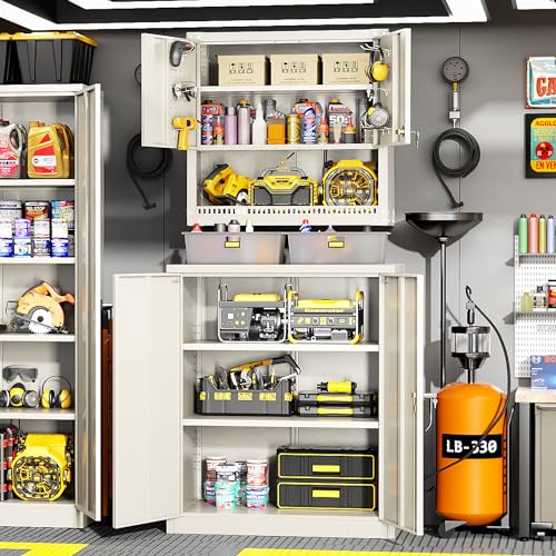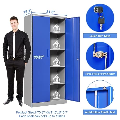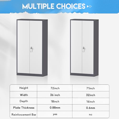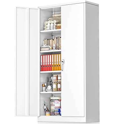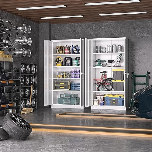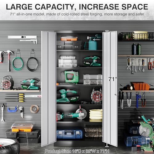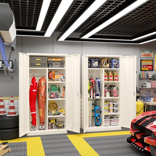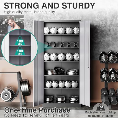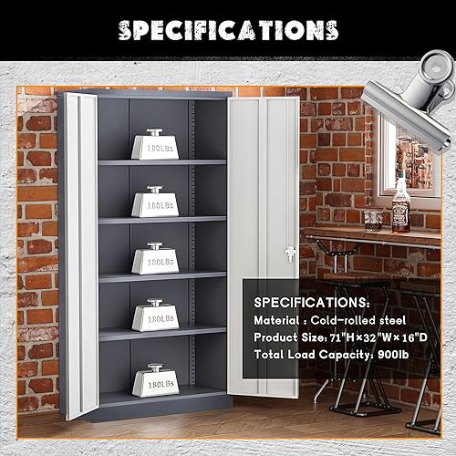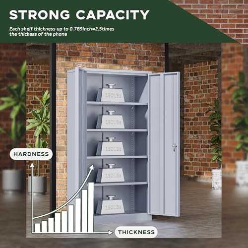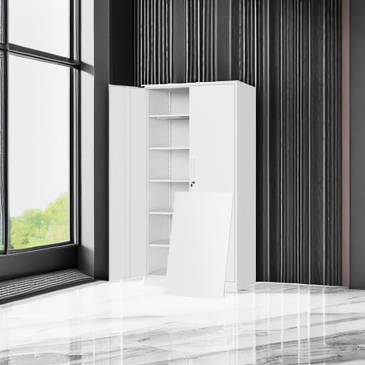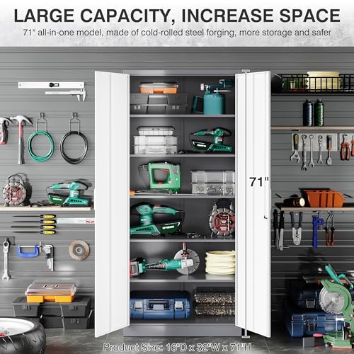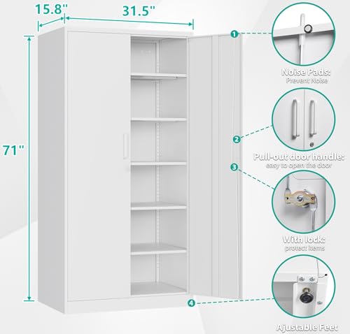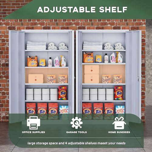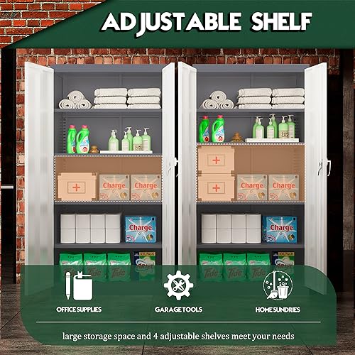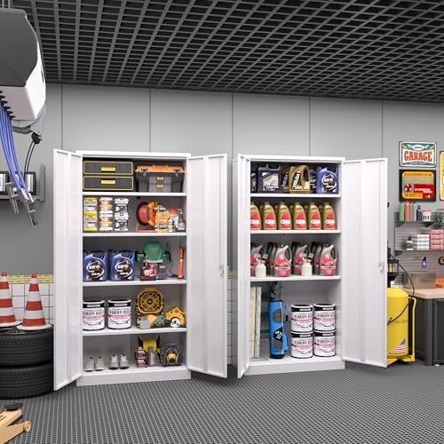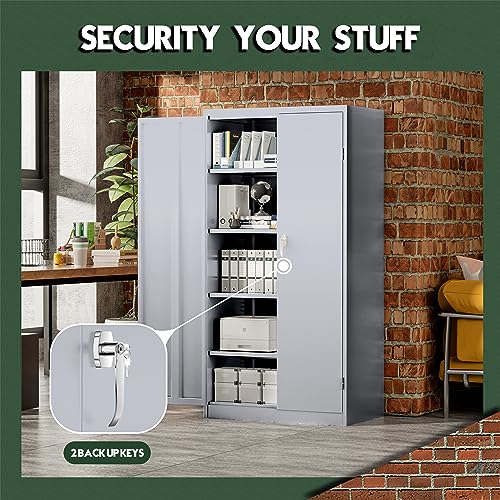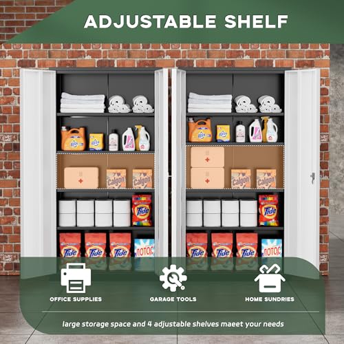 Yizosh Metal Garage Storage Cabinet with 2 Doors and 5 Adjustable Shelves - 71" Steel Lockable File Cabinet,Locking Tool Cabinets for Office,Home,Garage,Gym,School (Gray White)