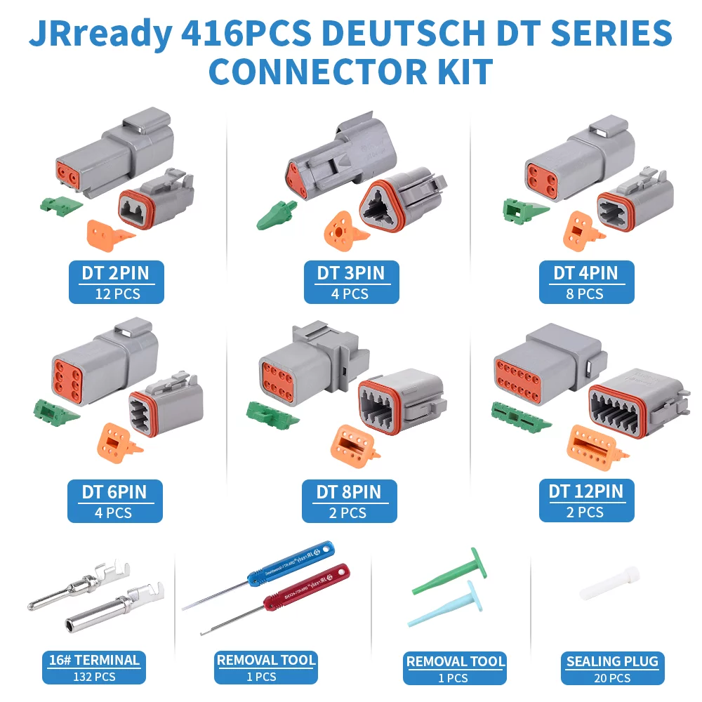 JRready 416PCS Deutsch Connector Kit,2,3,4,6,8,12 Pin Connector with terminals Removal Tool, Waterproof Automotive Electrical DT Connector Plug for Truck,Bus,Car,Scooter,Marine,Motorcycle Wiring