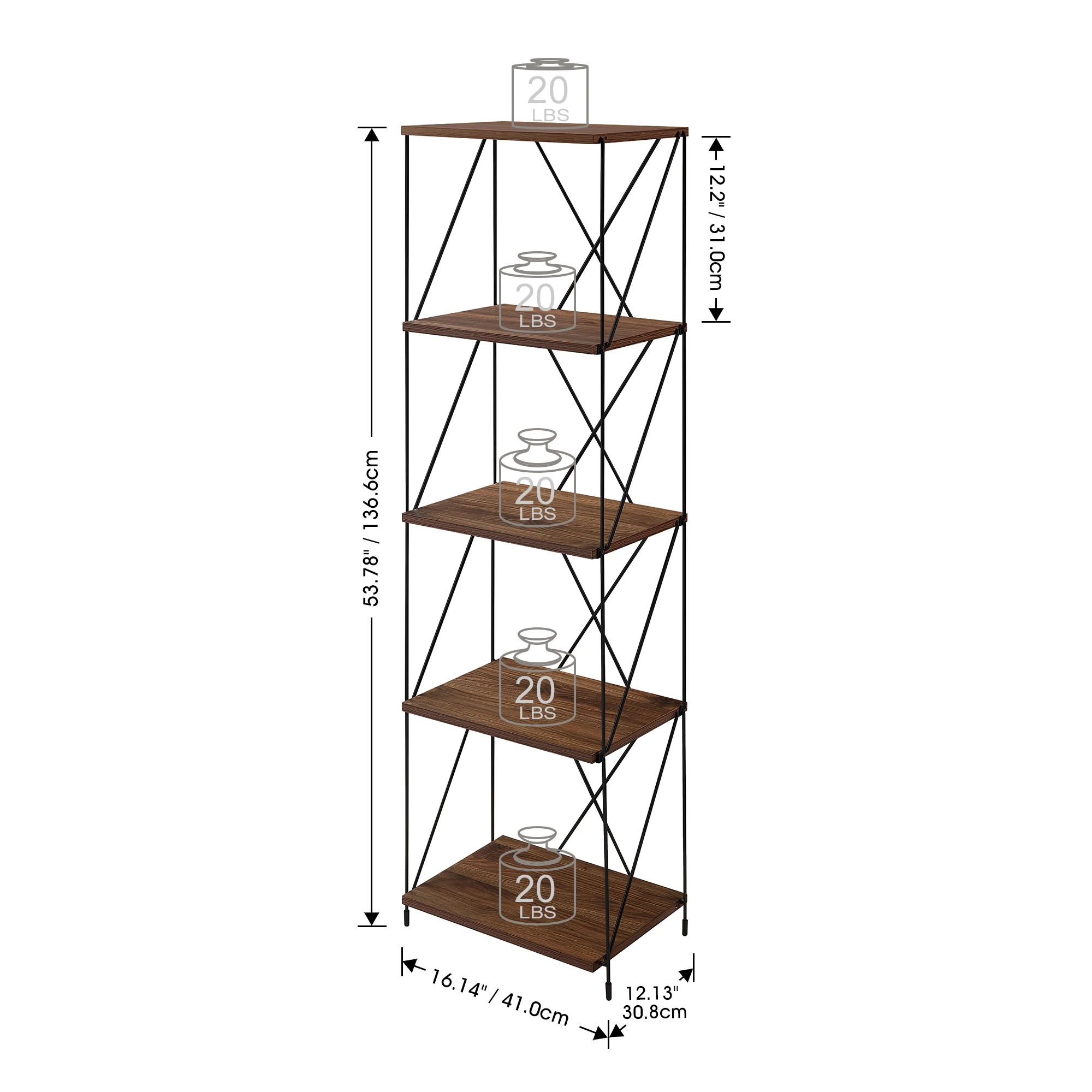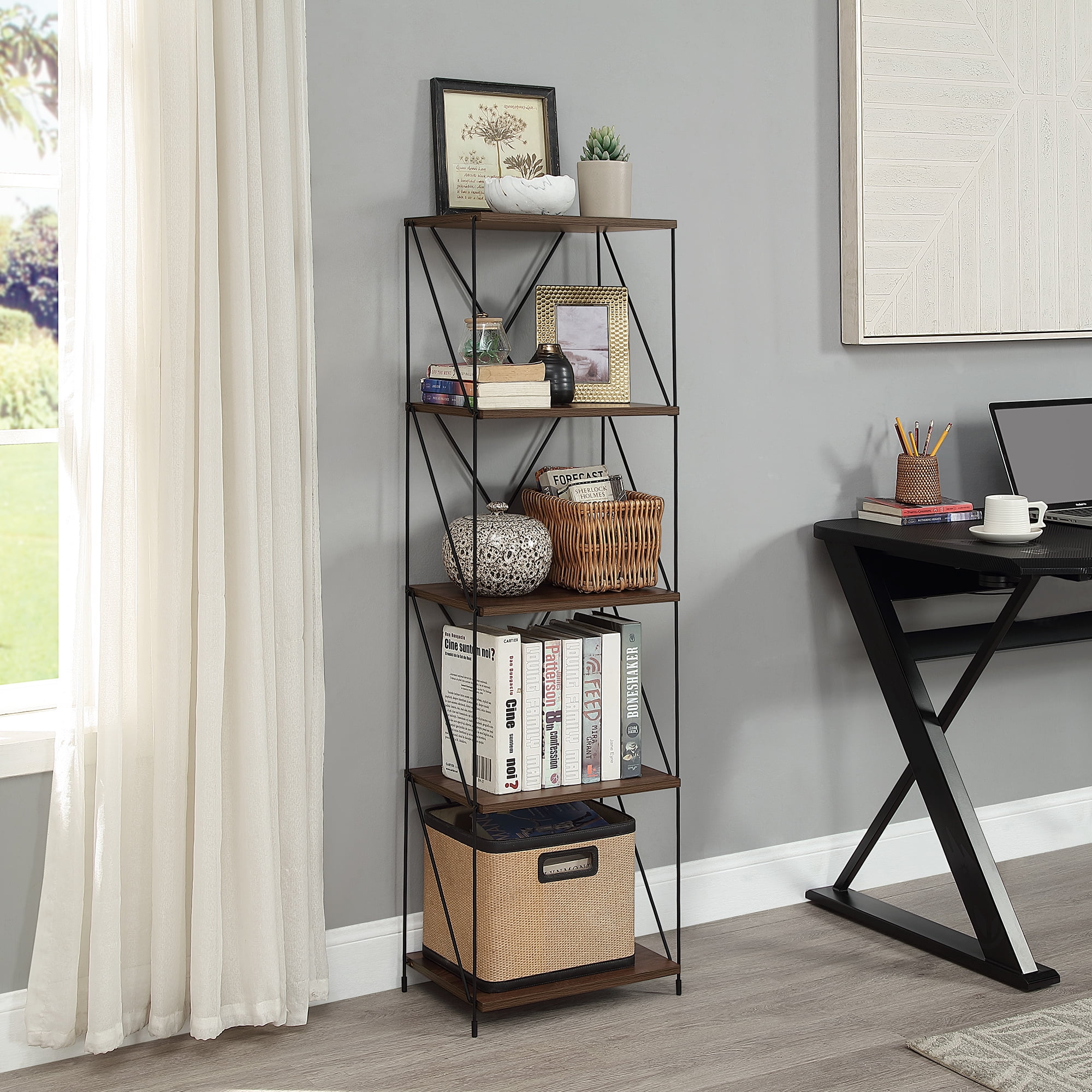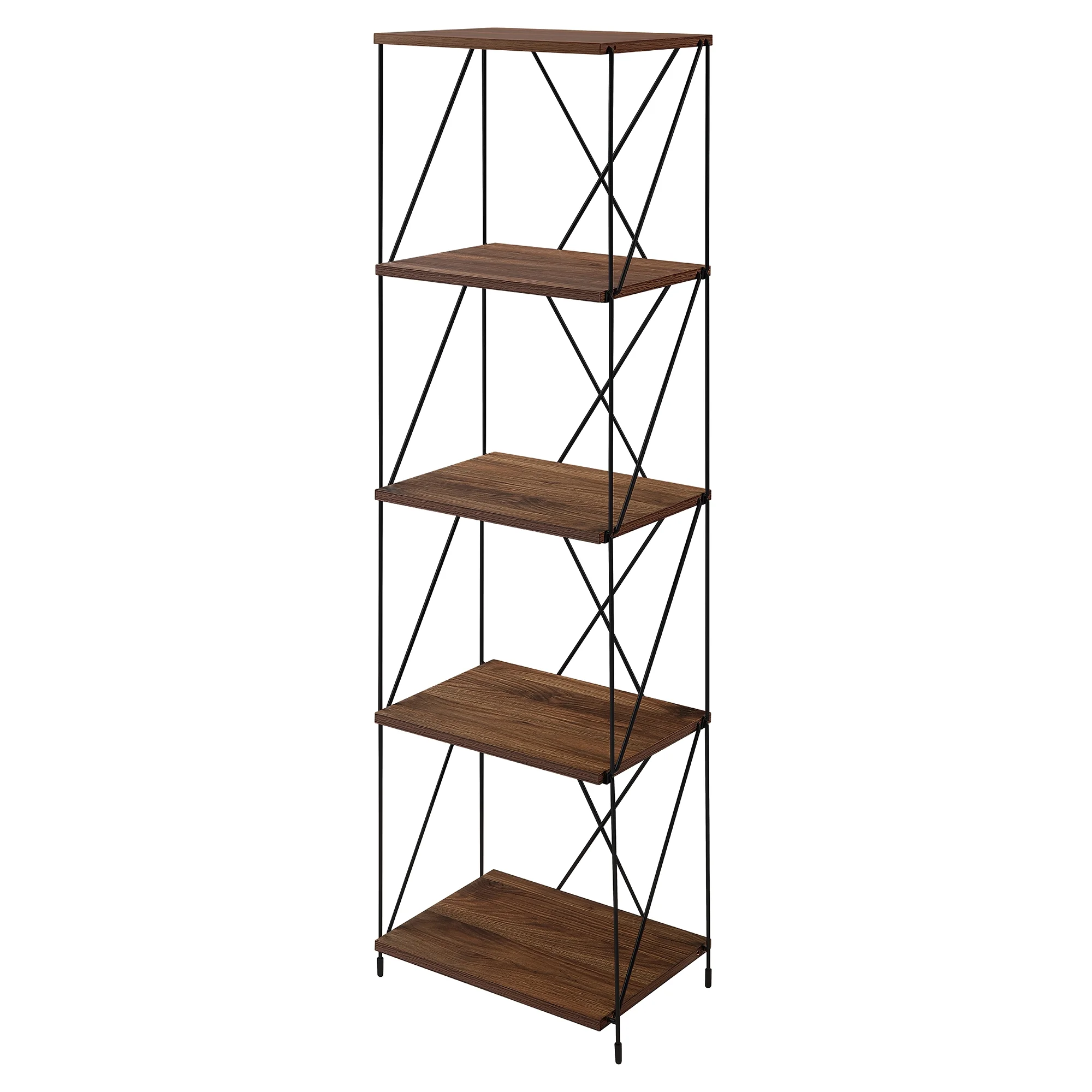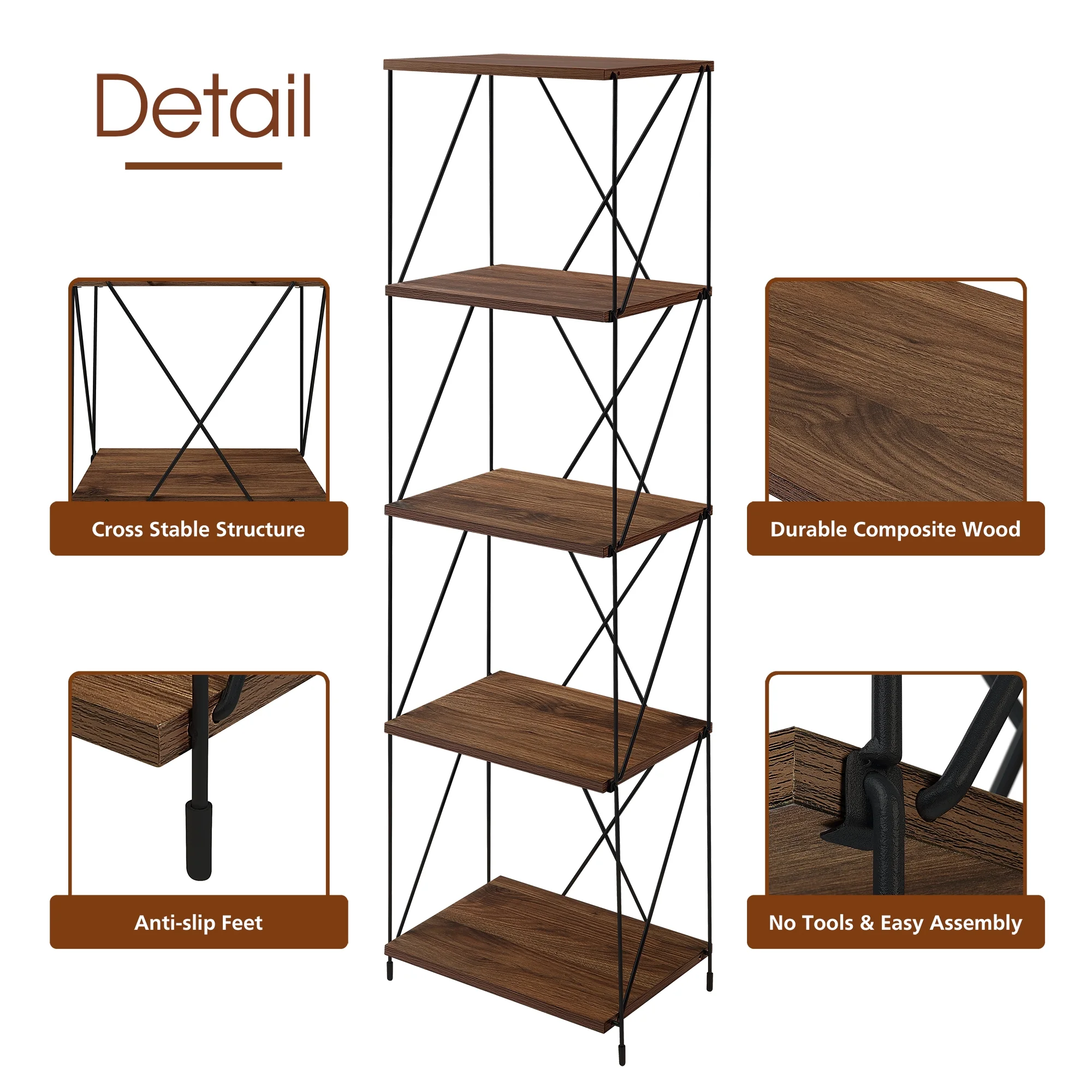Huisenitre 5-Tier Multipurpose Bookcase Walnut Brown Wooden Storage Shelf with Metal Frame, No Tools