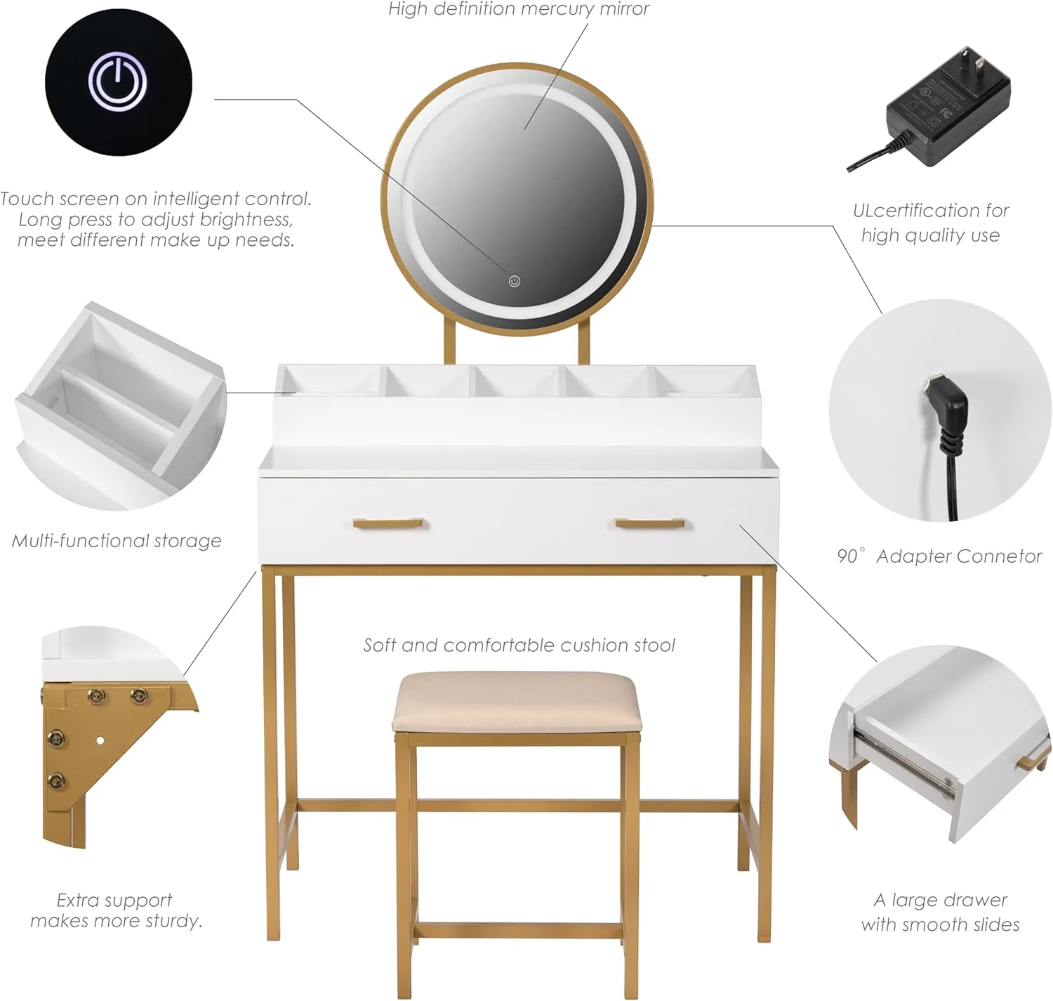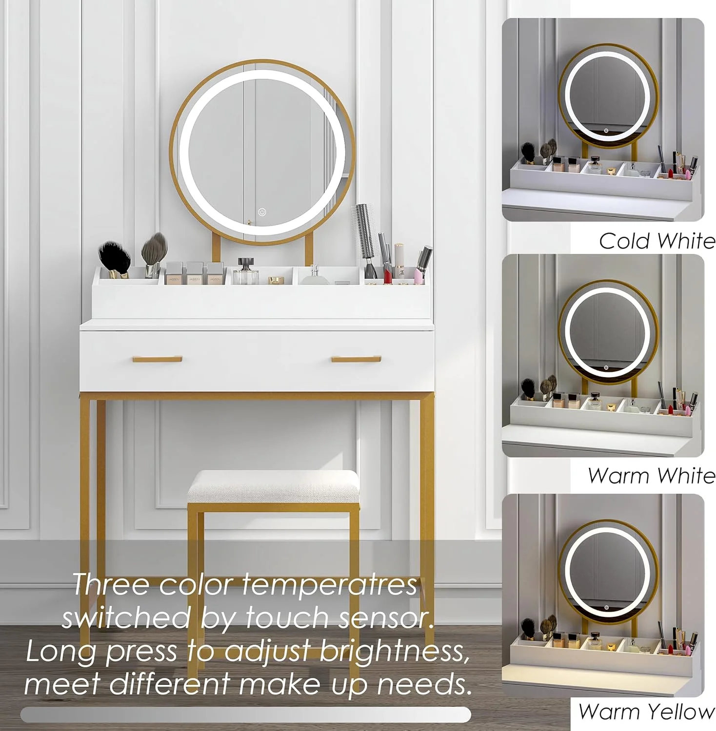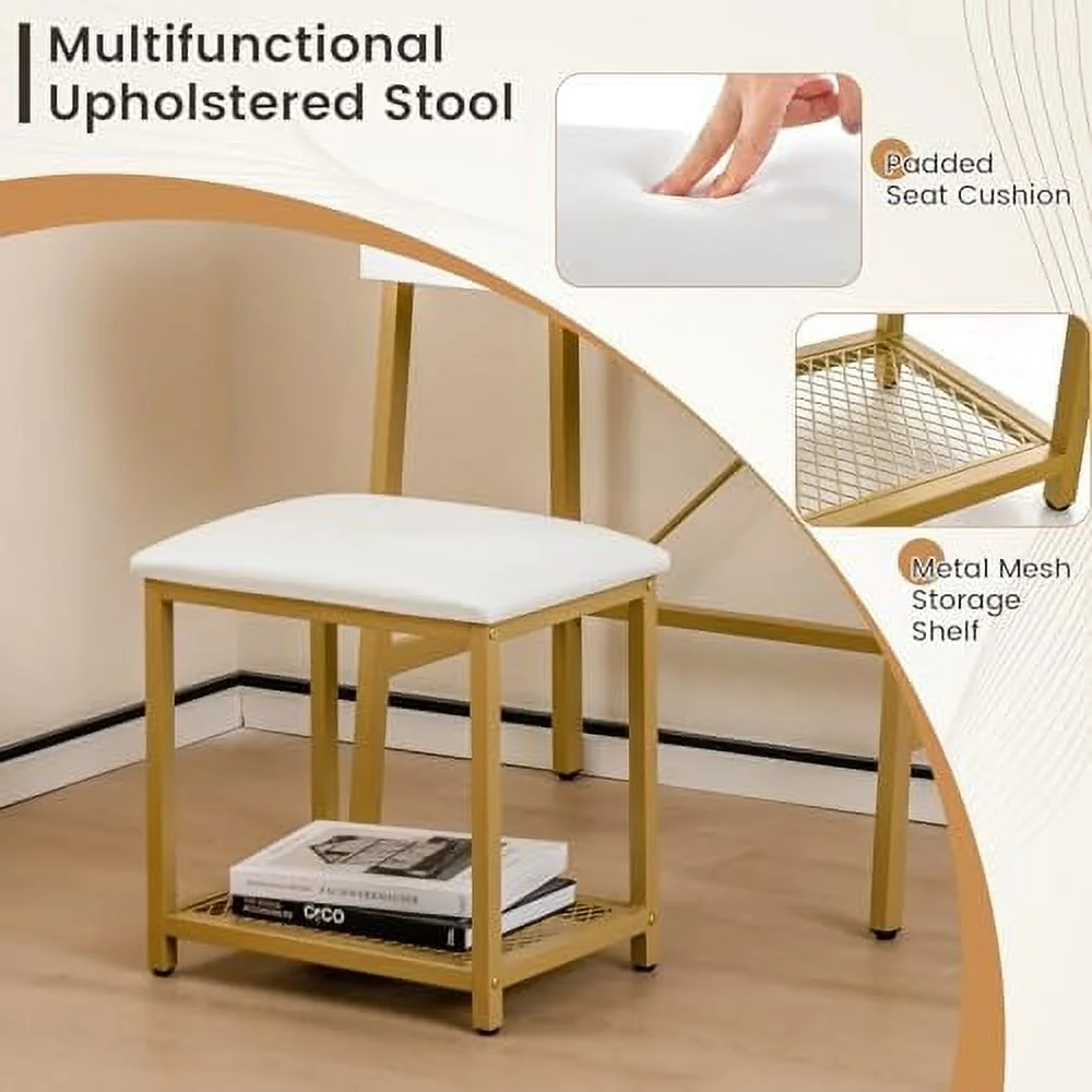 Spirich Home Makeup Vanity Desk with Mirror and Lights, Makeup Vanity Set with Drawers, Small Makeup Vanity Table, 3 Lighting Modes Dresser Desk and Cushioned Stool Set for Bedroom White