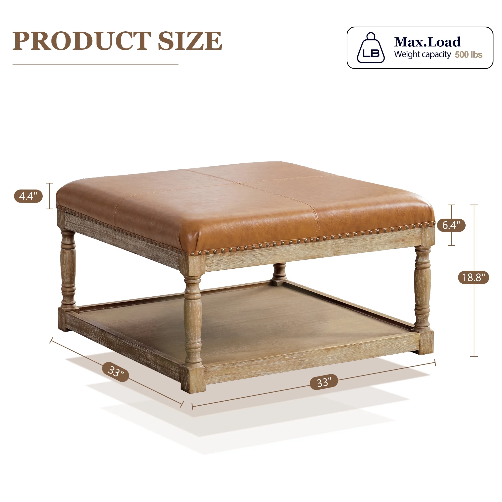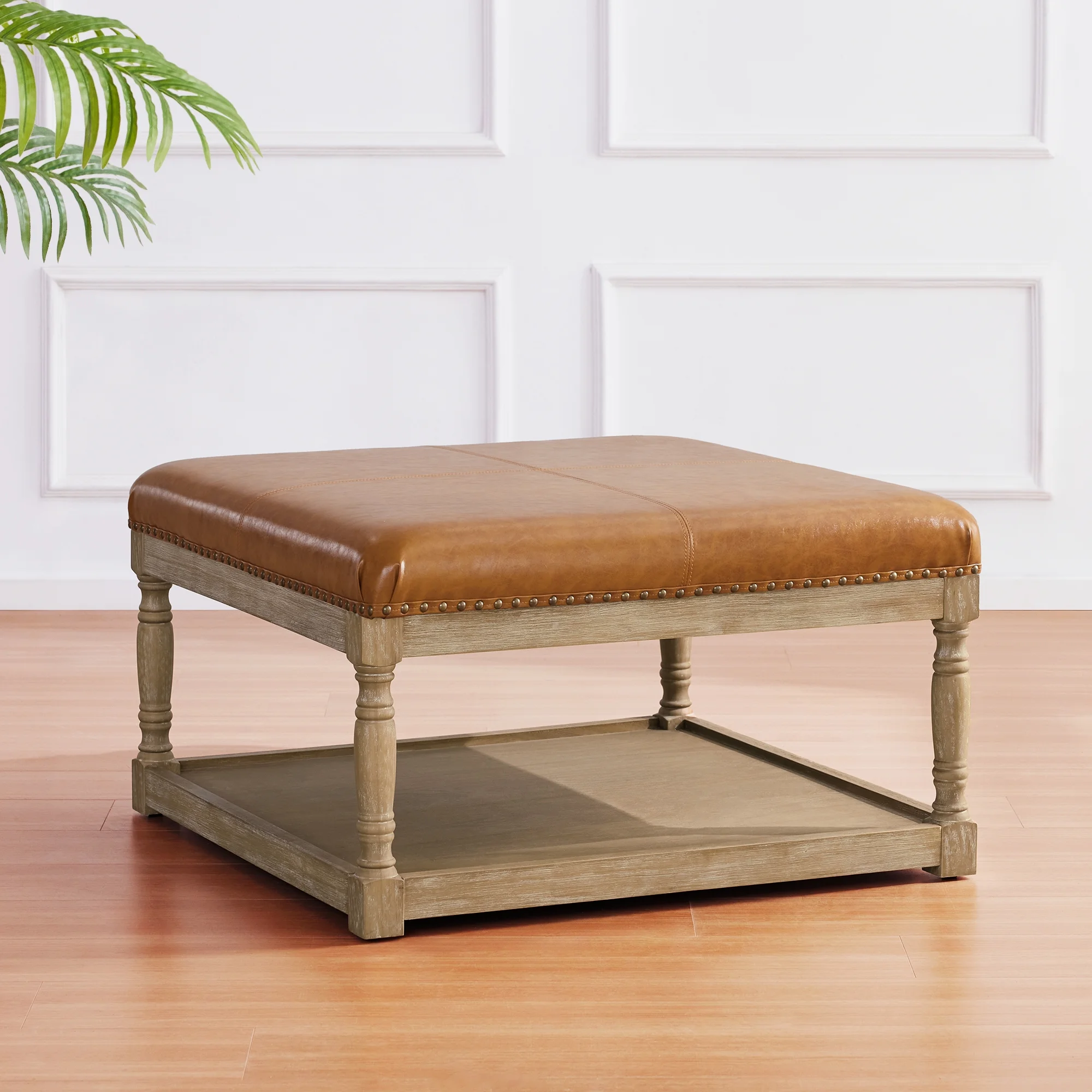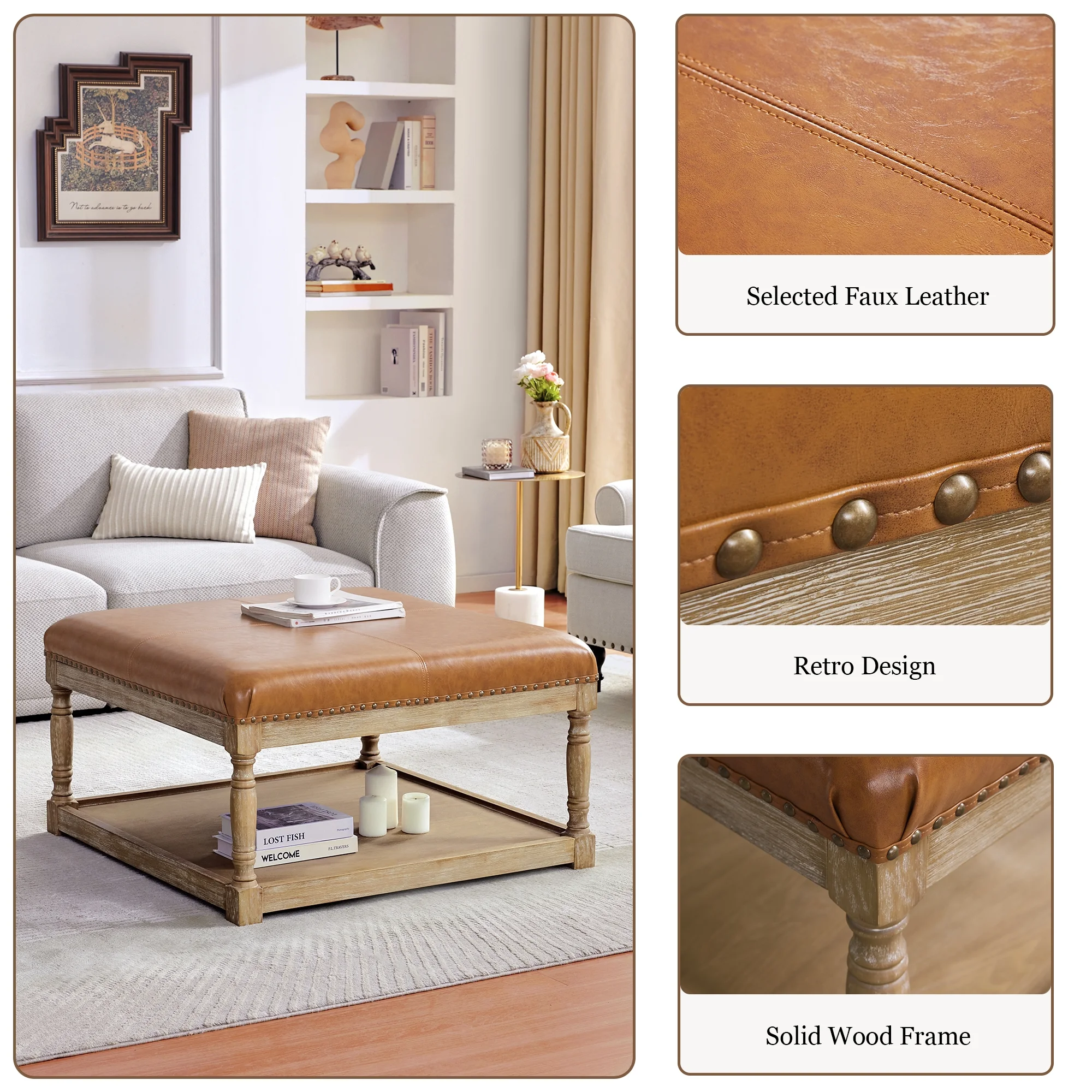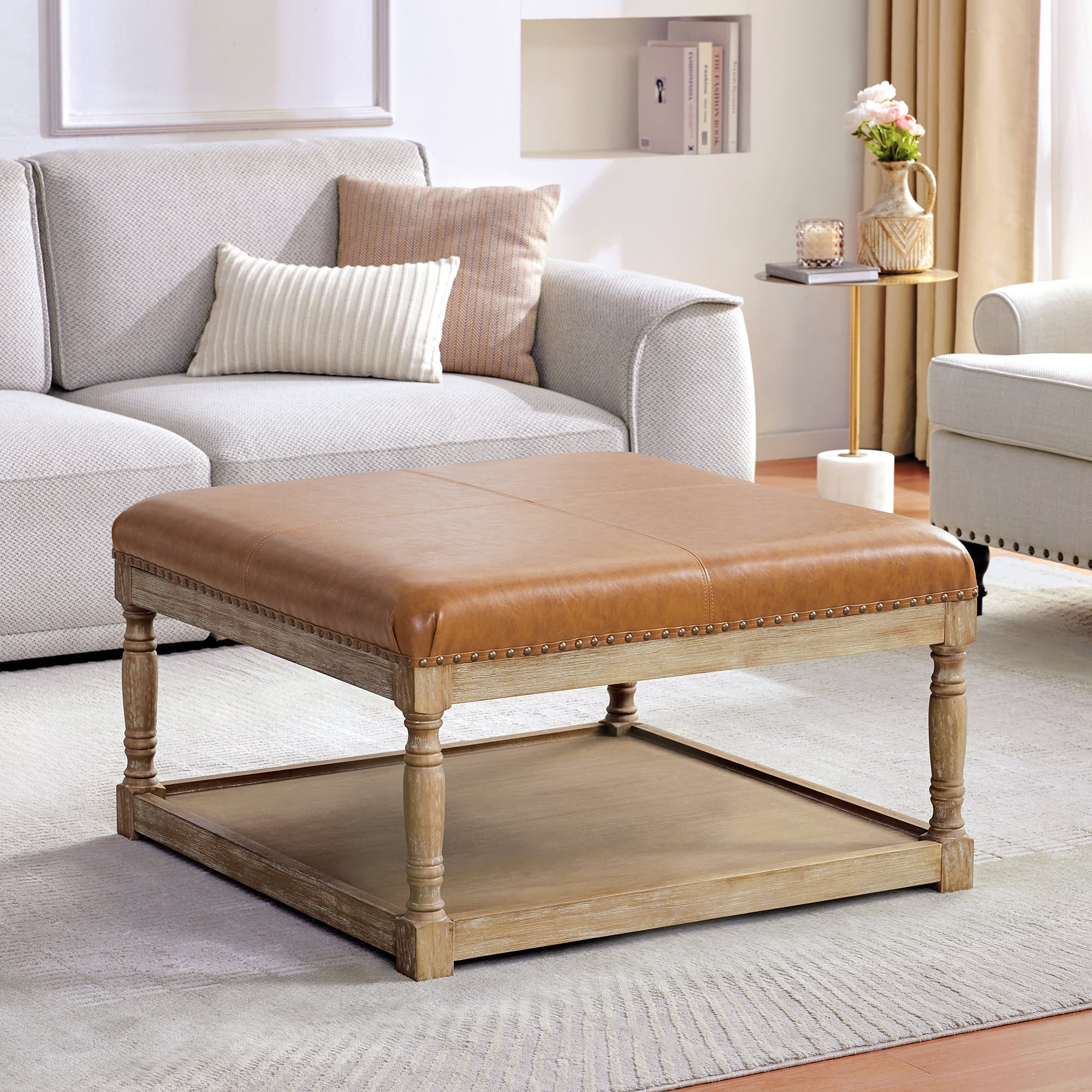 HUIMO Large Square Ottoman Coffee Table for Living Room, Upholstered Tufted Faux Leather Footrest Storage Ottoman with Solid Wood Shelf, Footrest Stool (Brown)