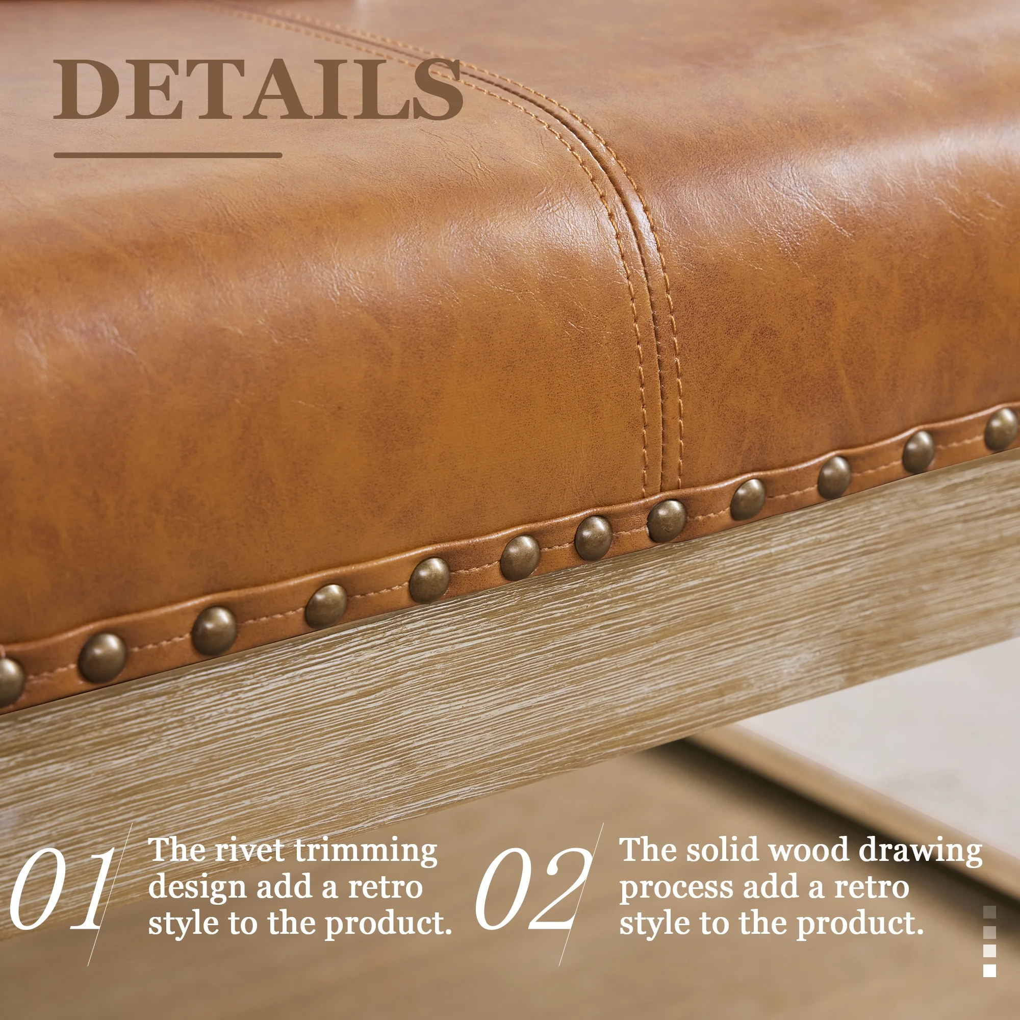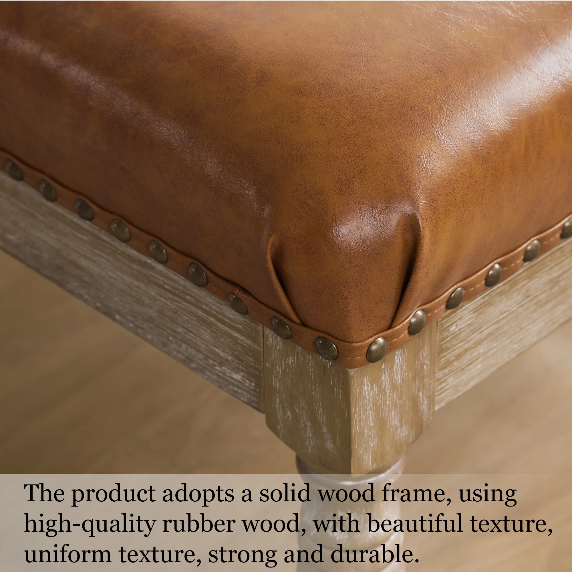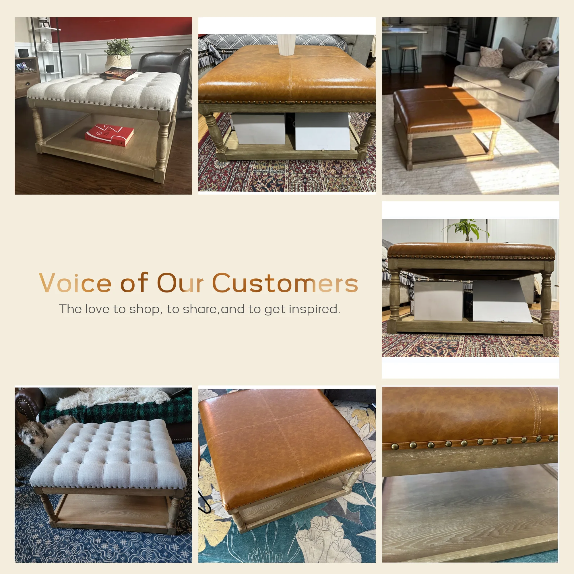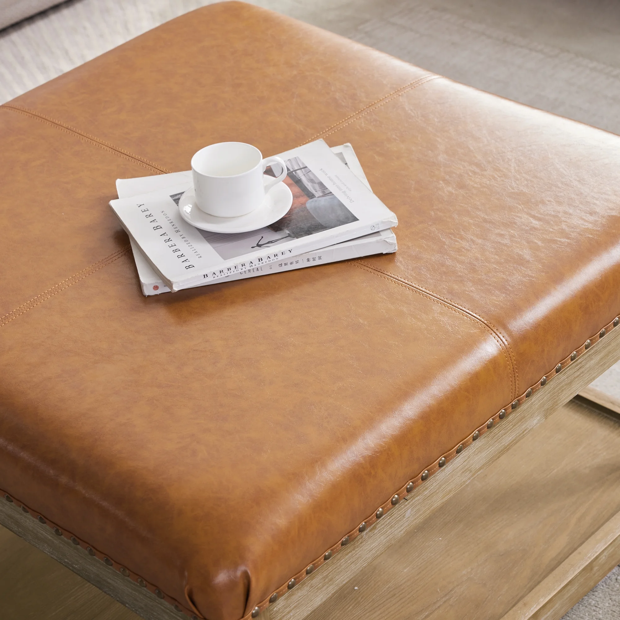 HUIMO Large Square Ottoman Coffee Table for Living Room, Upholstered Tufted Faux Leather Footrest Storage Ottoman with Solid Wood Shelf, Footrest Stool (Brown)