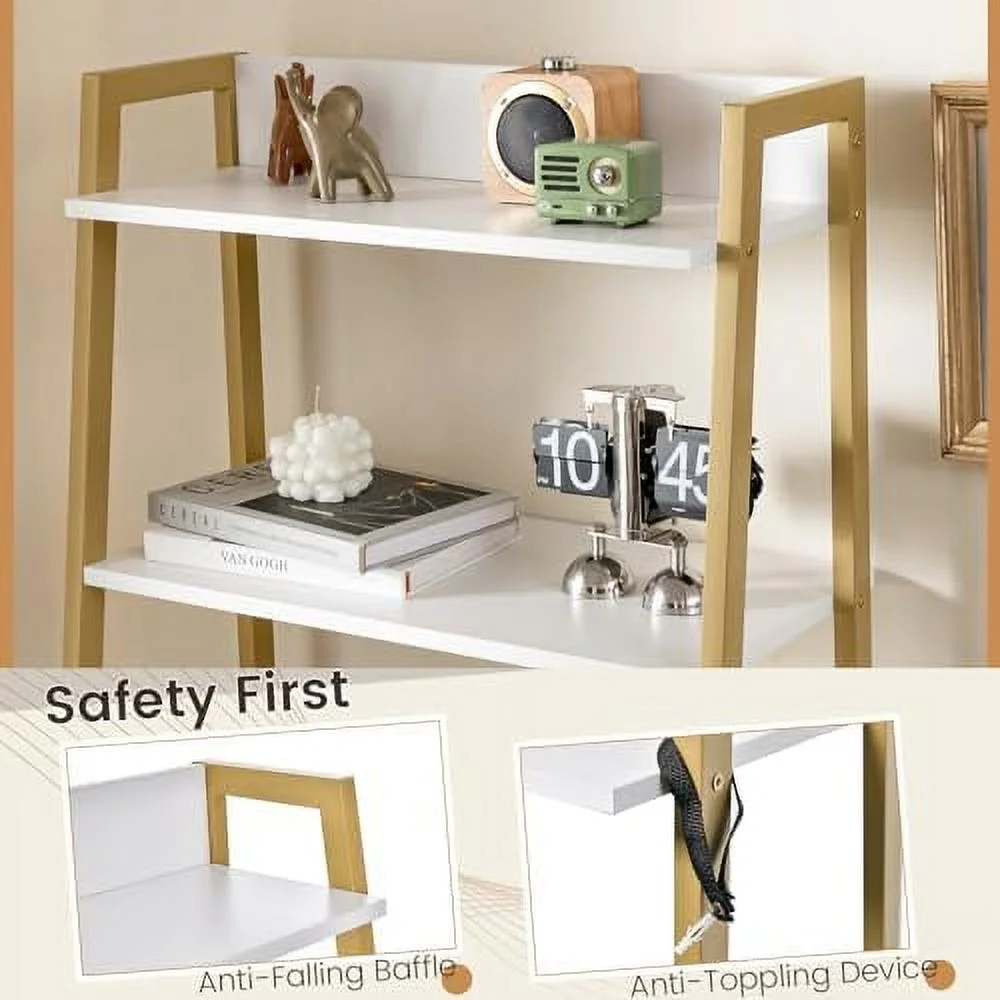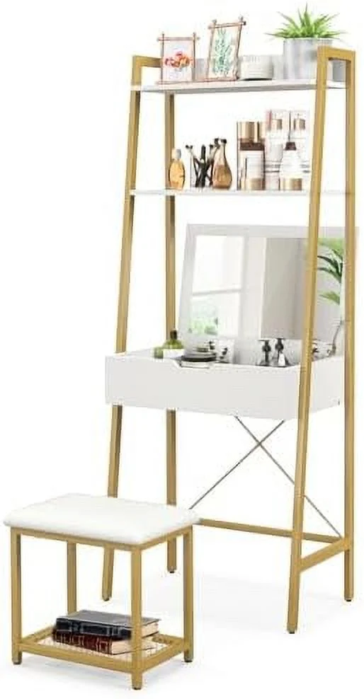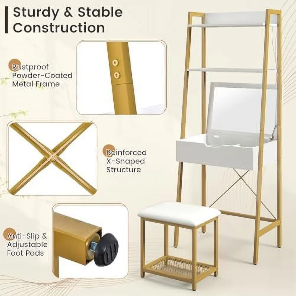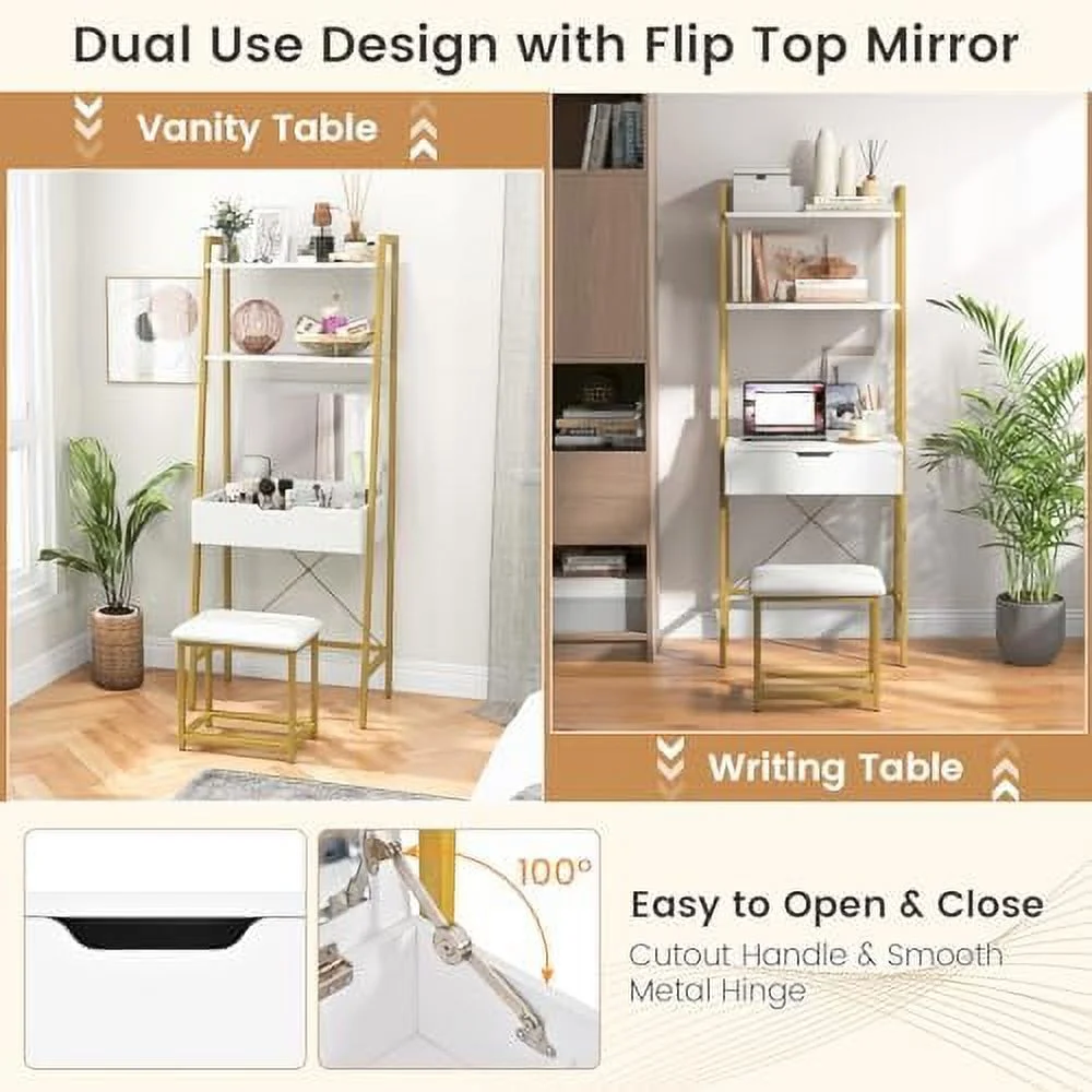 Vanity Table Set with Flip Top Mirror Ladder Vanity Desk and Cushioned Stool Set with Shelves and Hidden Compartments Makeup Dressing Table Set for Bedroom Small Spaces Black+Brown