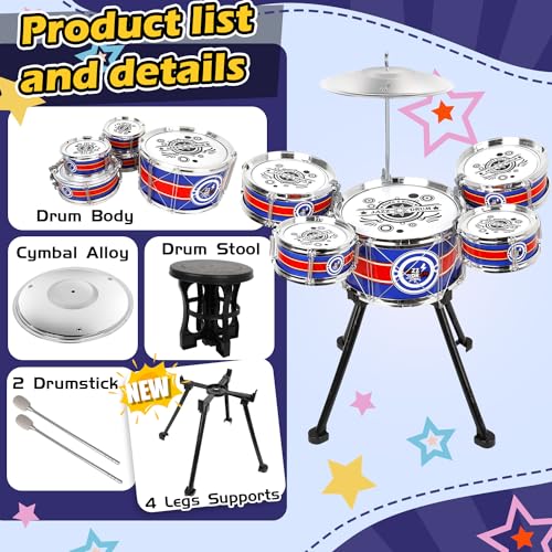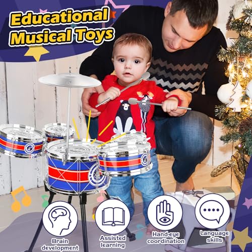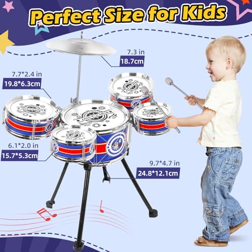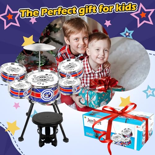 Toy Drum Set for Toddlers Upgrade Drums Kit Kids Jazz Drum Set with Stool, 5 Drums Percussion Musical Instruments Toys for 3 4 5 Year Old Boys Girls Gifts (Blue)