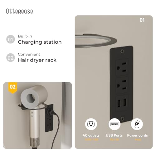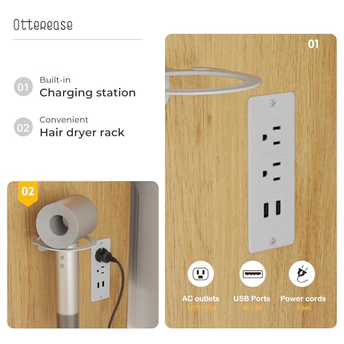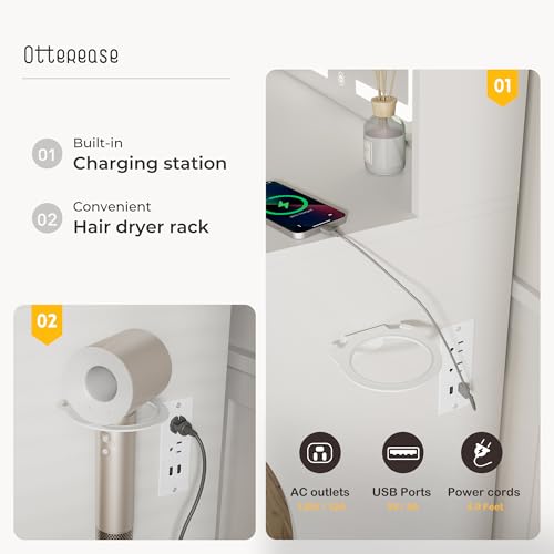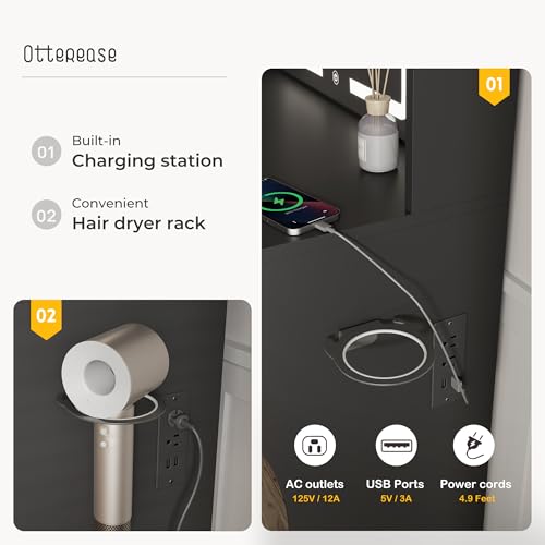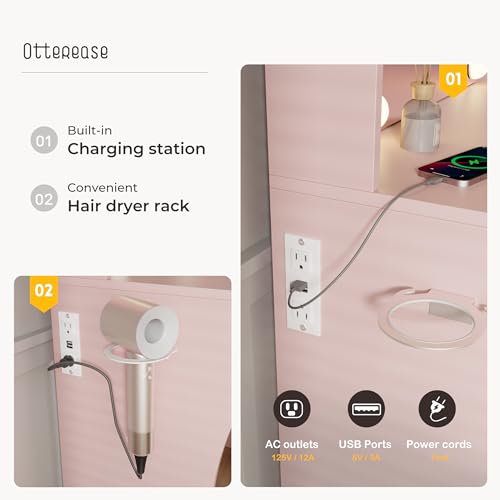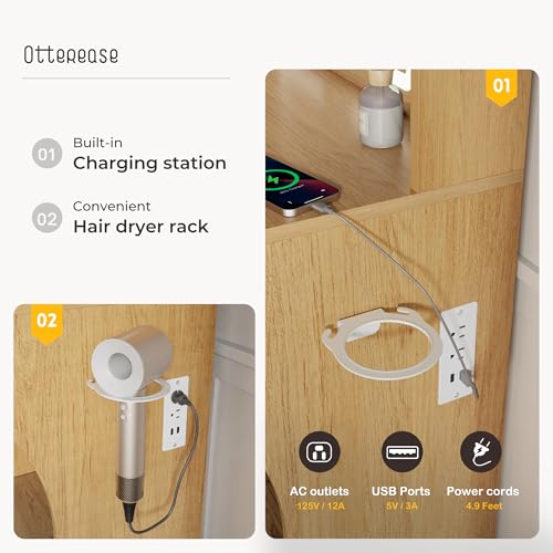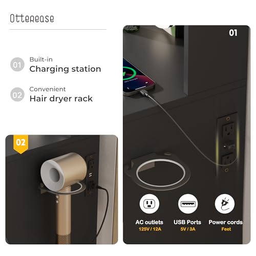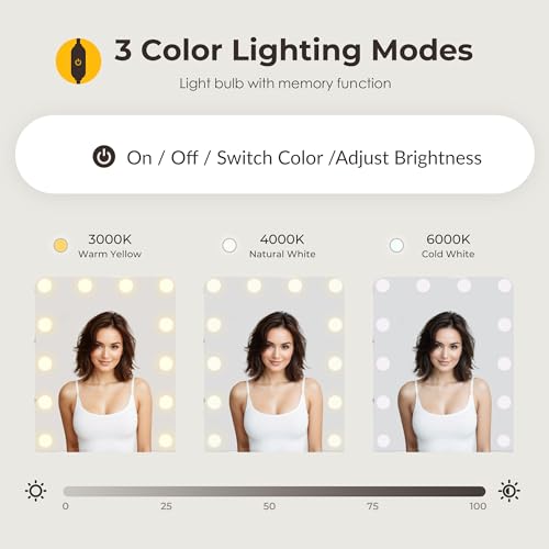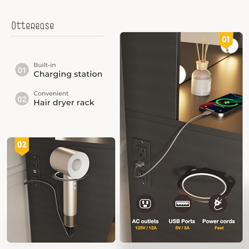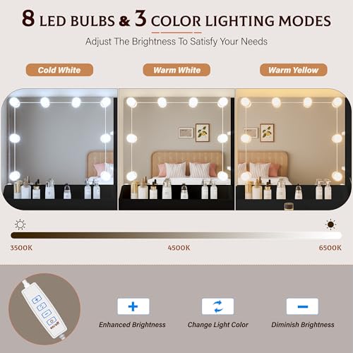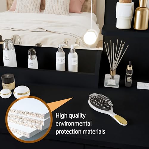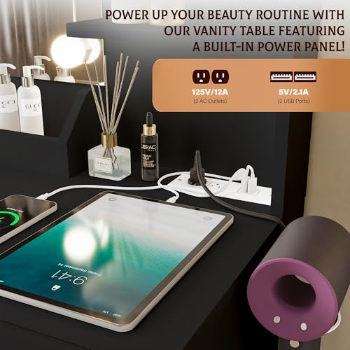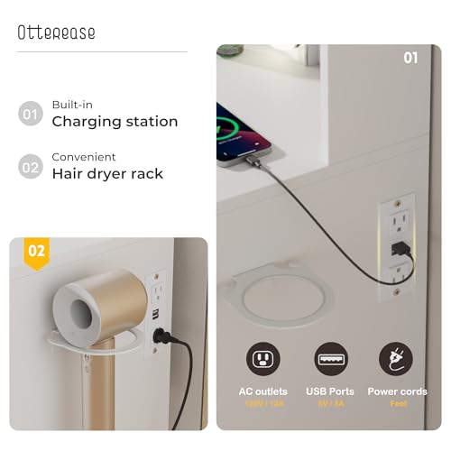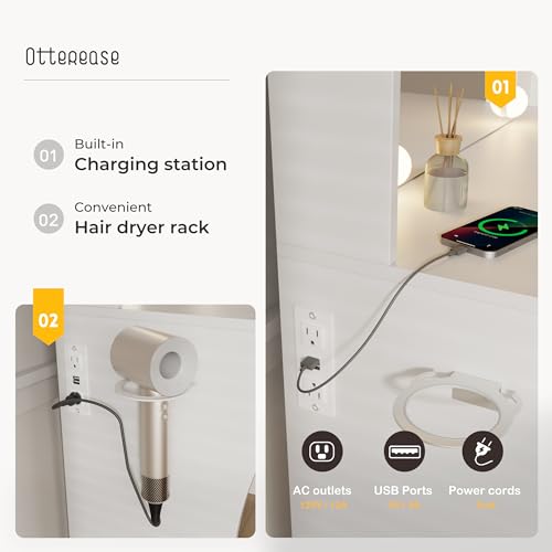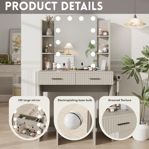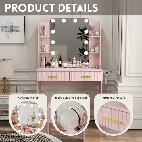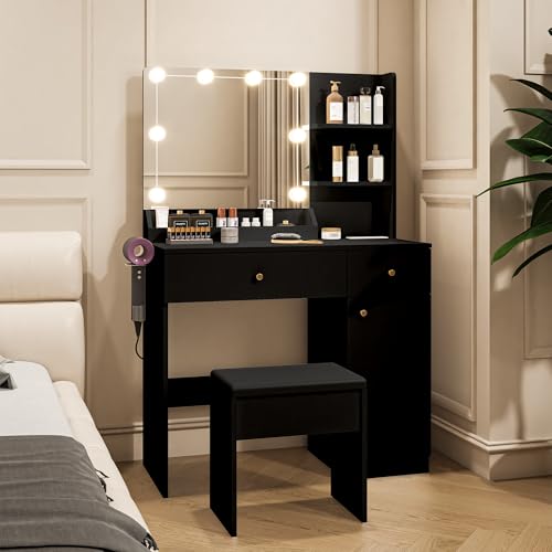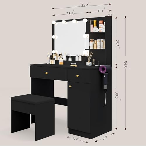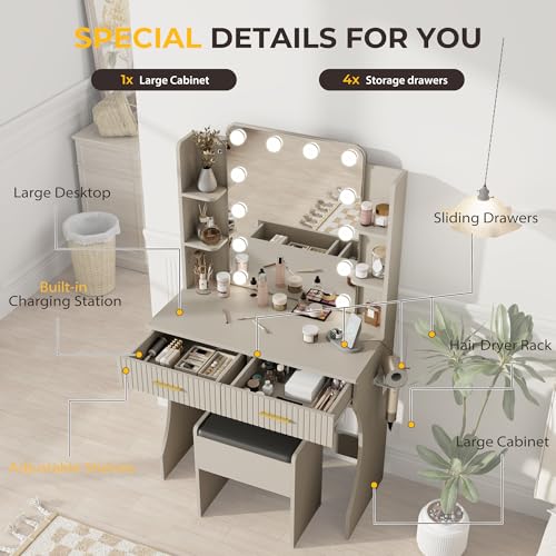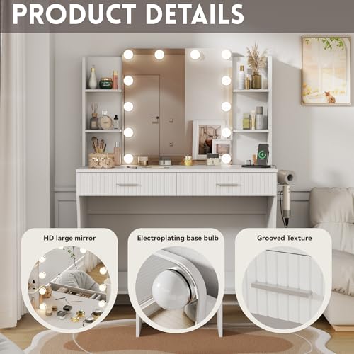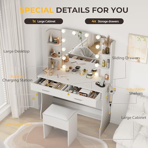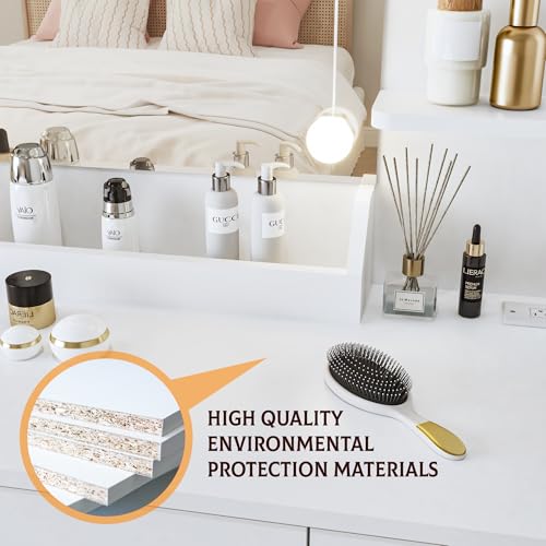 Vanity Desk with Mirror and Lights Dimmable LED Makeup Table with Drawers Side Cabinet 3 Storage Shelves Power Outlet Dressing Table Set Include Holder Cushioned Stool for Bedroom(White)