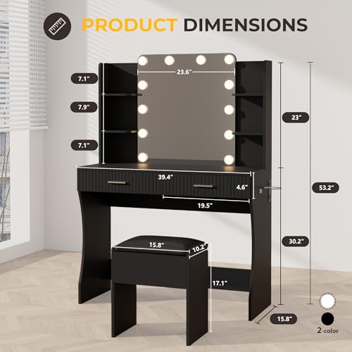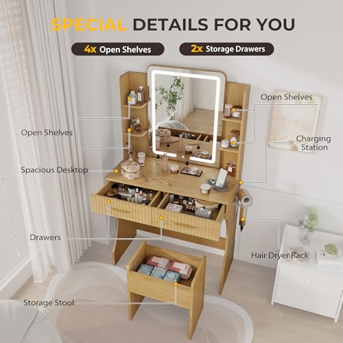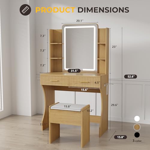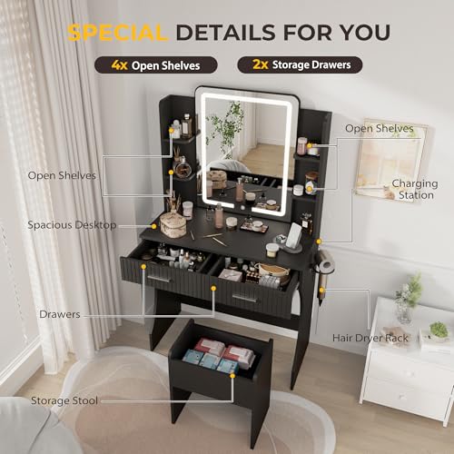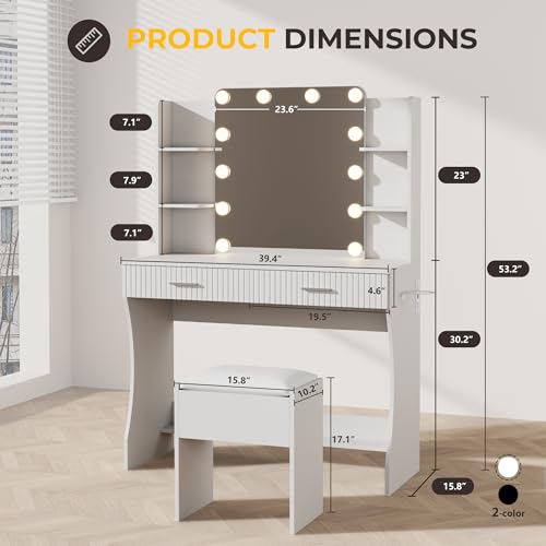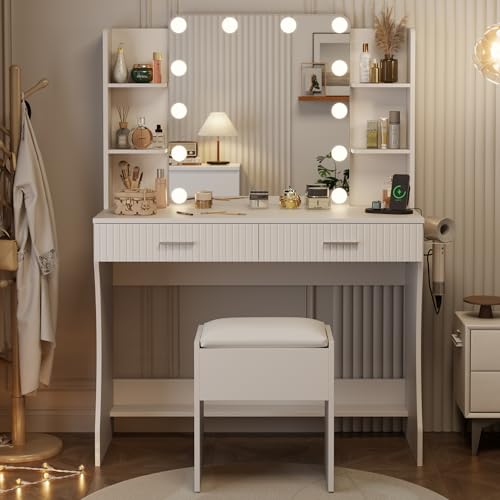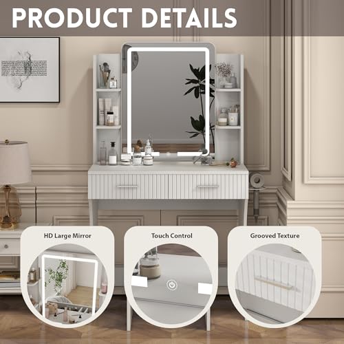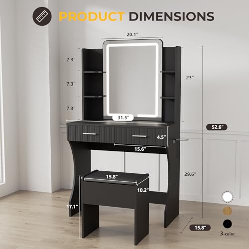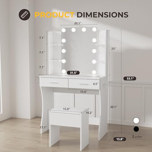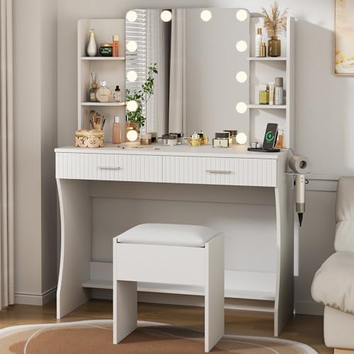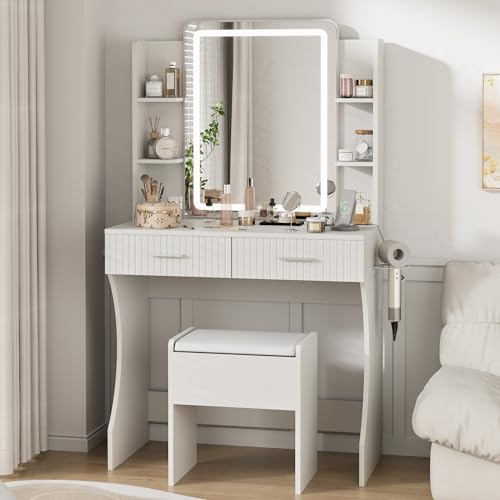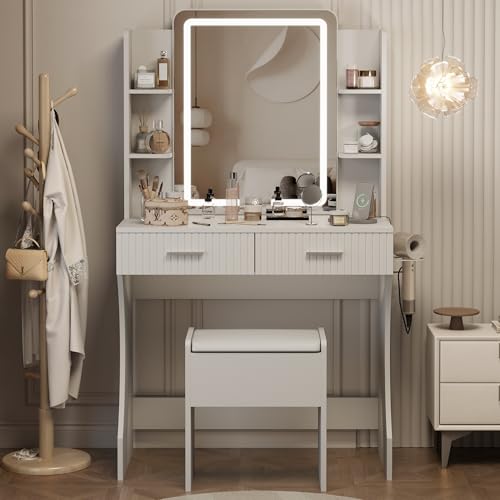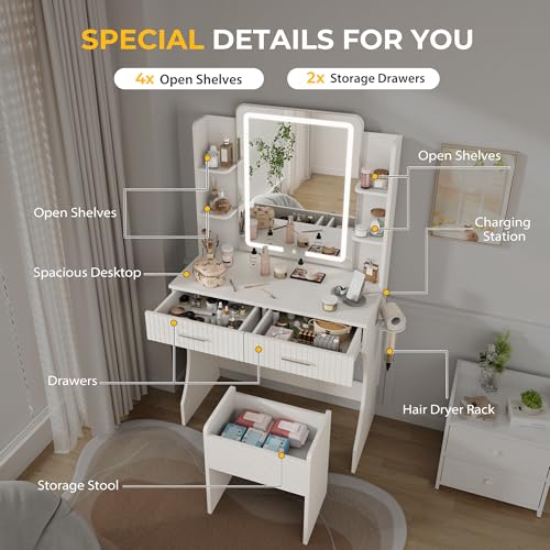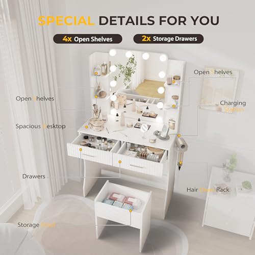 Vanity Desk with LED Lighted Mirror, Makeup Vanity with 3 Adjustable Lights, 2 Large Drawers and 4 Open Shelves, White Vanity with Storage Stool for Bedroom