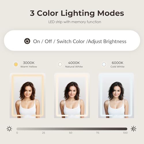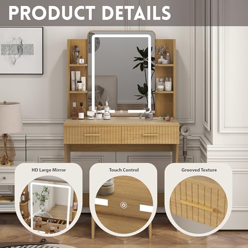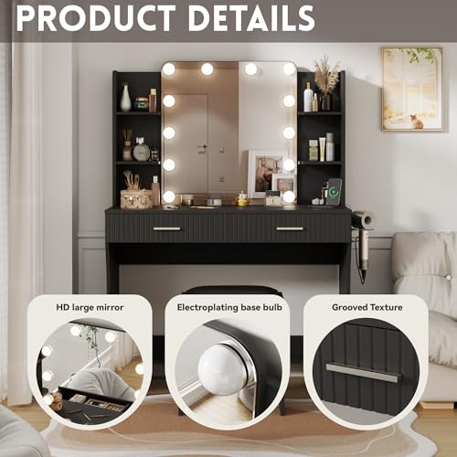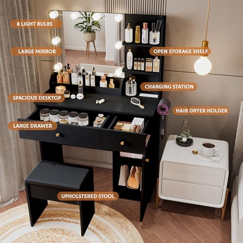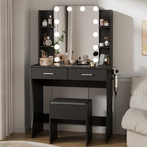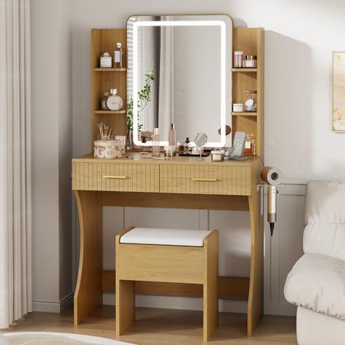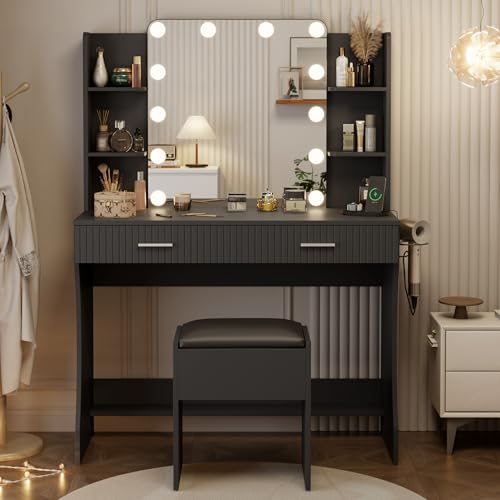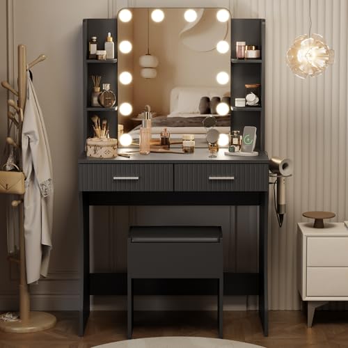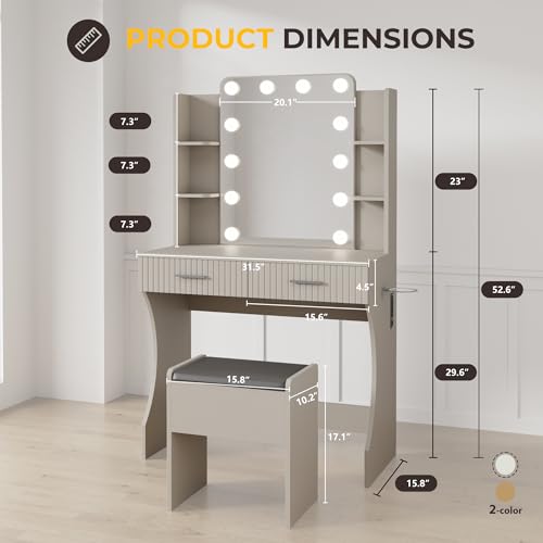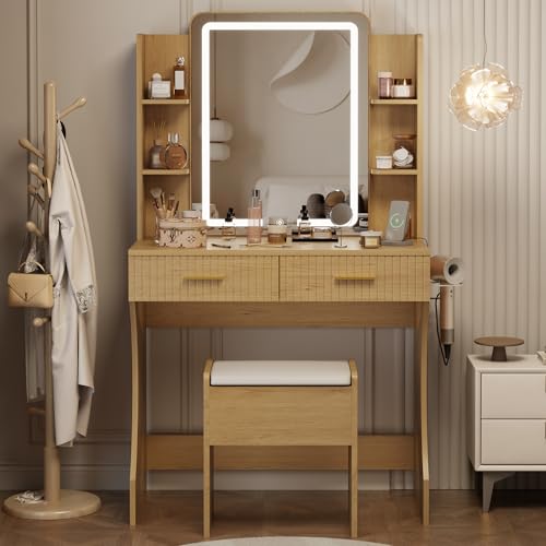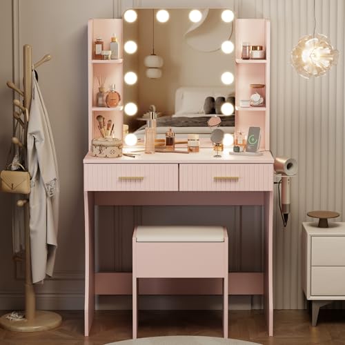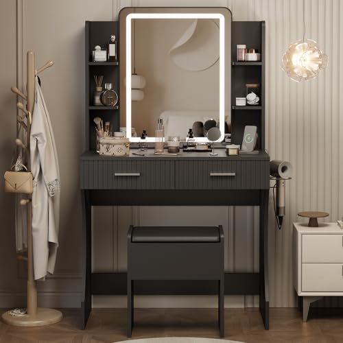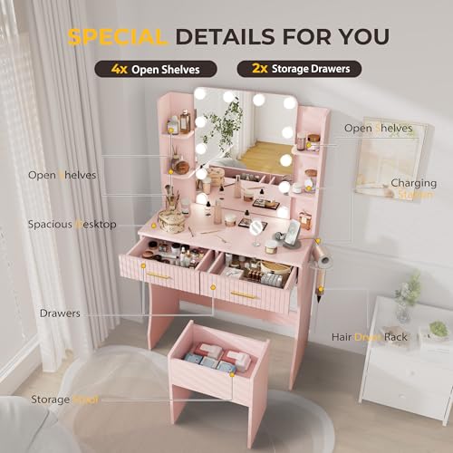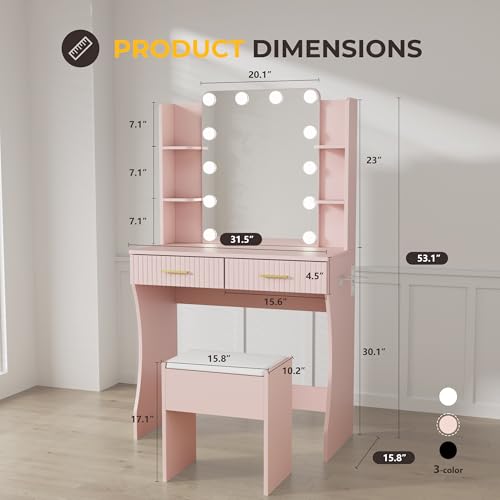 Vanity Desk with LED Lighted Mirror, Makeup Vanity with 3 Adjustable Lights, 2 Large Drawers and 4 Open Shelves, White Vanity with Storage Stool for Bedroom