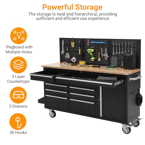 61inch Rolling Tool Chest, Garage Workbench Storage Tool Cabinet 10 with Drawers, Solid Rubber Wood Top with Power Strip, LBS Load Mobile Workstation, Heavy Duty Rolling Cabinet