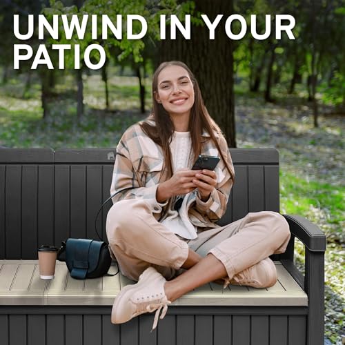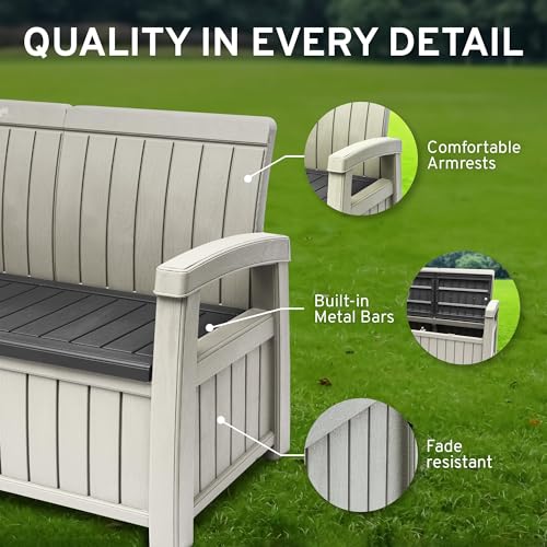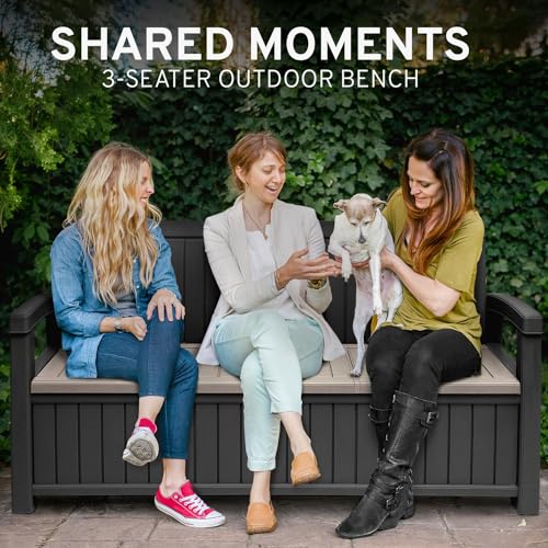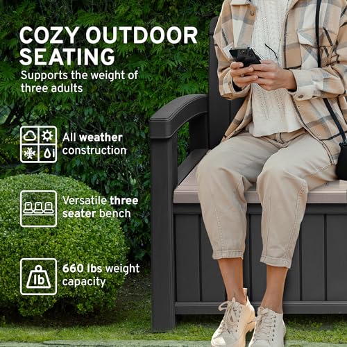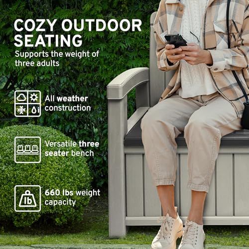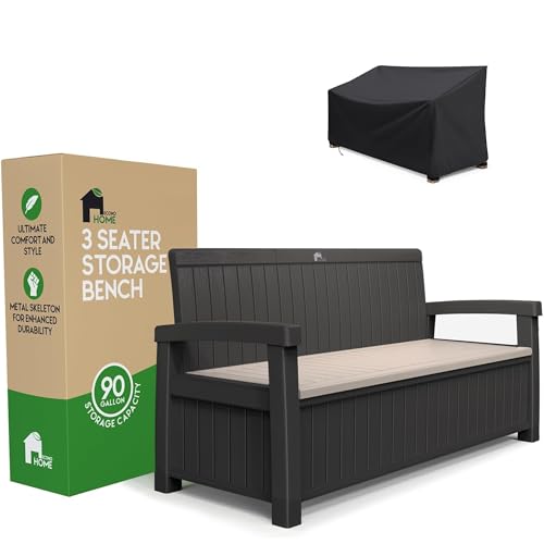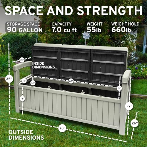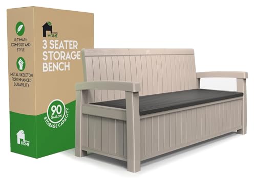 EconoHome 3 Seat Outdoor Storage Bench - 90 Gallon Capacity - Weatherproof Resin Bench for Patio, Porch, Garden, Yard, Pool Area - Furniture for Pool Accessories, Gardening Tools, Toys