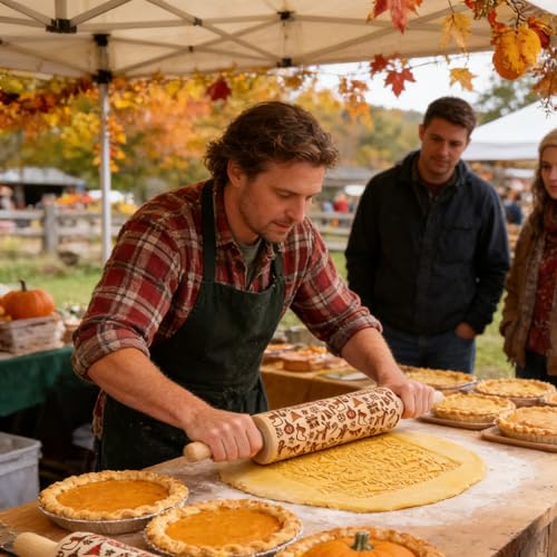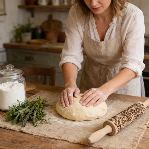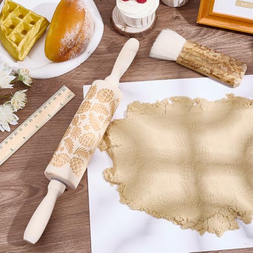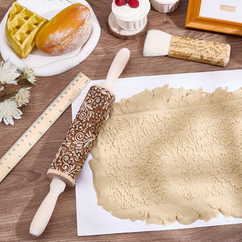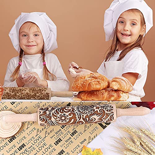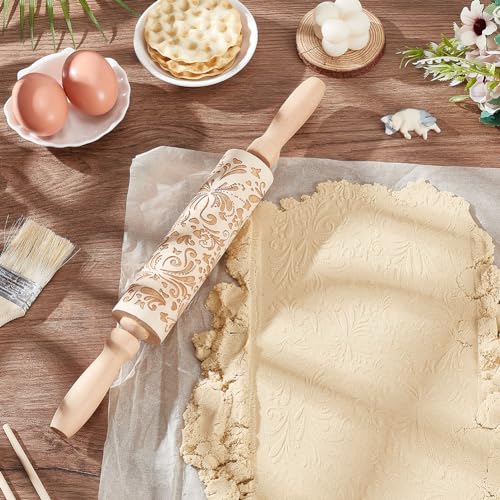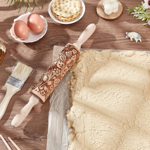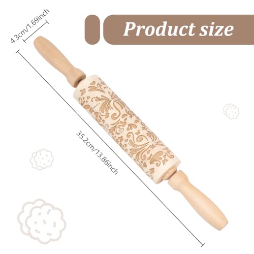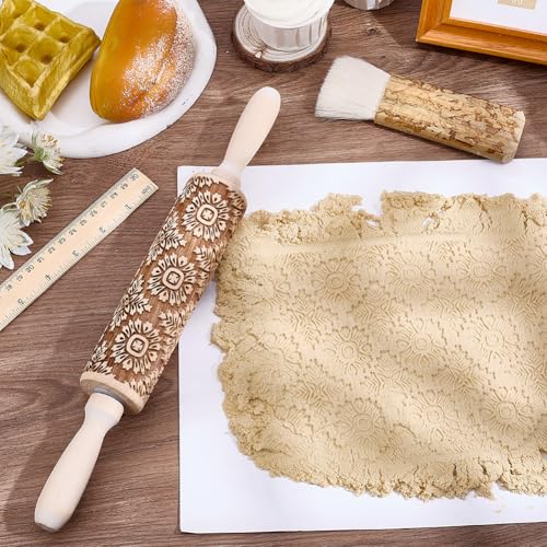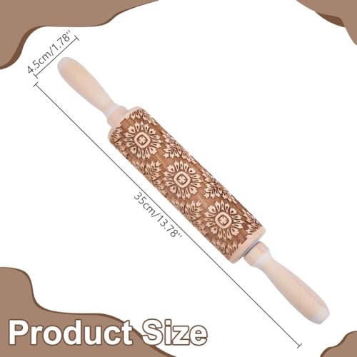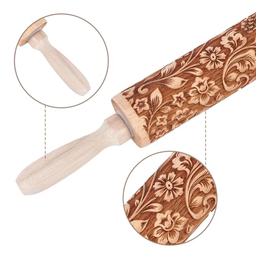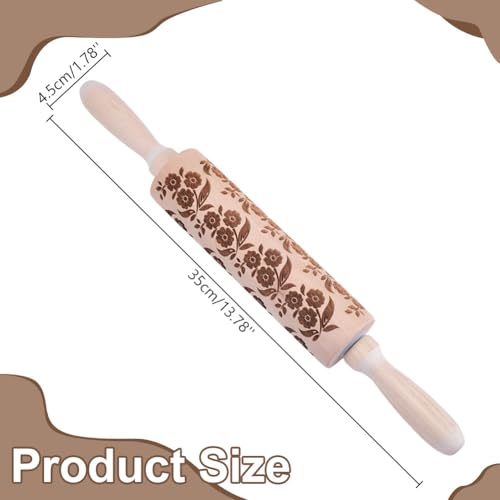 Embossed Wooden Rolling Pin Darker 3D Flower Rattan 35cm Rolling Pin for Thanksgiving Baking Biscuits DIY Kitchen Tool Baking Accessories Homemade Bakery Pastry Cookie Fondant Dough Pizza