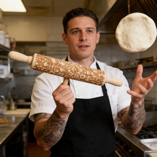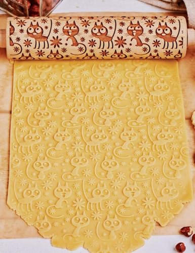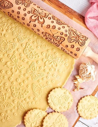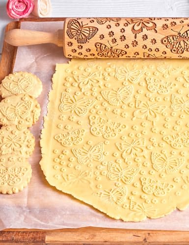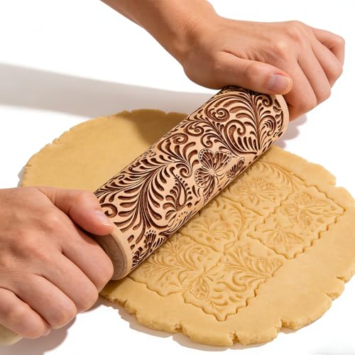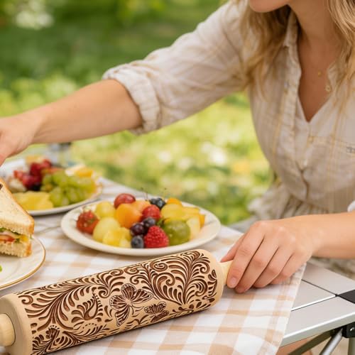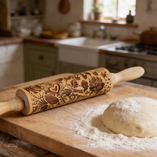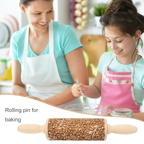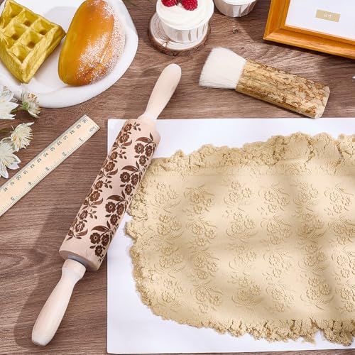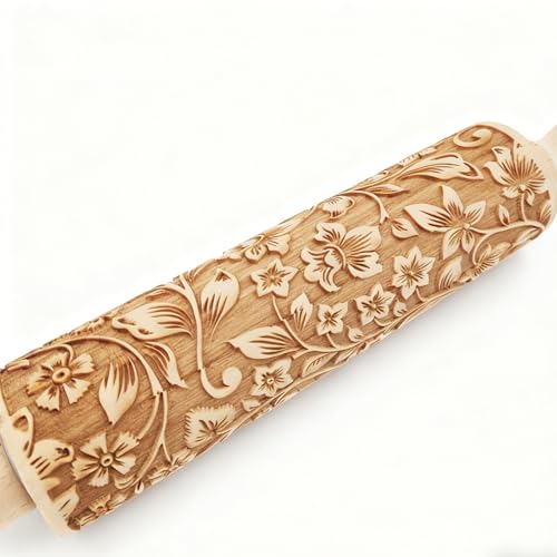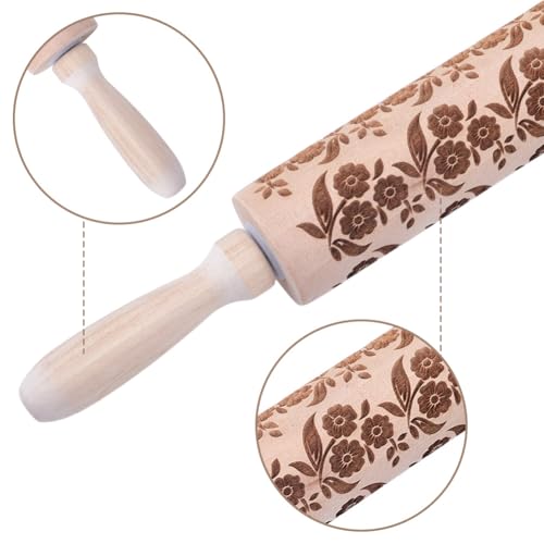 Embossed Wooden Rolling Pin Flower Print 35cm Rolling Pin for Baking Biscuits 3D Pattern DIY Kitchen Tool Baking Accessories Homemade Bakery Pastry Cookie Fondant Dough Pizza