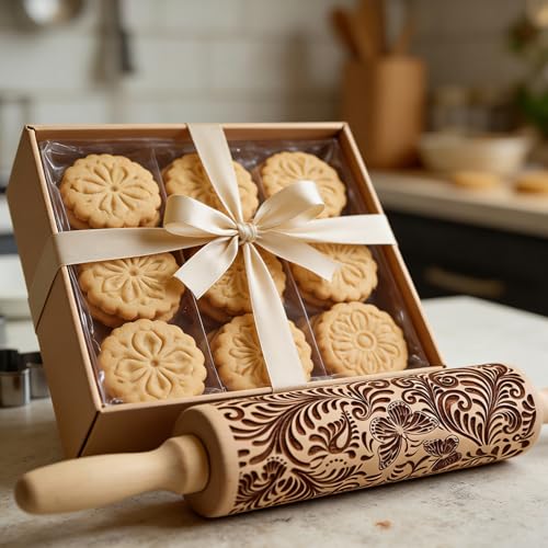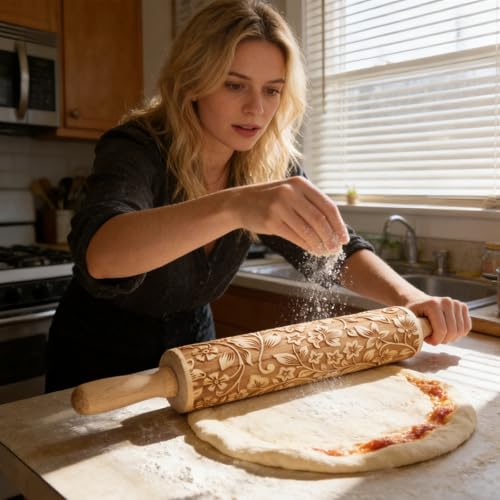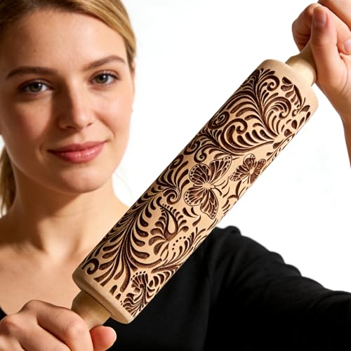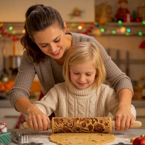 Embossed Wooden Rolling Pin for Baking,Evermarket Deep Engraved Embossing Rolling Pin with Christmas Snowflake Flower Design for Baking Embossed Cookies,Cute Kitchen Decor DIY Tool for Adults