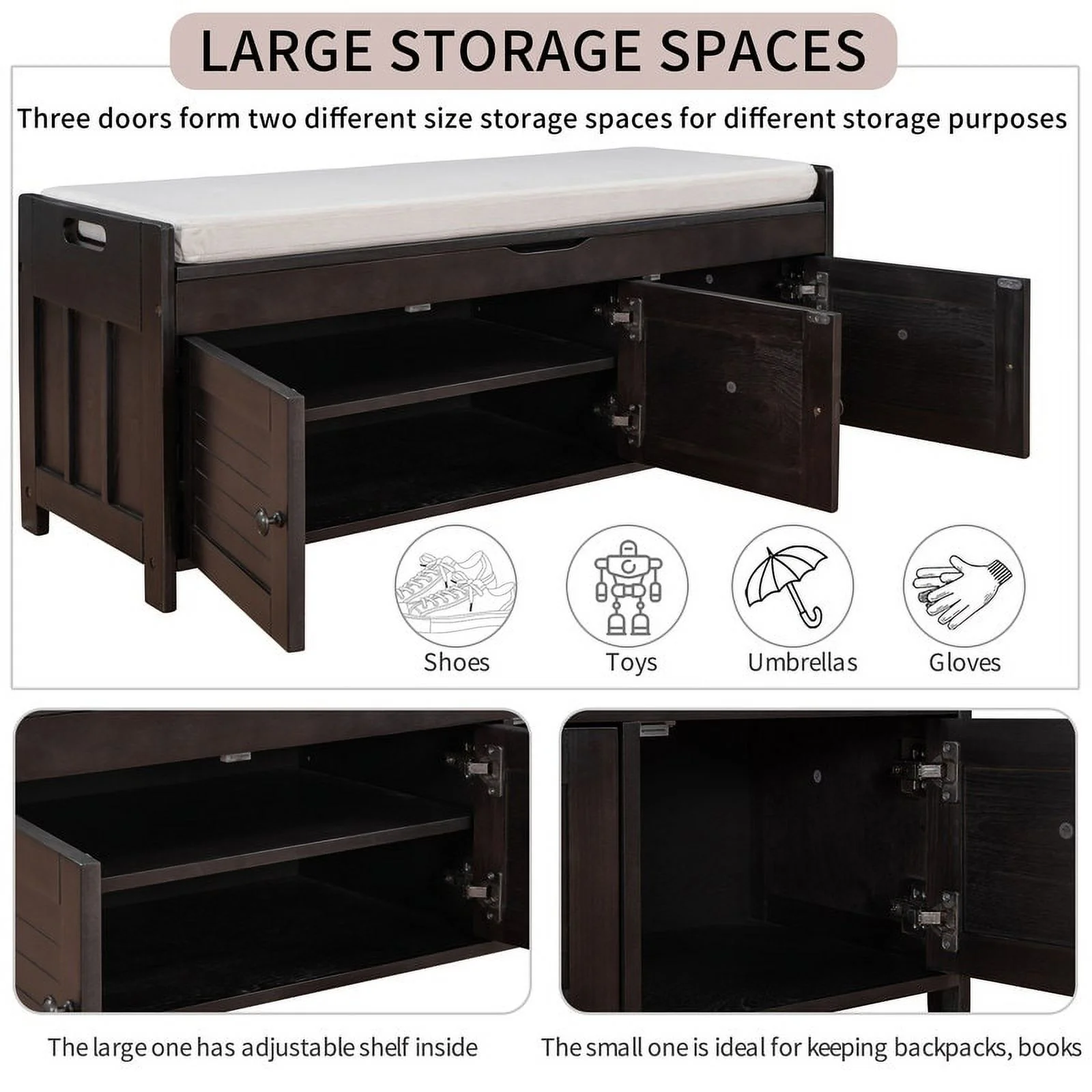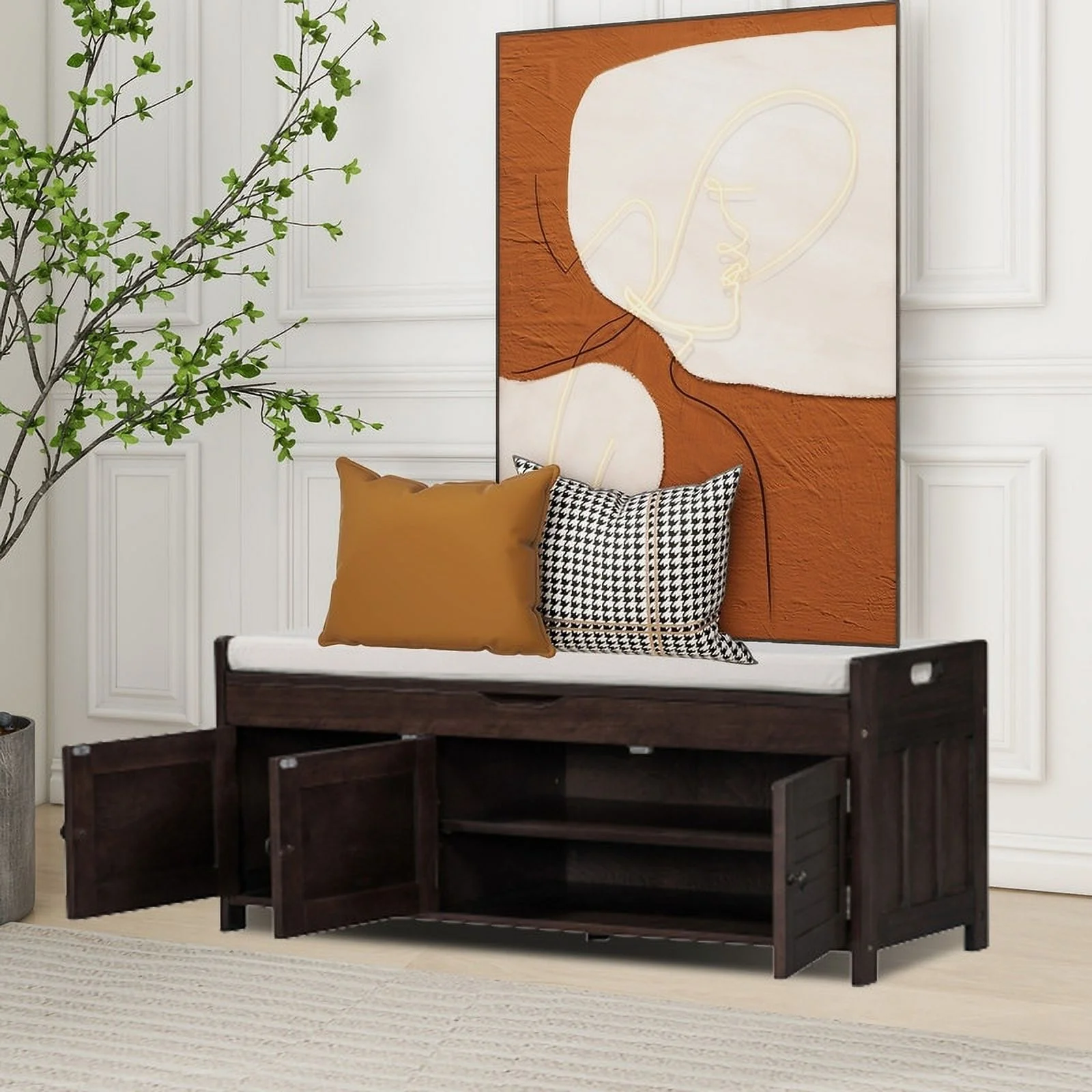 Wooden shoe storage stool with cushioned entrance bench with built-in adjustable shelf and flip top Espresso