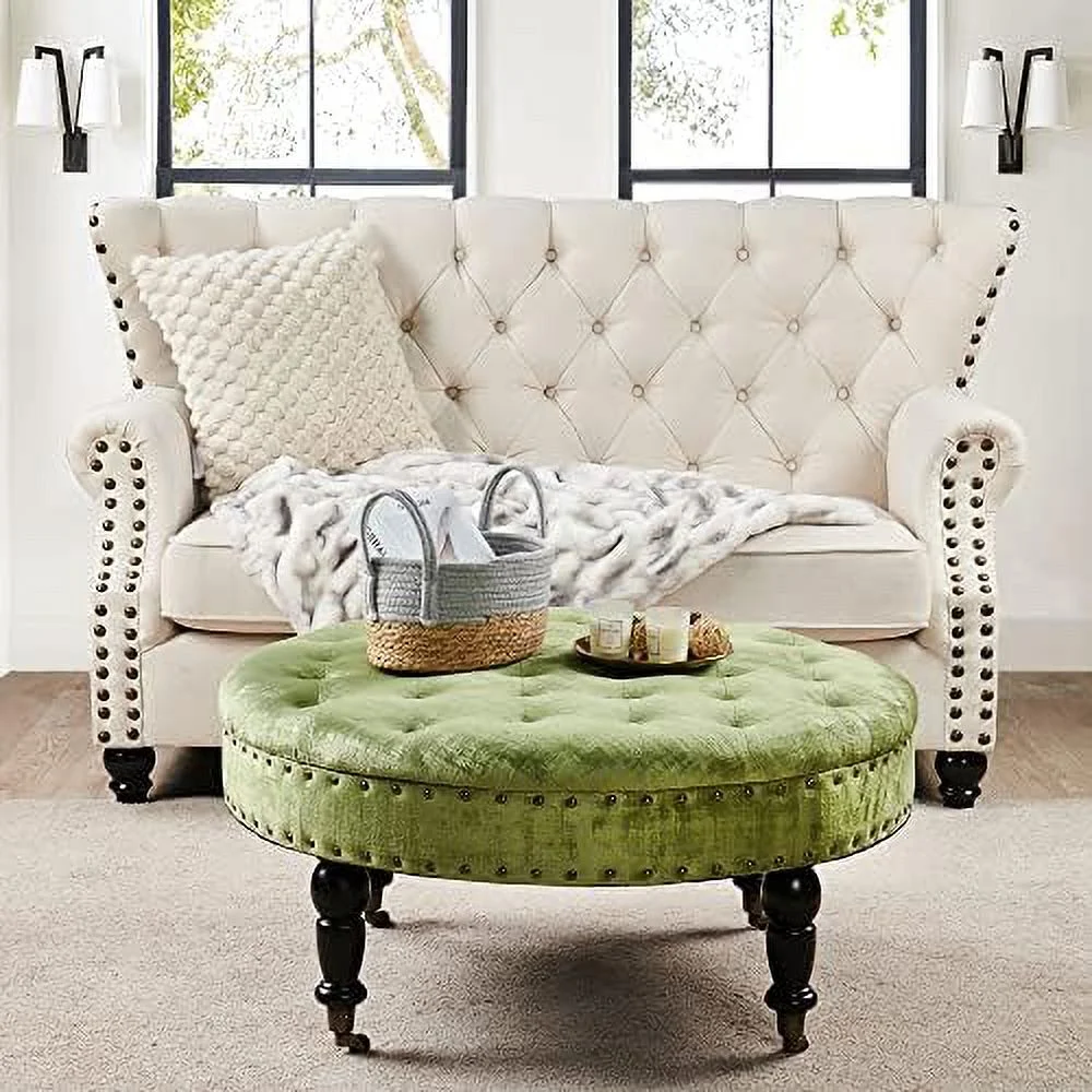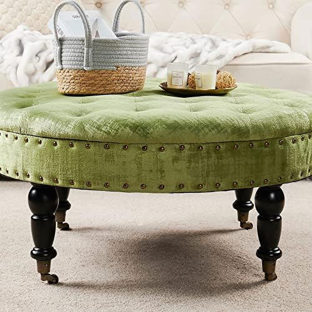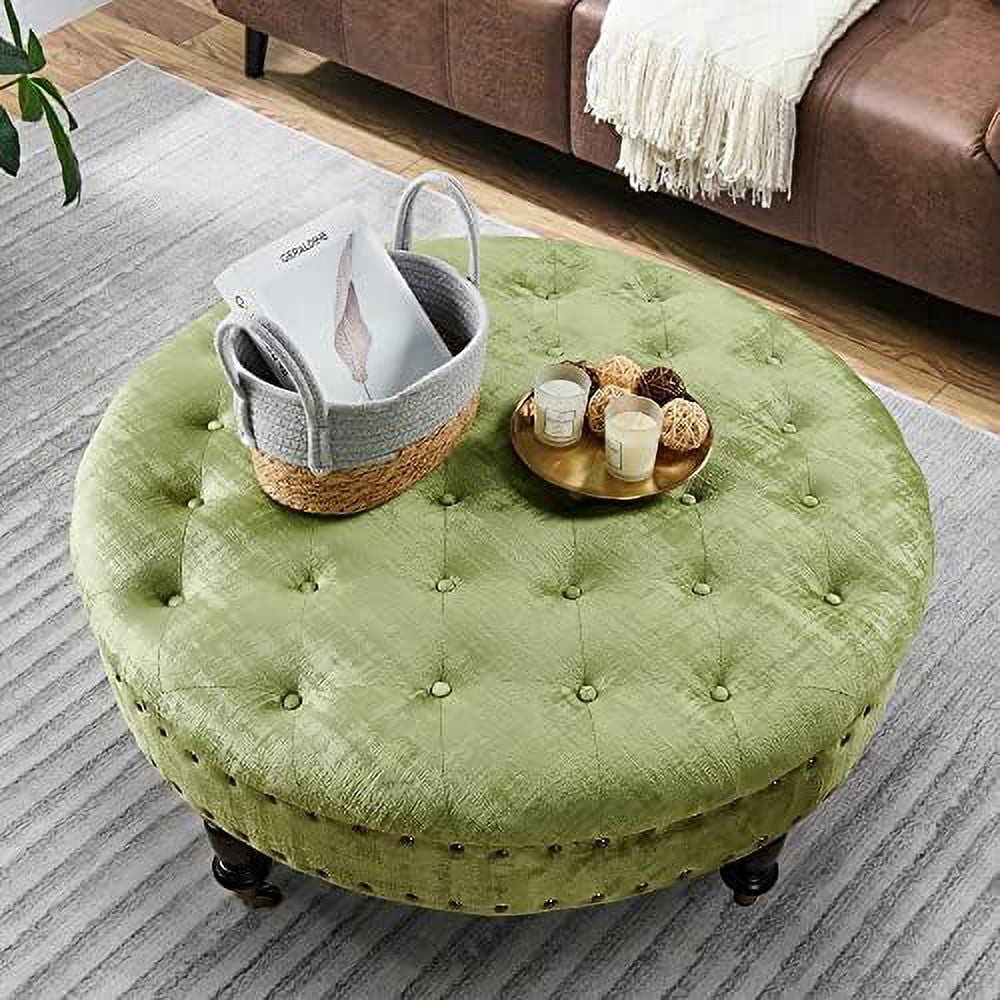 Green Tufted Round Ottoman Coffee Table 34"x 34"x 17"H Large Sturdy Decorative Textured Velvet Cocktail Ottoman for Living Room Bedroom Large Stable Foot Rest Stool with Cast