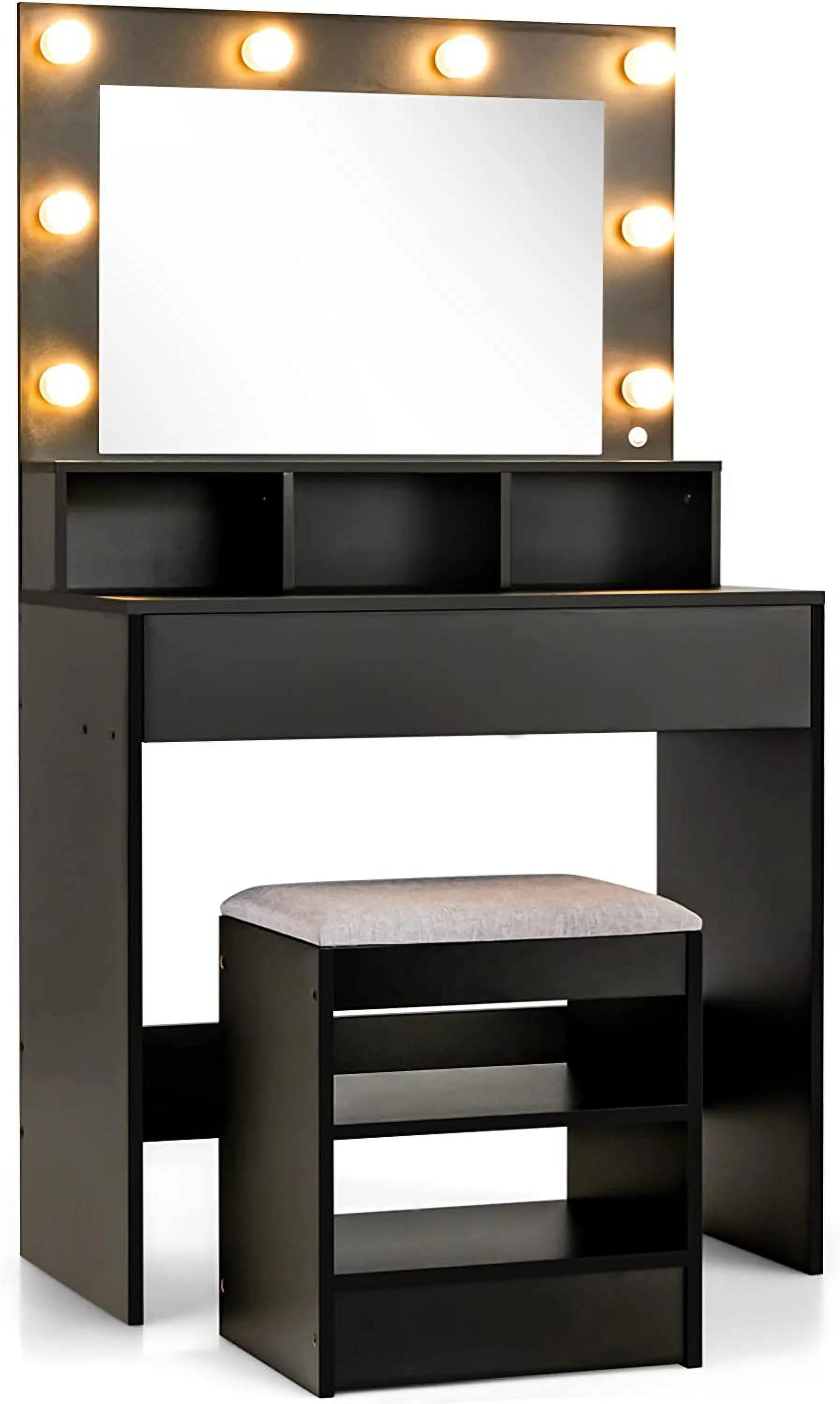 Vanity Table Set with Lighted Mirror, 8 Bulbs, Large Drawer, Tabletop Storage Shelf, Modern Bedroom Vanity Desk Makeup Dressing Table with Cushioned Stool for Girls Women, Black