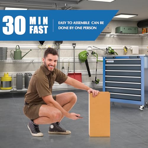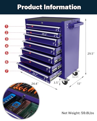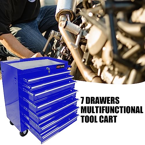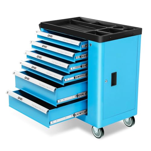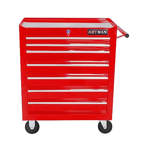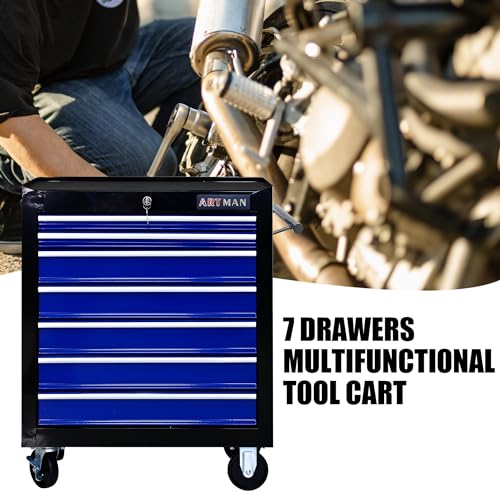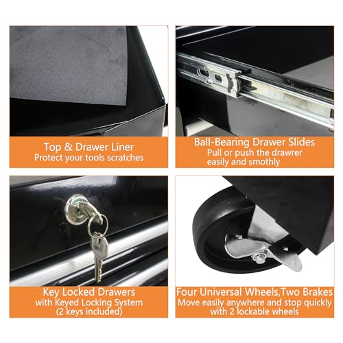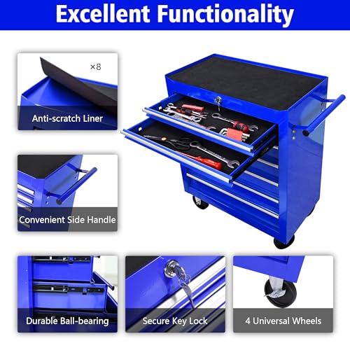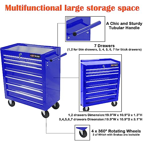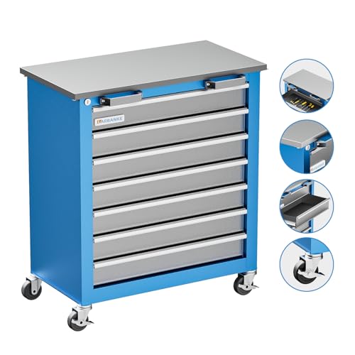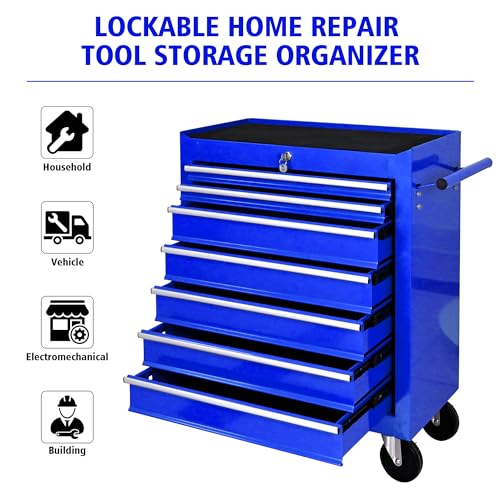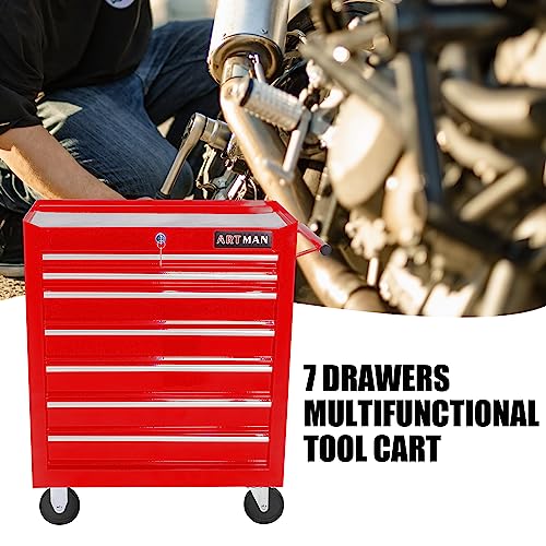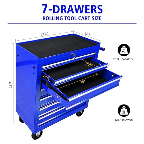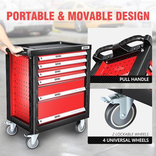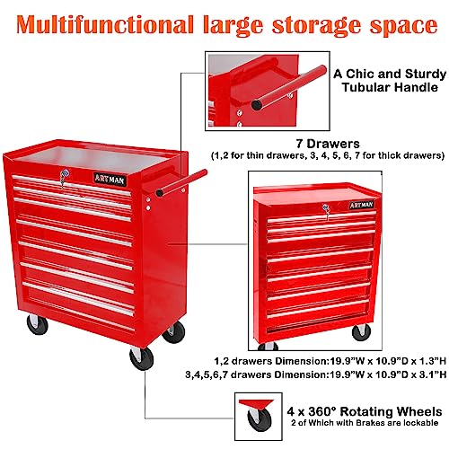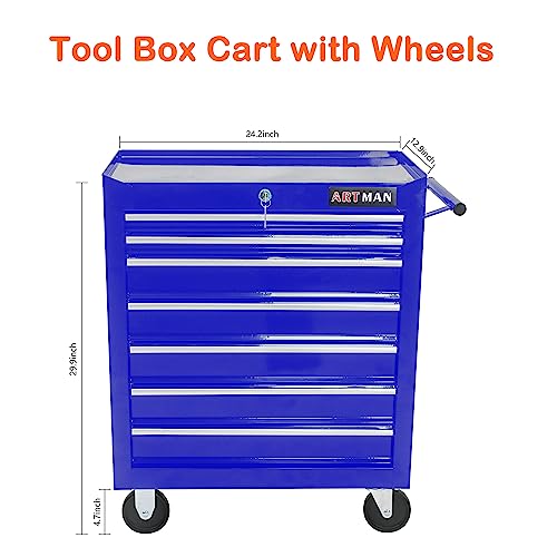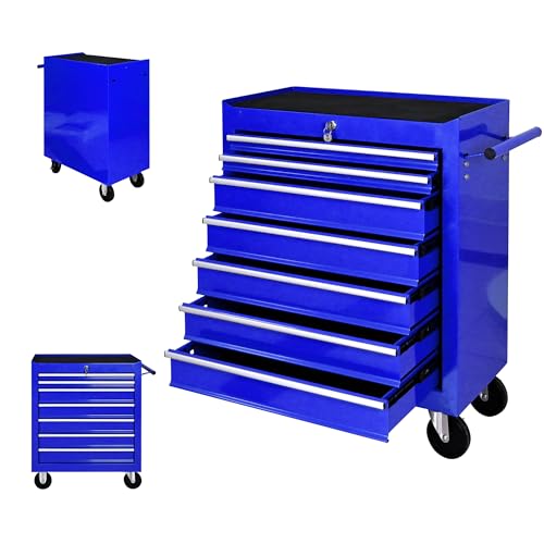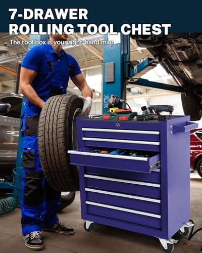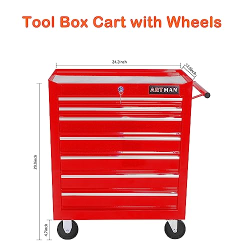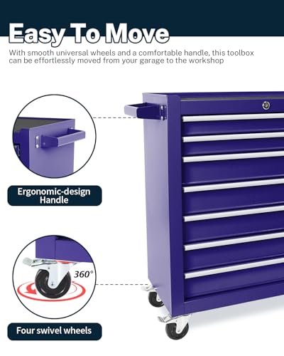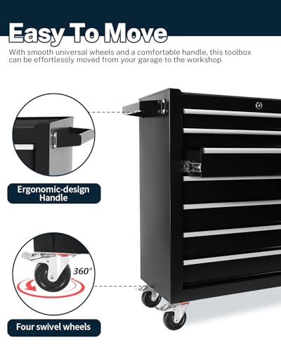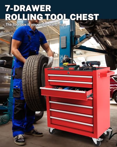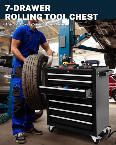 7-Drawer Rolling Toolbox,Tool Box with 360° Lockable Wheels and Padded Feet,Tool Chest with Keyed Locking System and Drawer Liners,can be Combined Storage System with Tool Chest