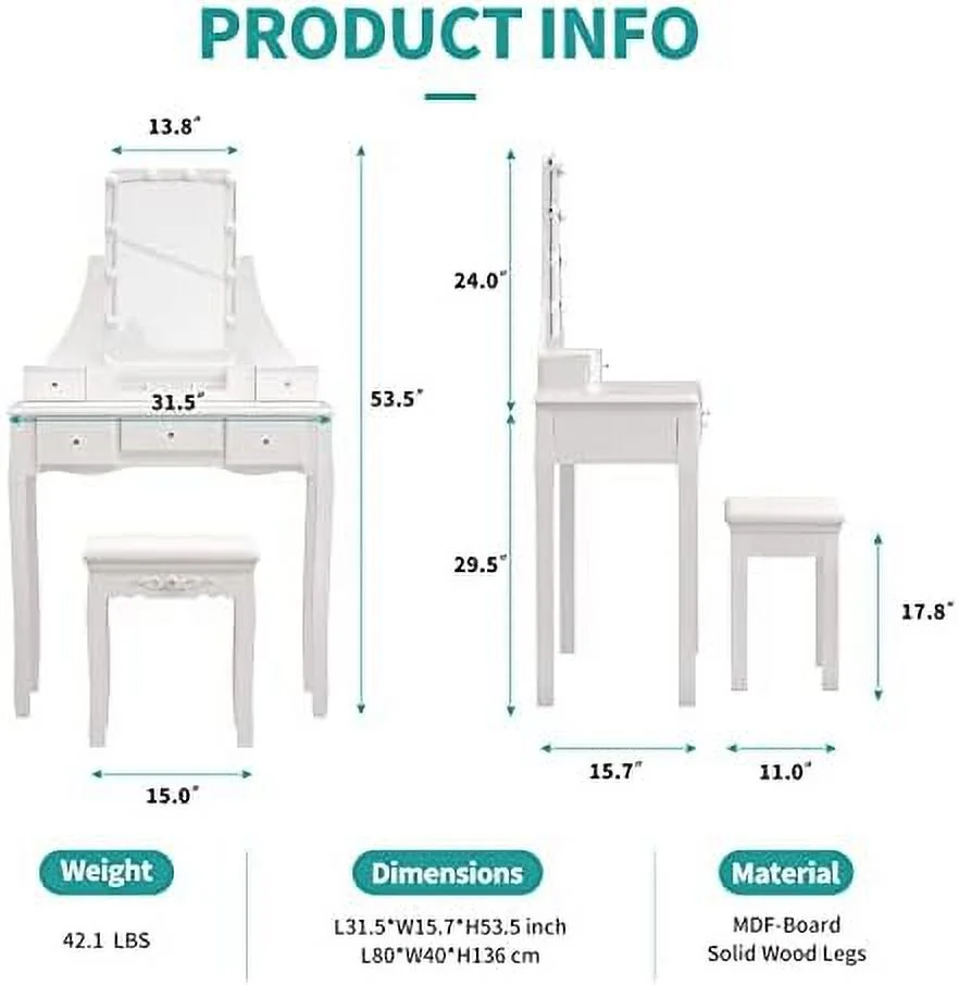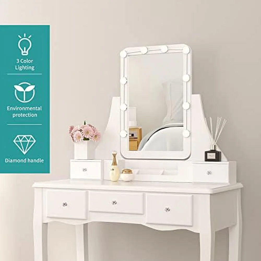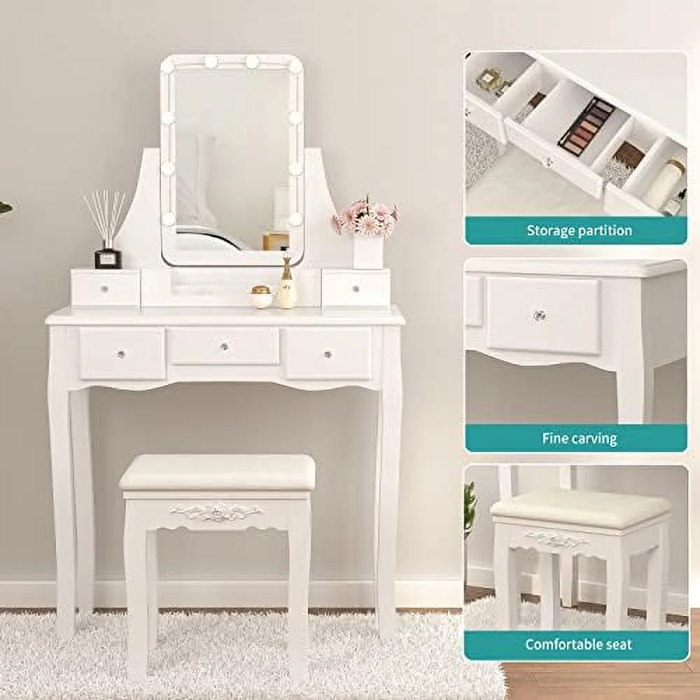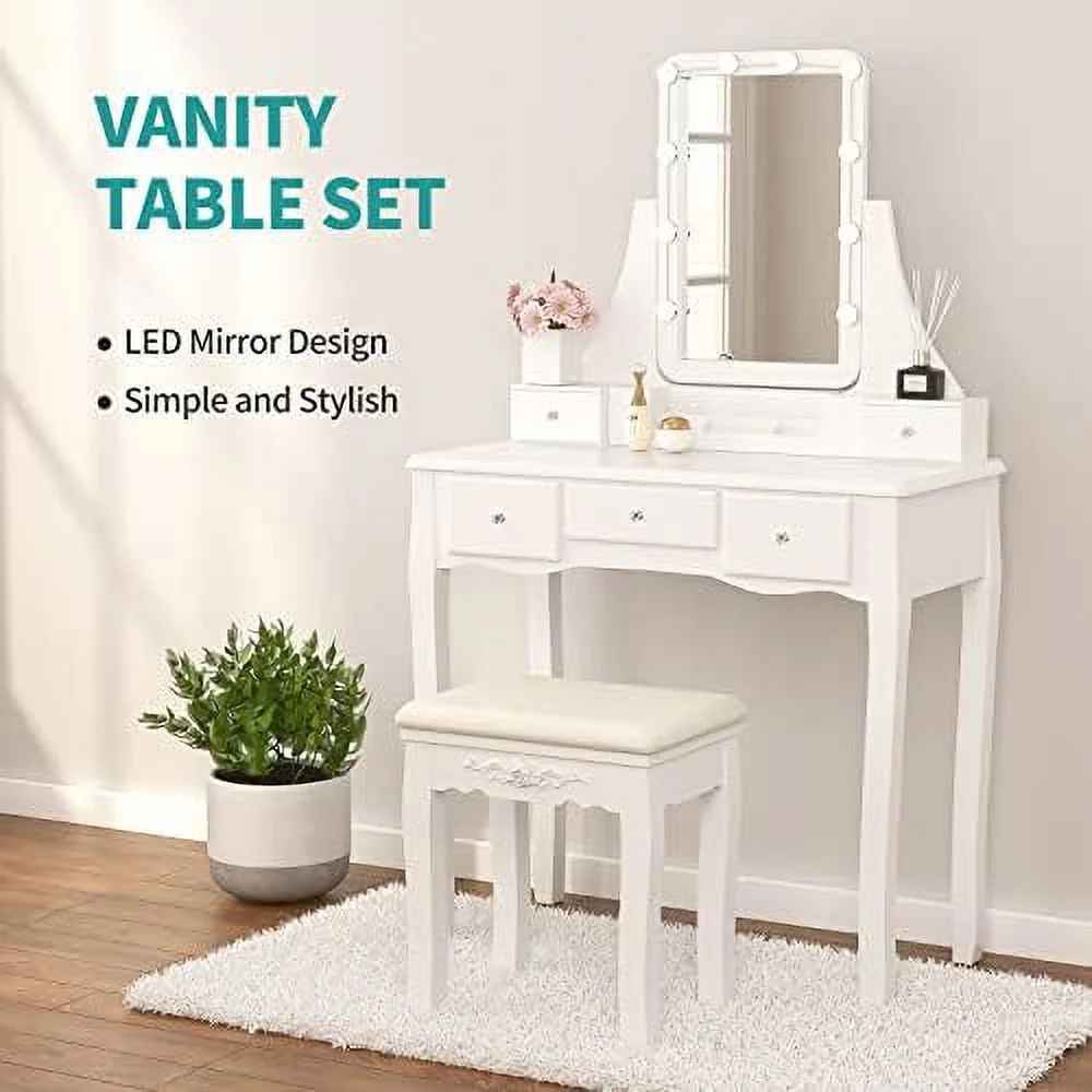 TJUNBOLIFE Vanity Set with Lighted Mirror White Dressing Table Makeup Vanity with Tri-Fold Mirror and 10 LED Dimmable Bulbs Dressing Table with Cushioned Stool&4 Drawers for Bedroom