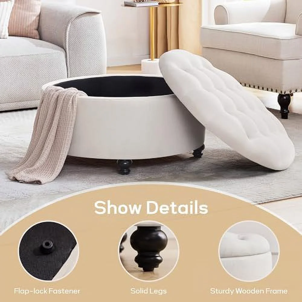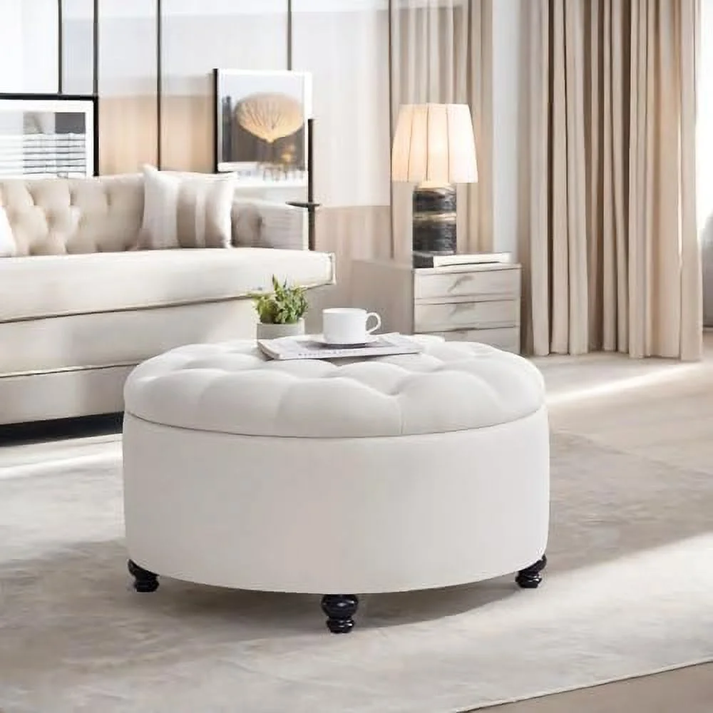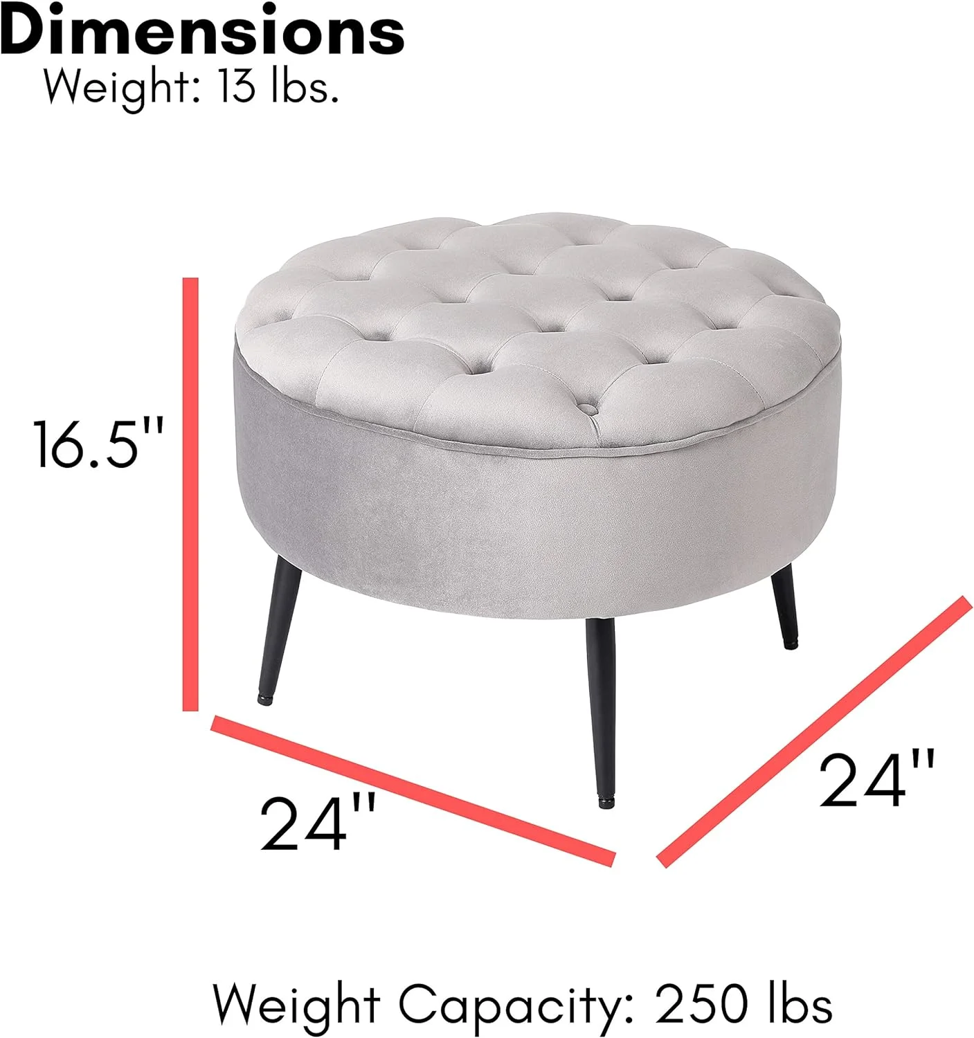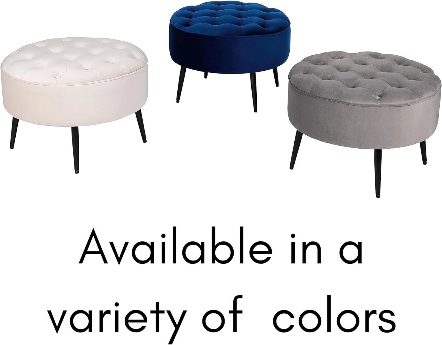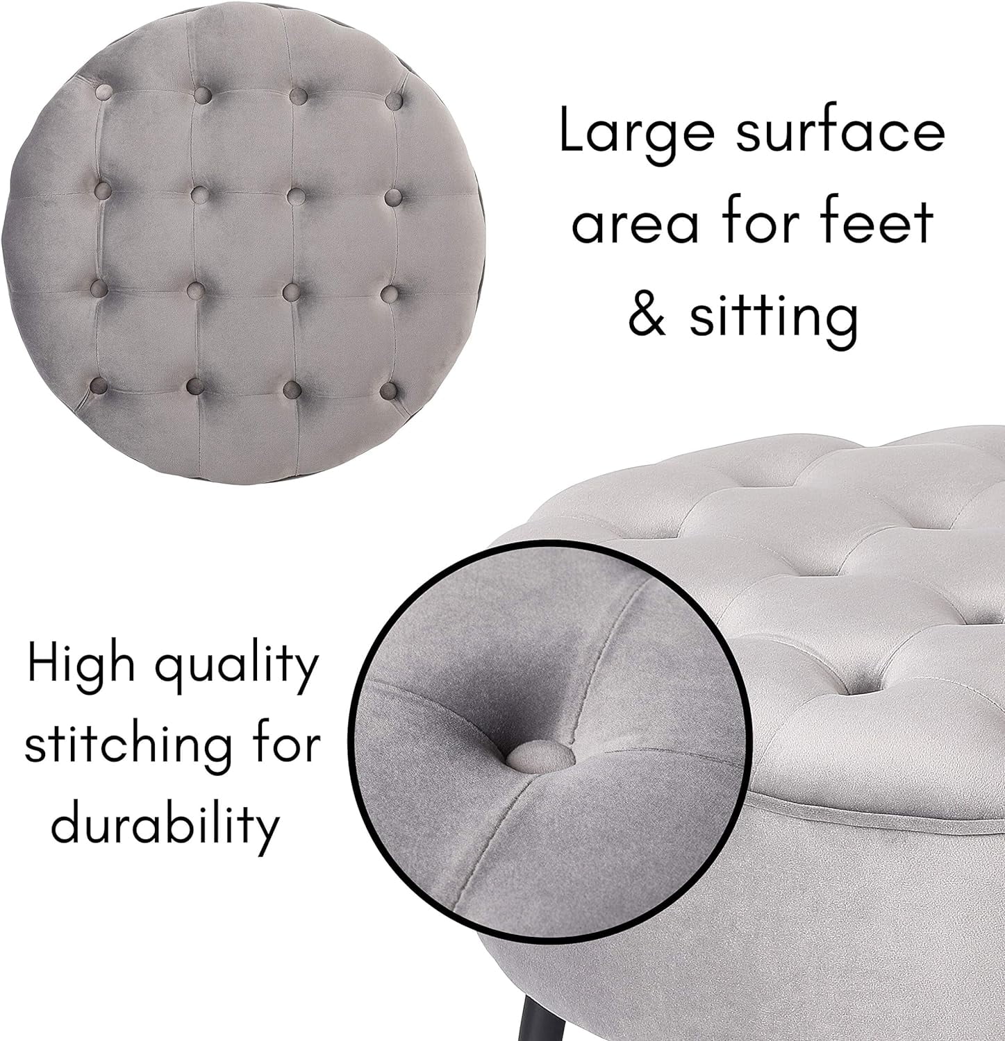 Tufted Round Grey Ottoman – Velvet Foot Stool – Century Modern Steel Legs - Soft Compact Padded Stool - Living Room Or Bedroom – Vanity Chair - Decorative Furniture