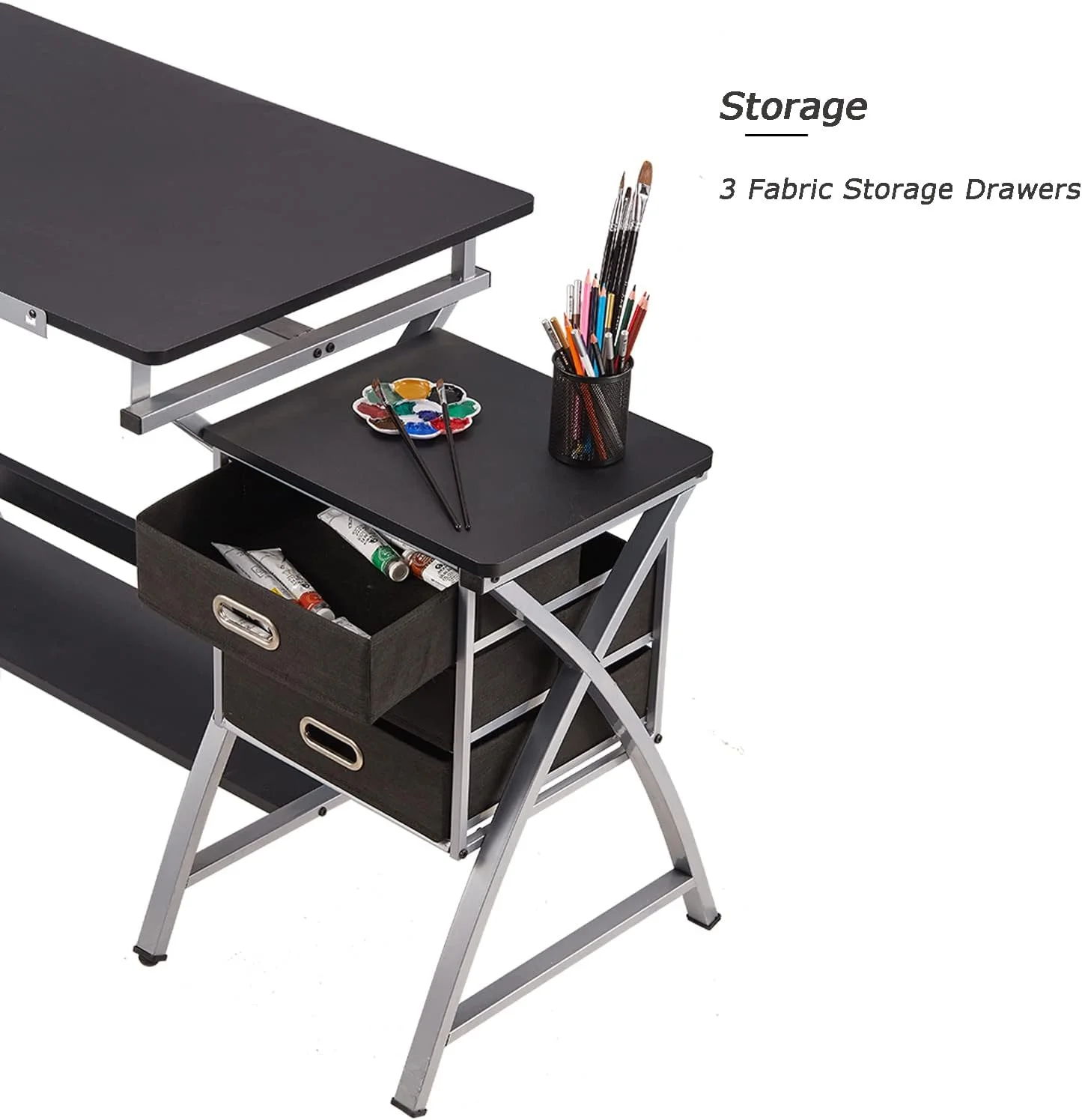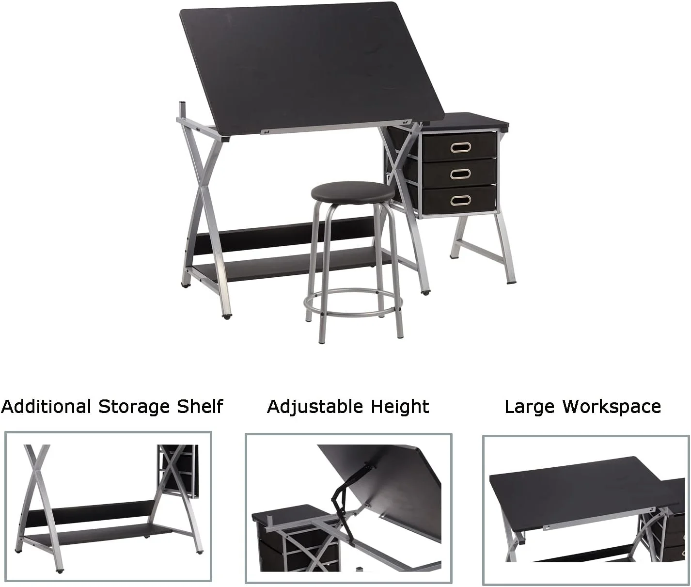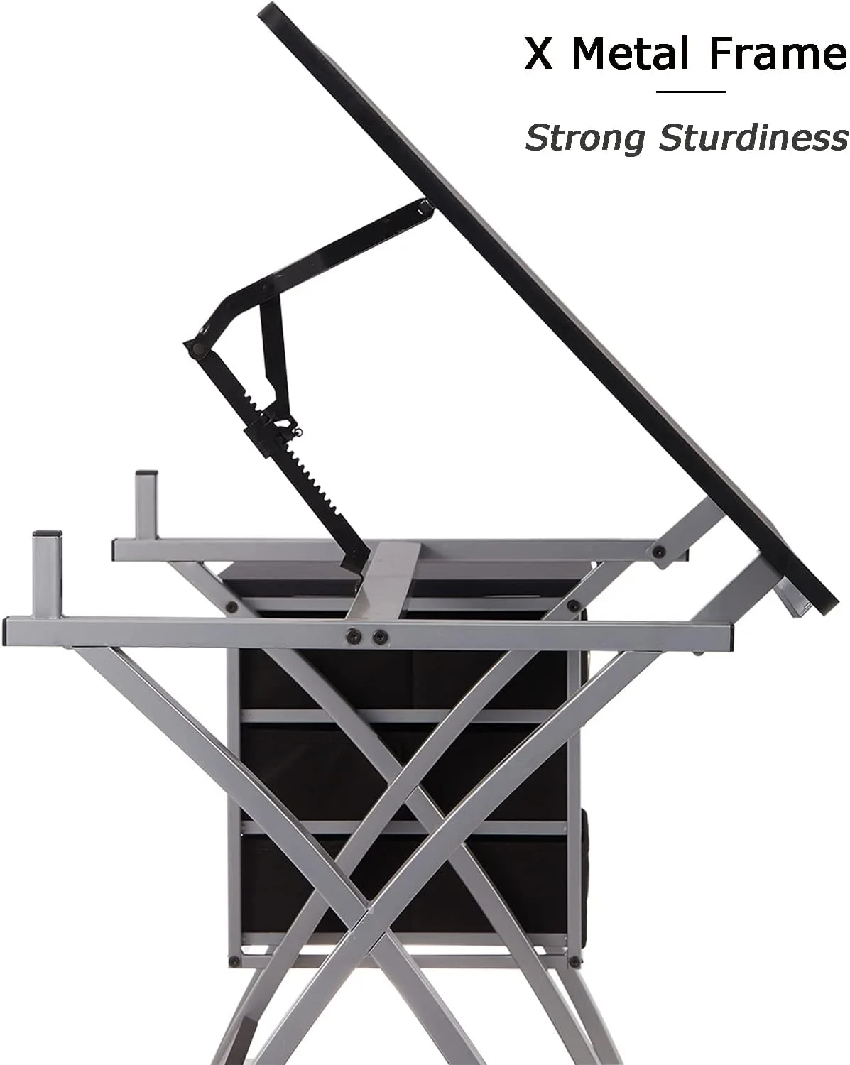 Adjustable Drafting Table For Artists With Stool, Sturdy X-Cross Metal Frame Drawing Table With Storage Drawers, Art Desk With Tilted , Craft Station Writing Computer Desk, Black