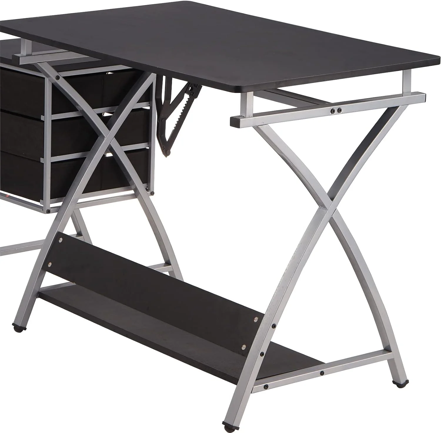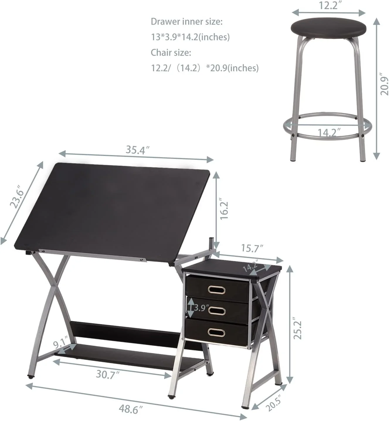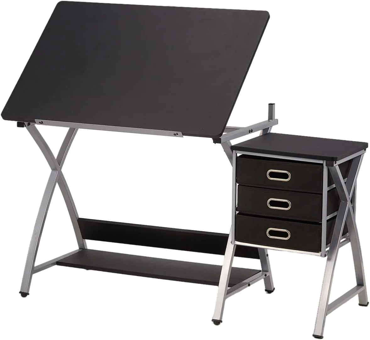 Adjustable Drafting Table For Artists With Stool, Sturdy X-Cross Metal Frame Drawing Table With Storage Drawers, Art Desk With Tilted , Craft Station Writing Computer Desk, Black