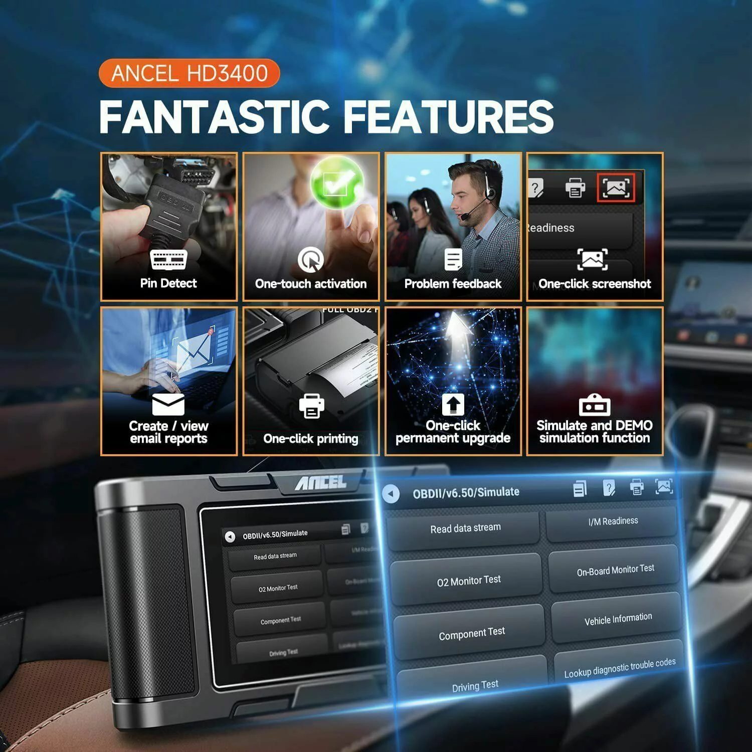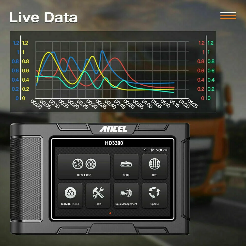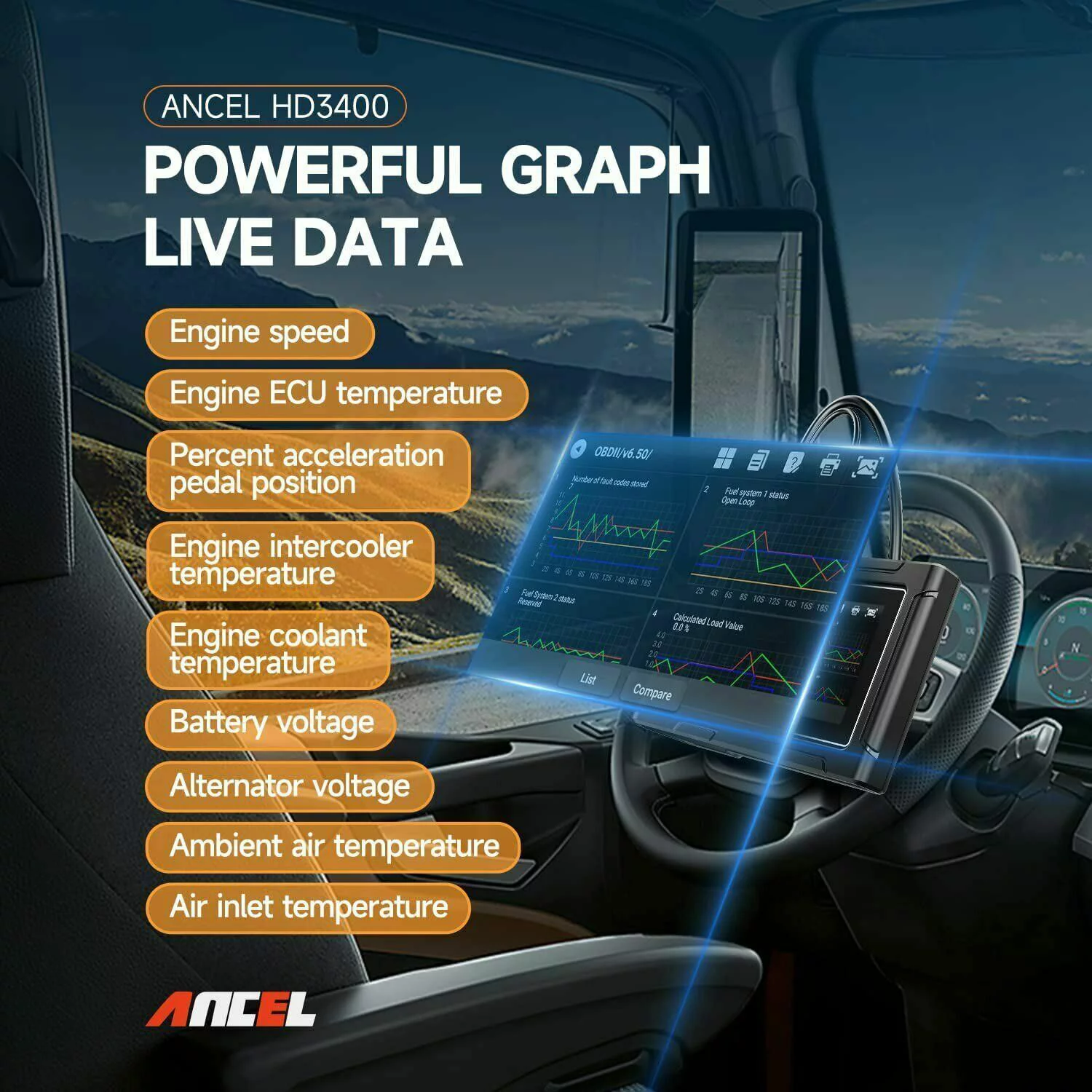 ANCEL HD3400 OBD2 Scanner Heavy Duty Truck DPF Regen Scanner for Cummins Detroit Caterpillar Paccar 2-in-1 Diesel Truck Car All System Diagnostic Tools Code Reader