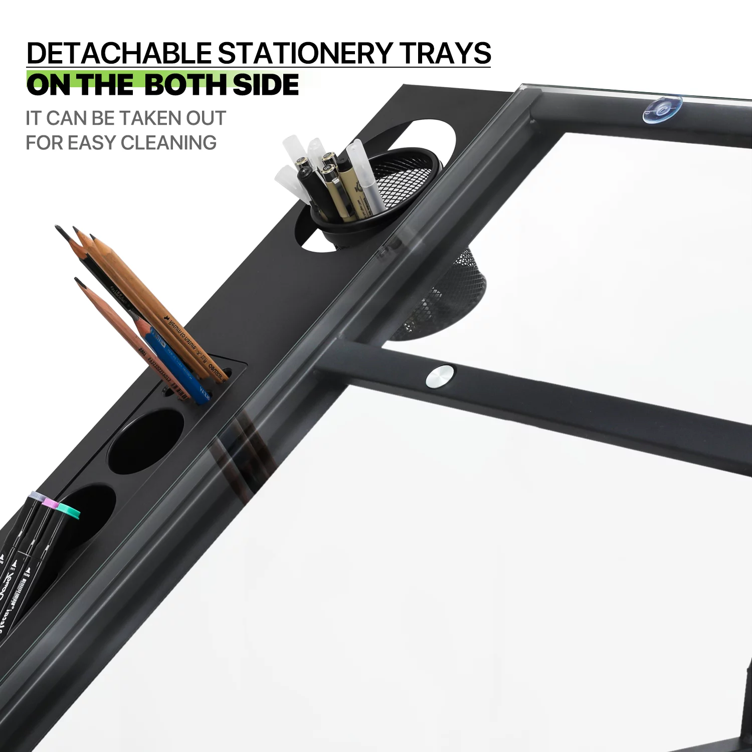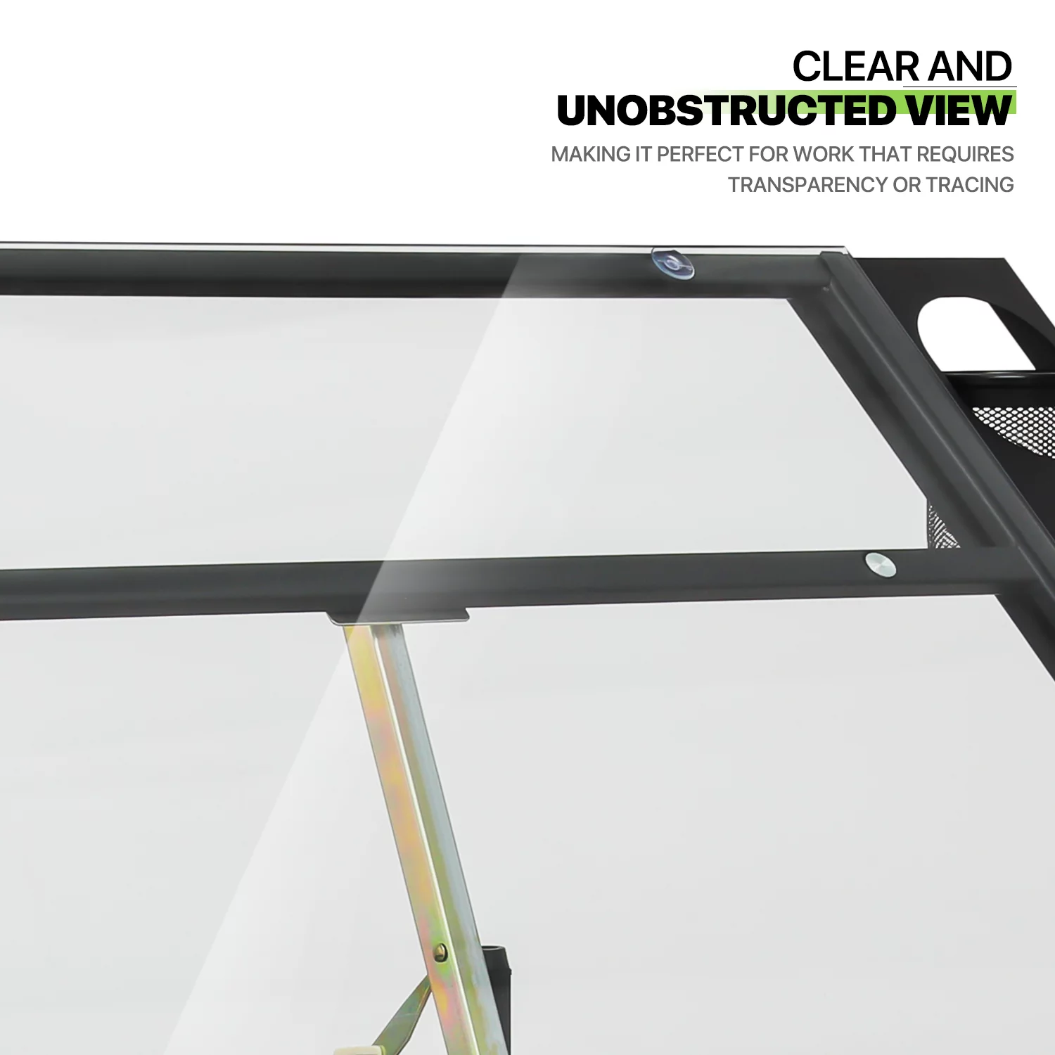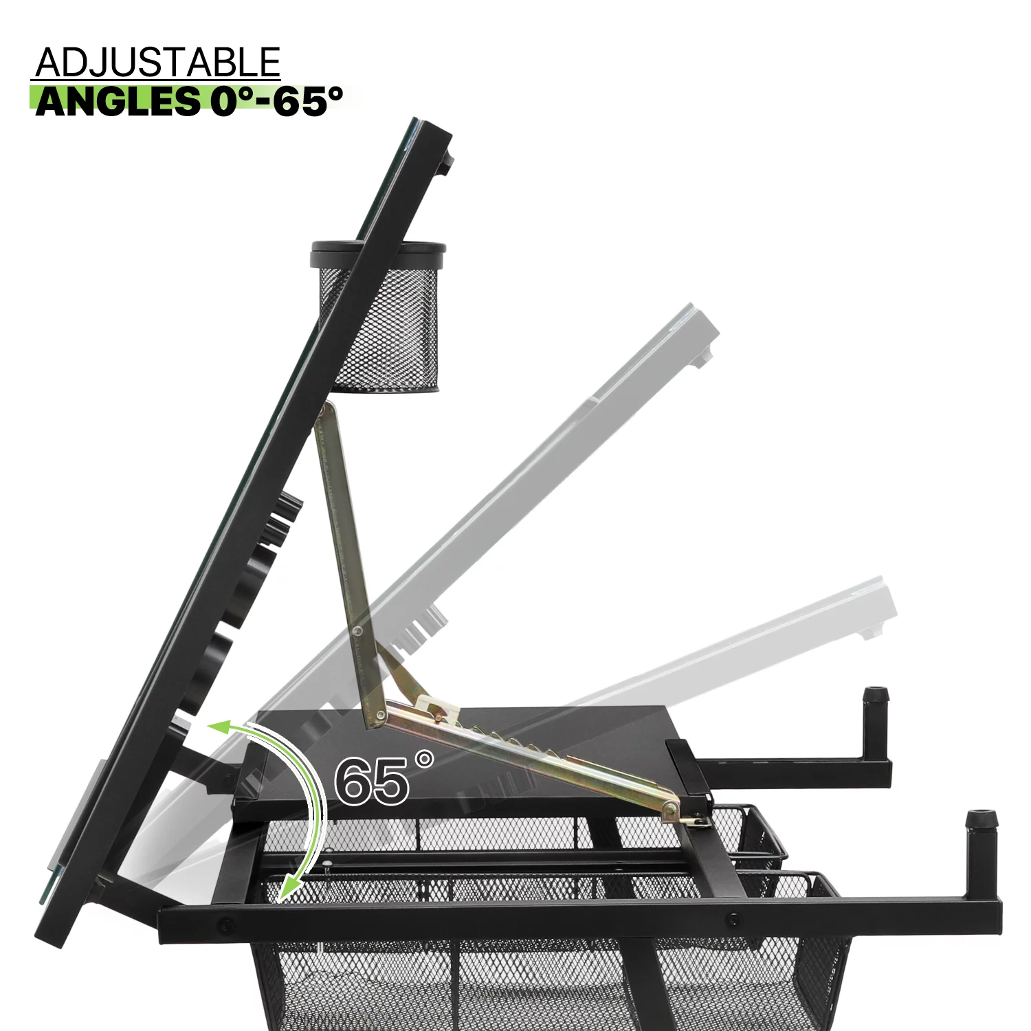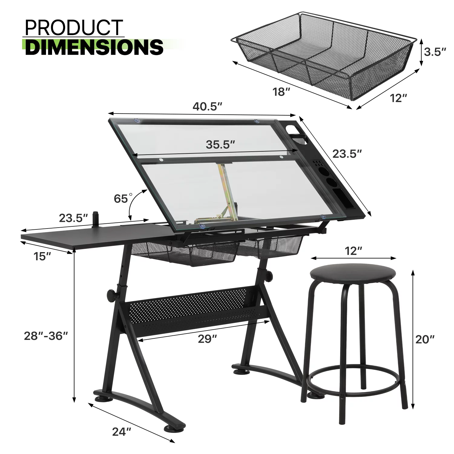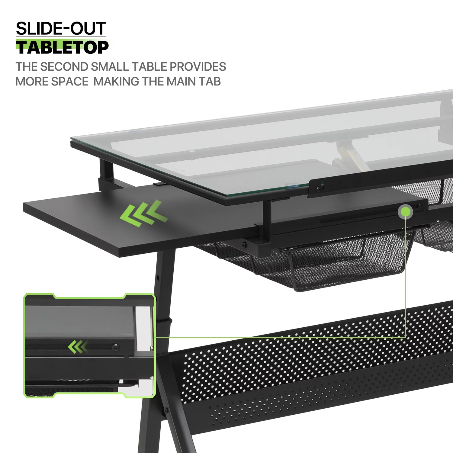 Magshion Craft and Drawing Station with Stool Set, Tempered Glass Top Drafting Table with Slide-Out Tabletop, Drawers & Side Trays, Adjustable Angle & Height Work Surface, Black