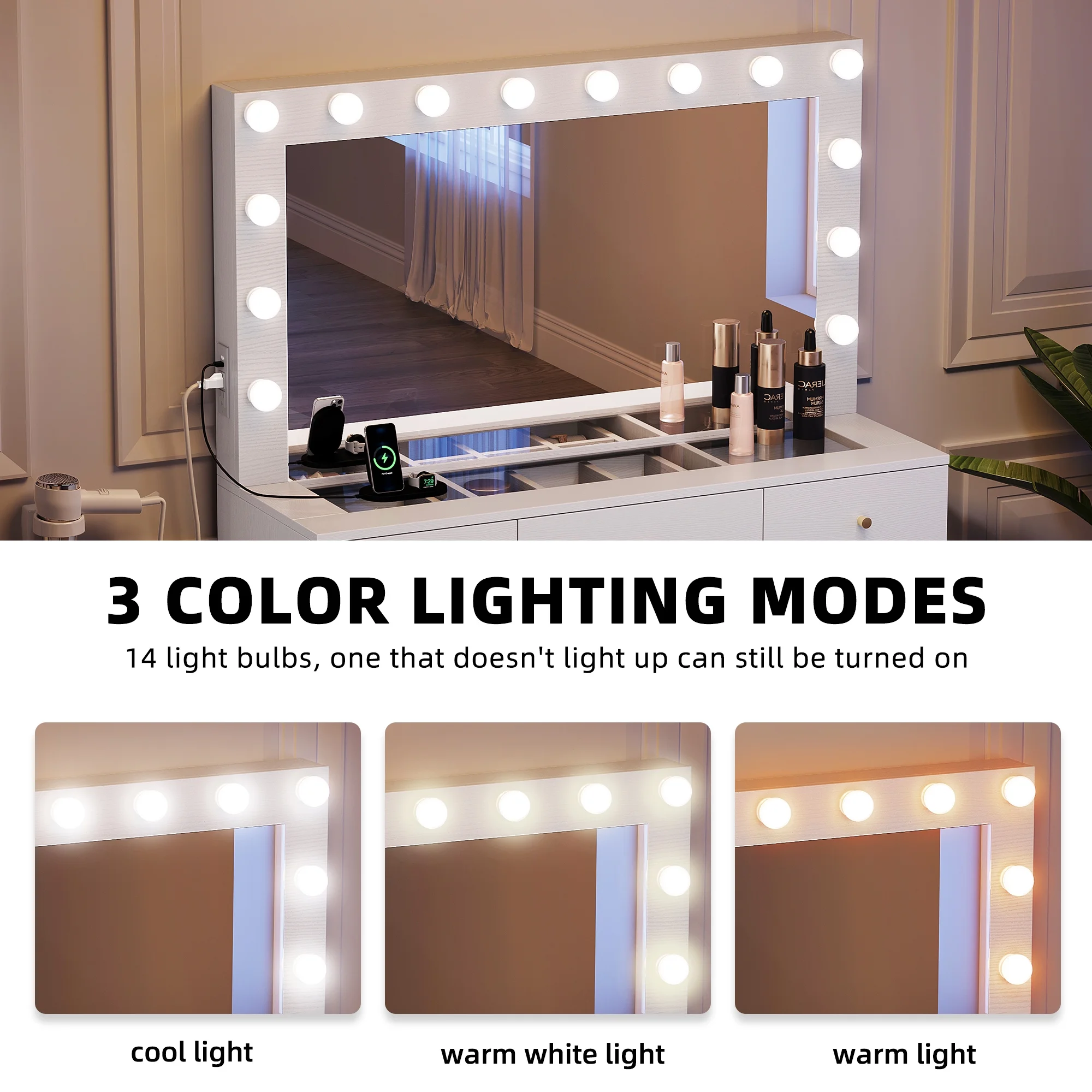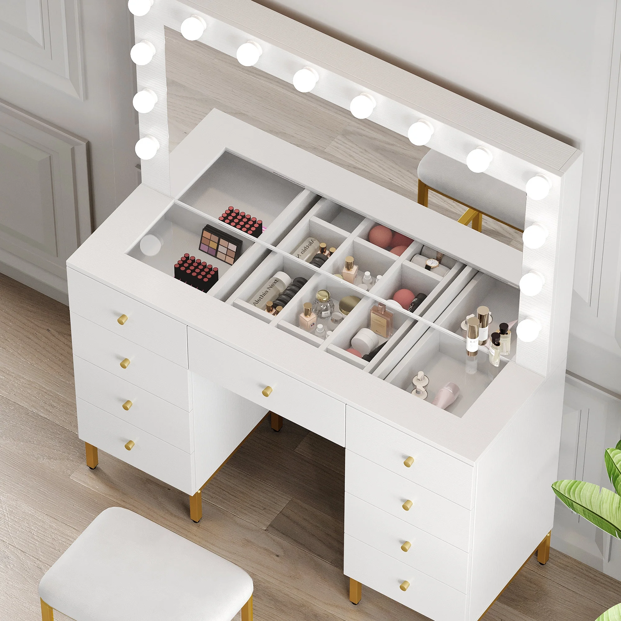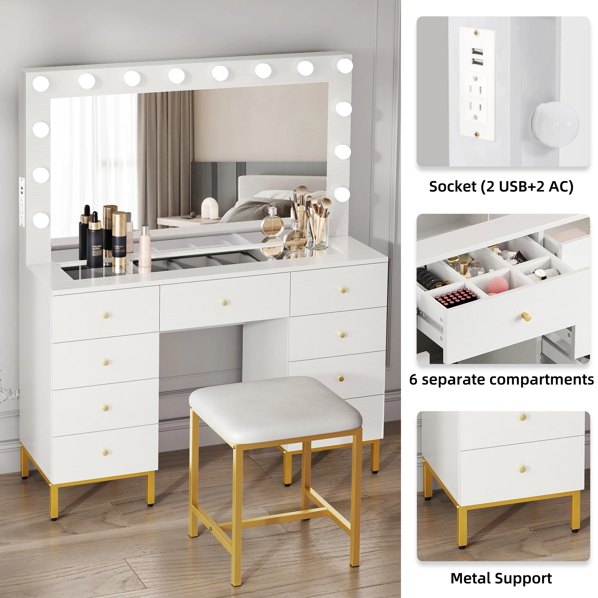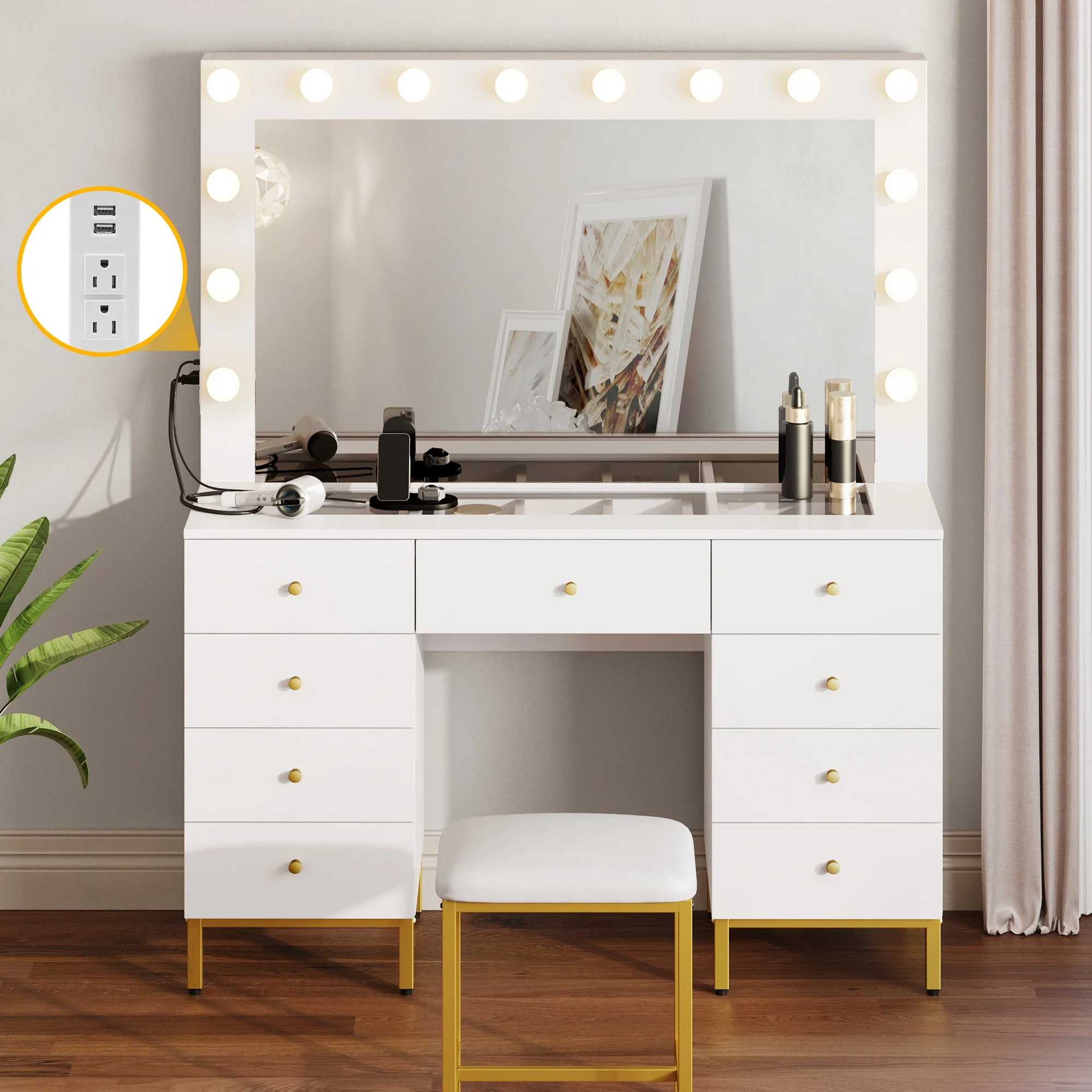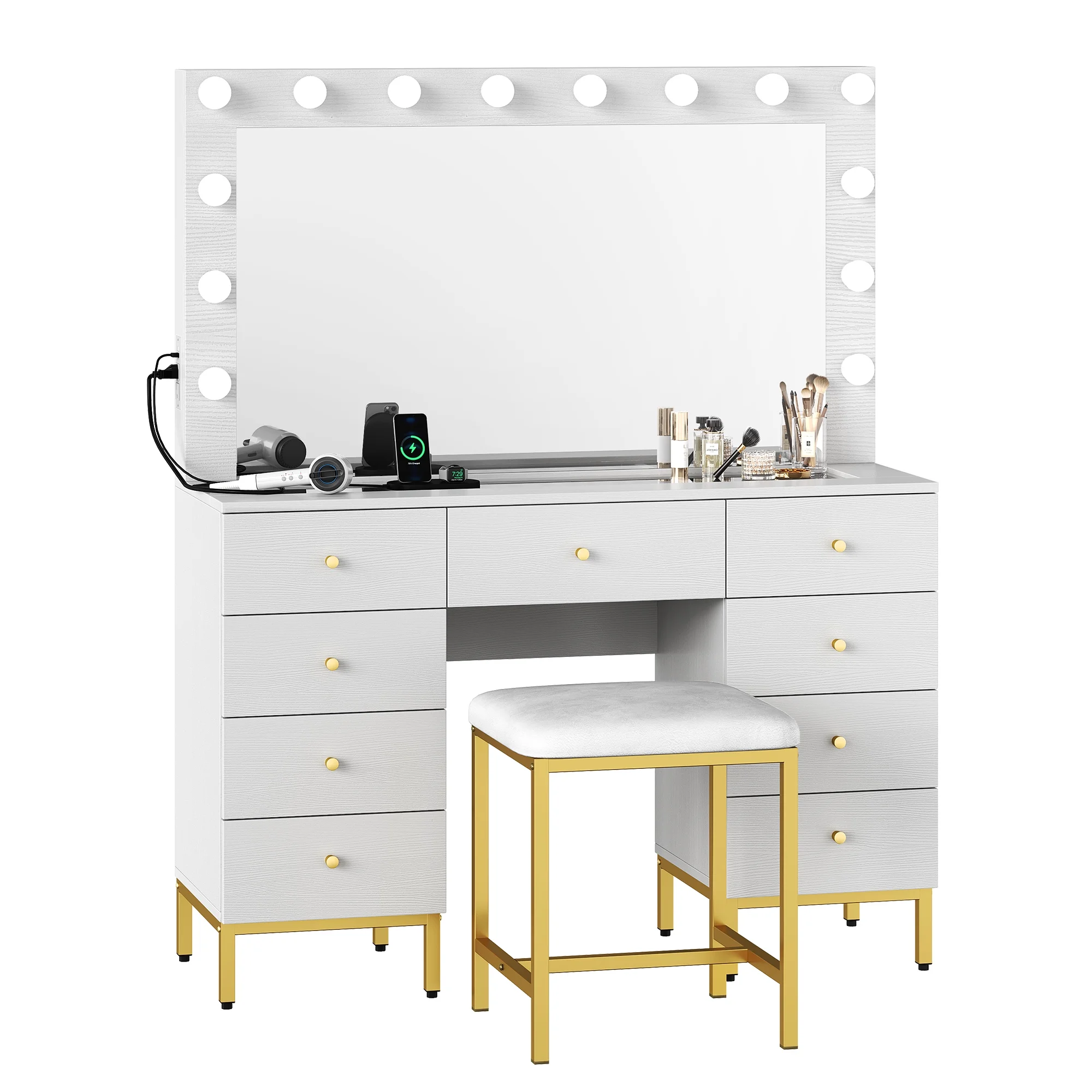 DWVO Vanity Table Set with 3 Color Lighted Mirror & Charging Station & Stool, Modern Makeup Vanity Dressing Table with 9 Drawers for Bedroom, Gold and White Vanity Desk for Women Girls