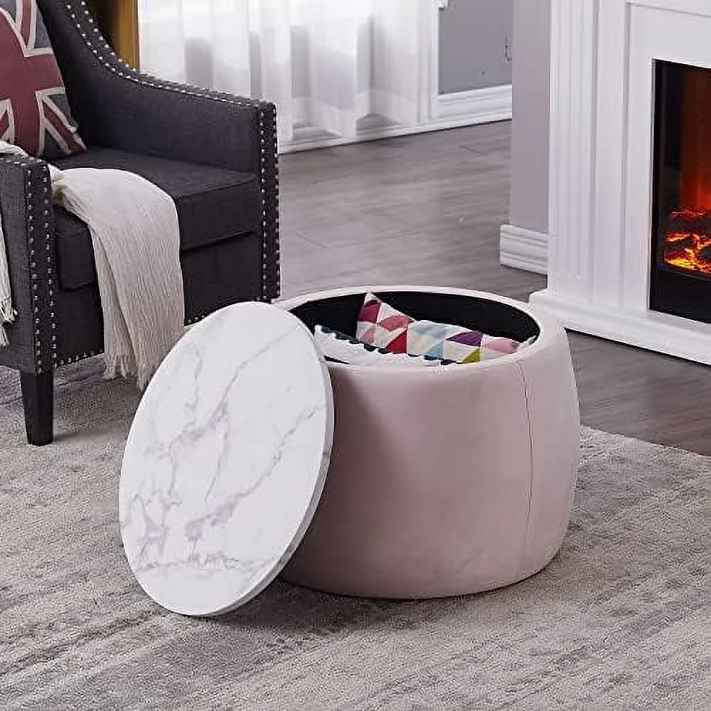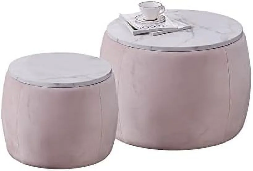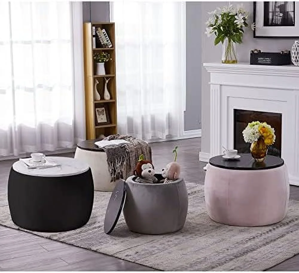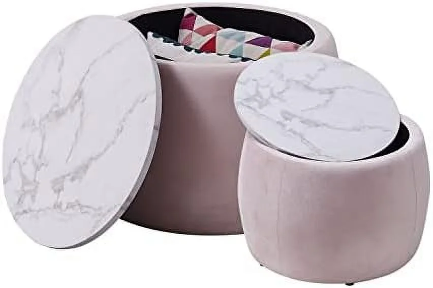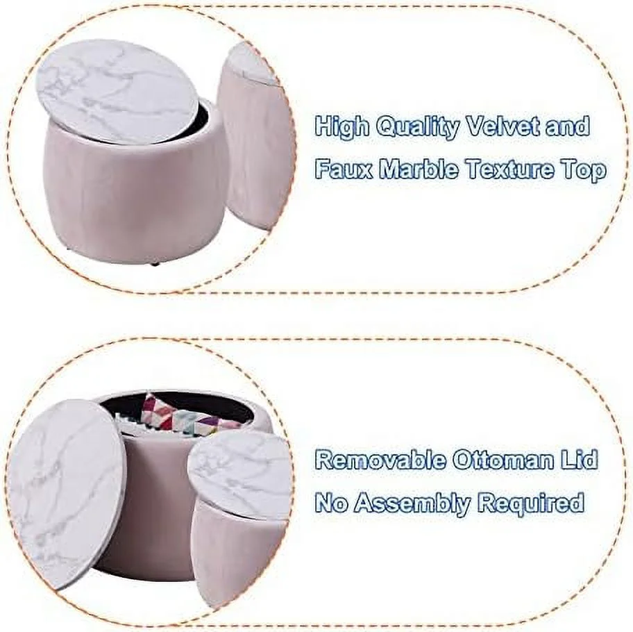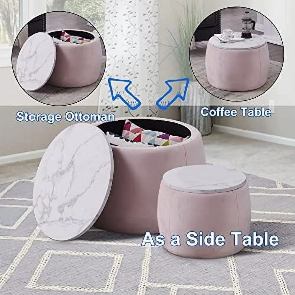 Round Ottoman Coffee Table Set of 2 with Wooden Lid Footstool Side Table End Table for Living Room Faux Marble Texture Top (Black)