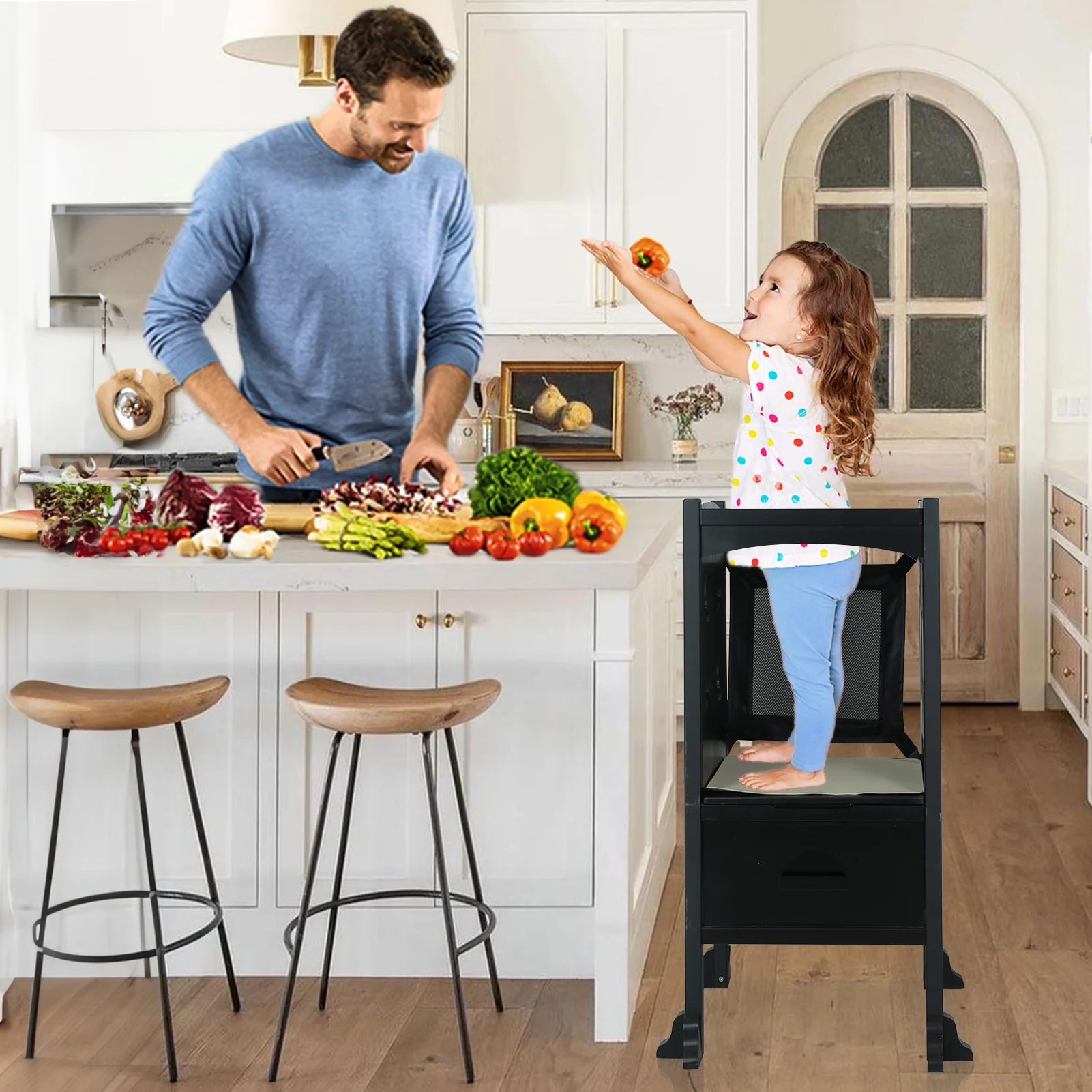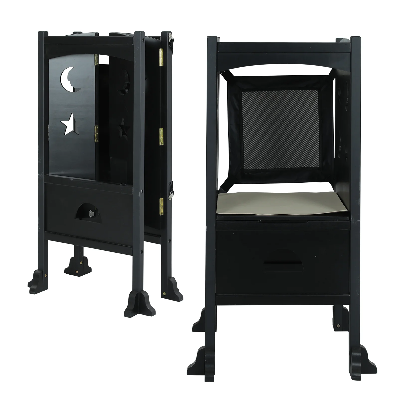 Fionafurn Wooden Kitchen Step Stool, Folding Toddler Stool Counter Kids Kitchen Step Stool,Black