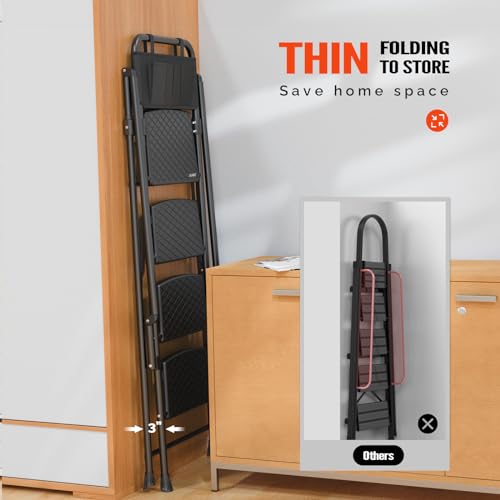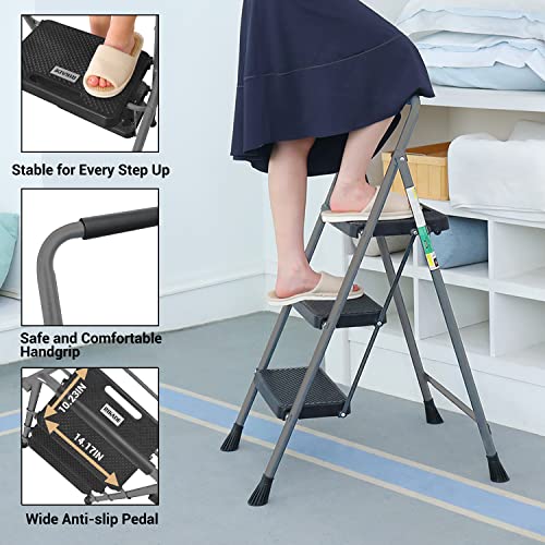 3 Step Ladder, Miscoos Folding Step Stool for Adults with Wide Anti-Slip Pedal, Sturdy Steel Ladder, Lightweight, Convenient Handgrip, Portable Kitchen& Household Small Step Ladder, Black