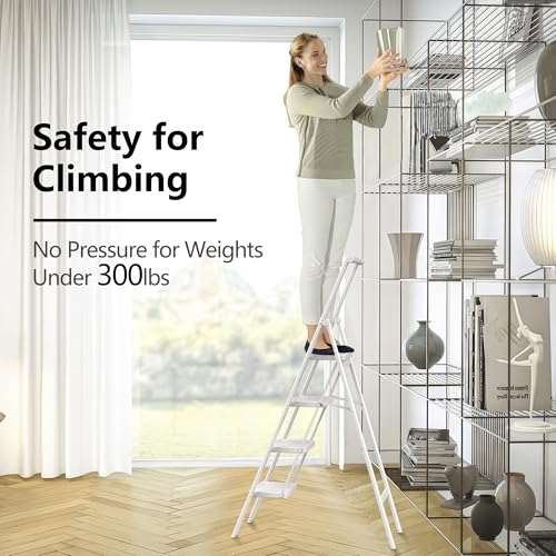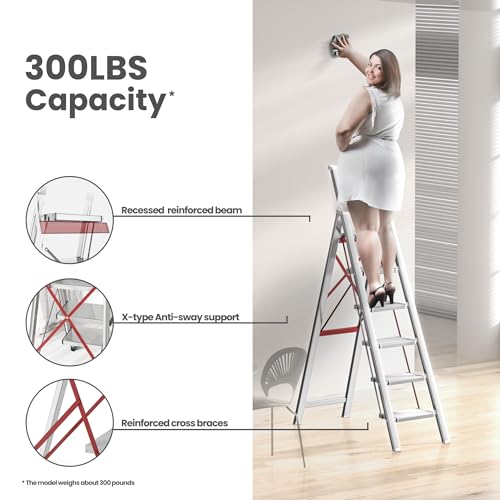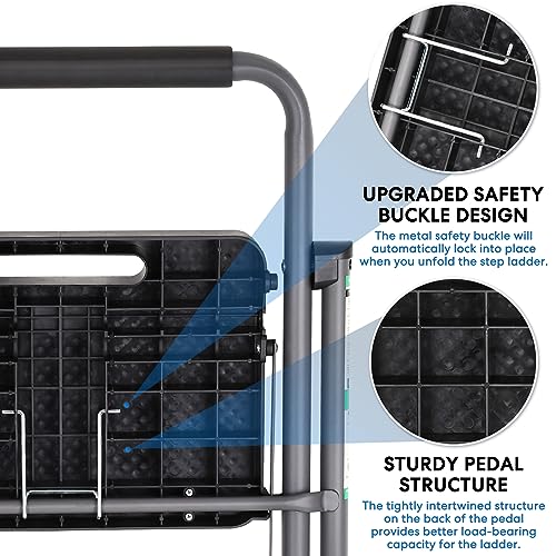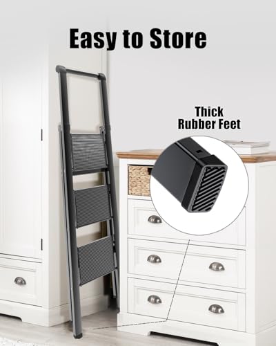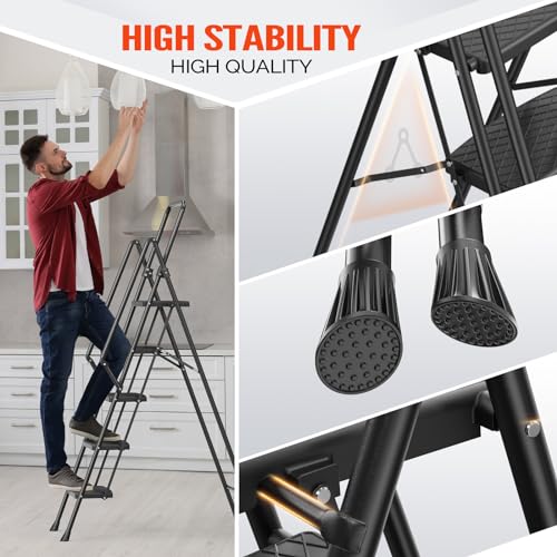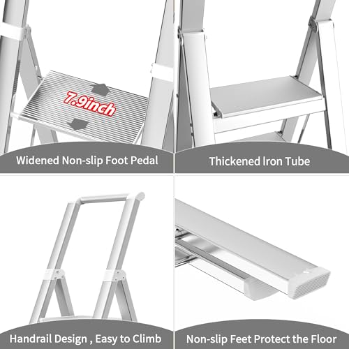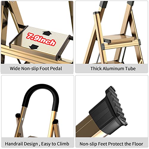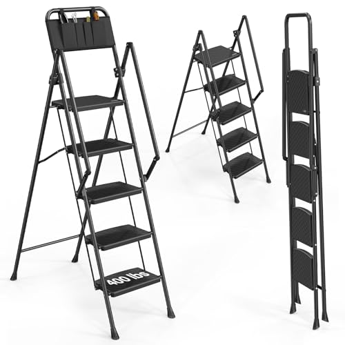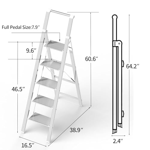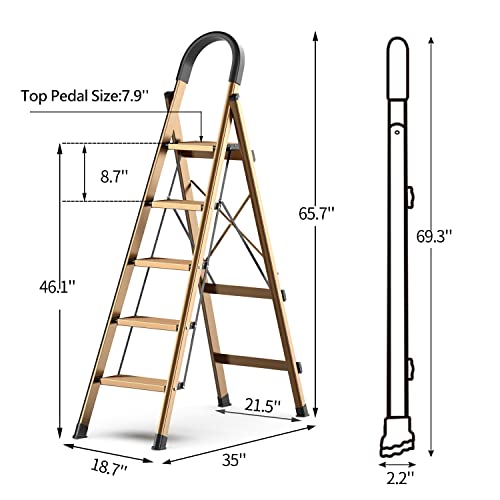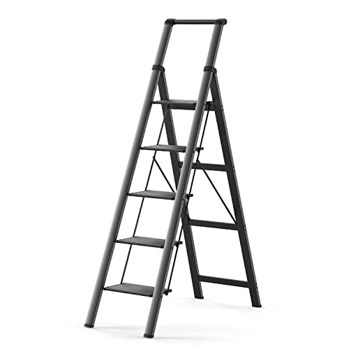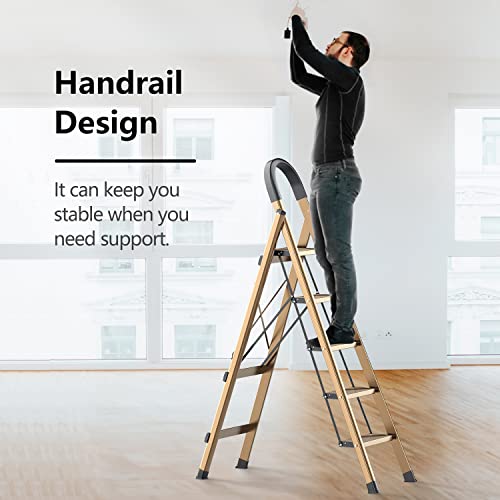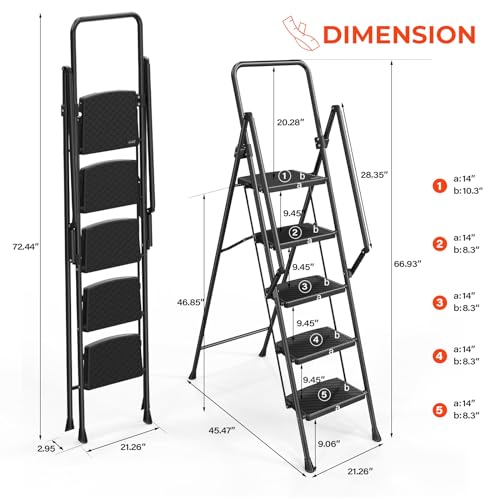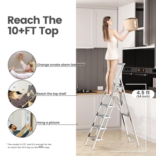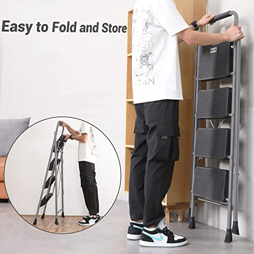 XinSunho 5 Step Ladder, Retractable Handgrip Folding Step Stool with Anti-Slip Wide Pedal, Aluminum Stool Ladders 5 Steps, 330lbs Safety Household Ladder