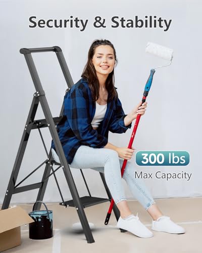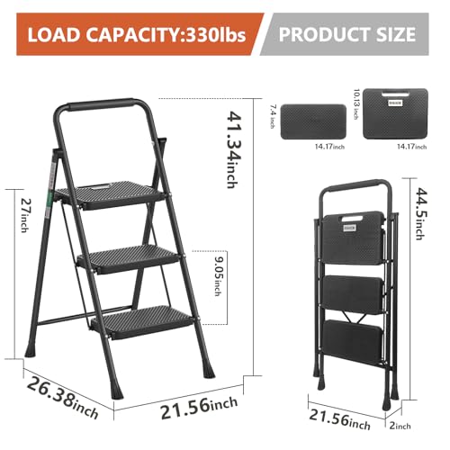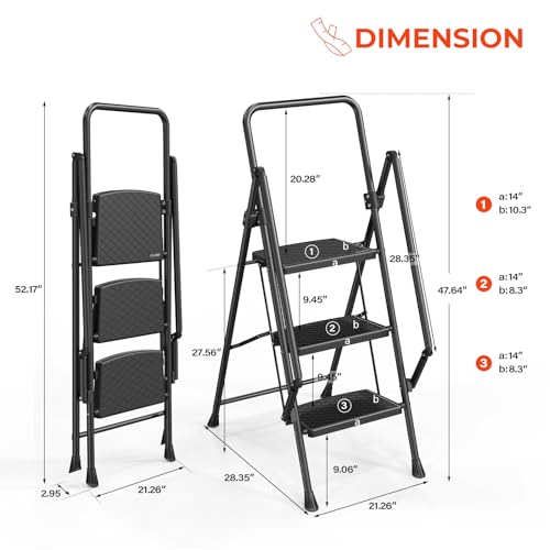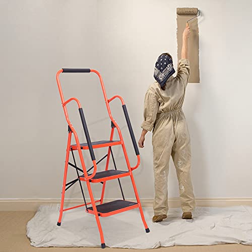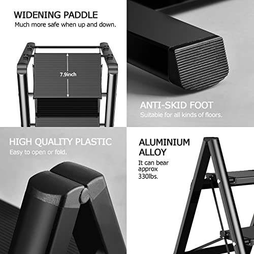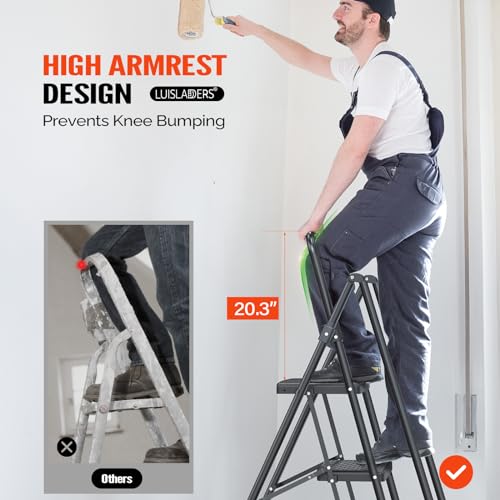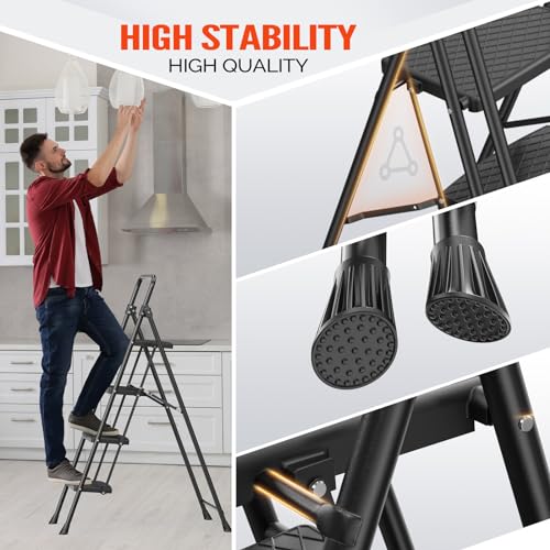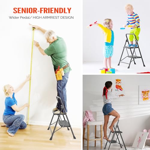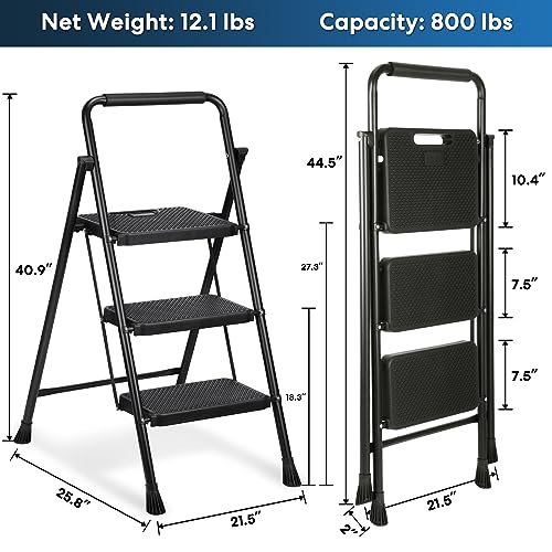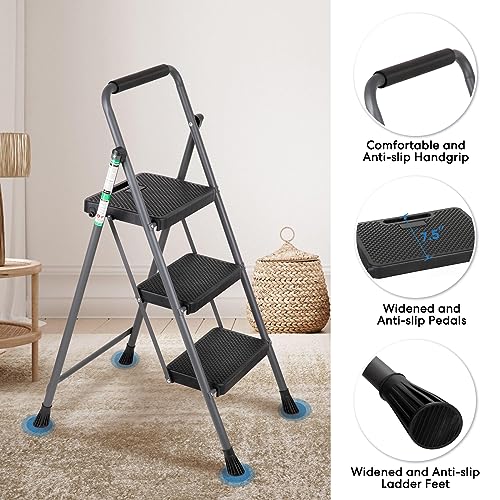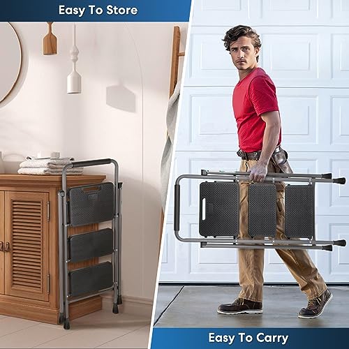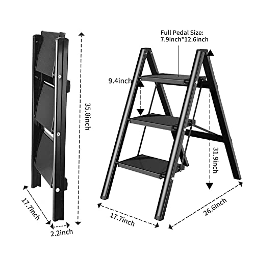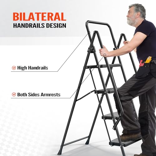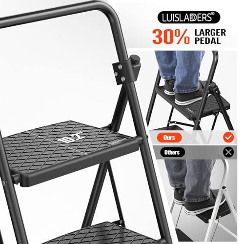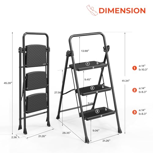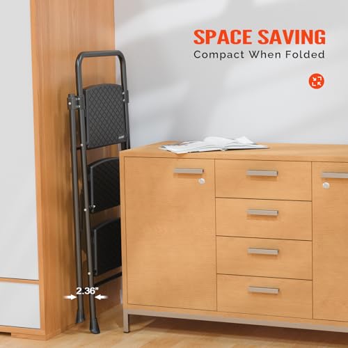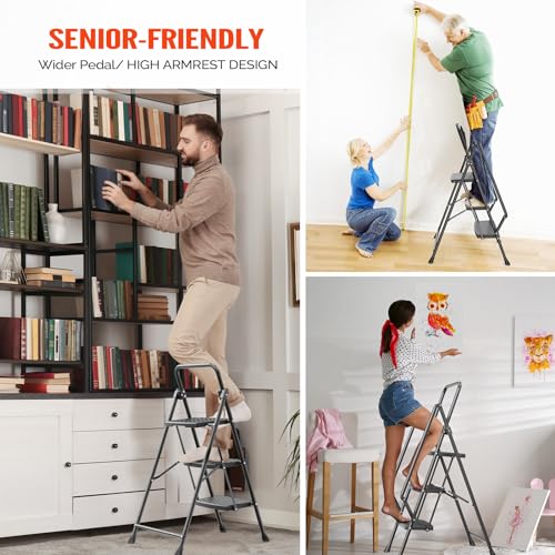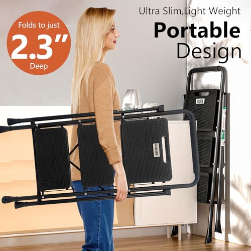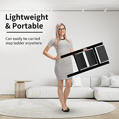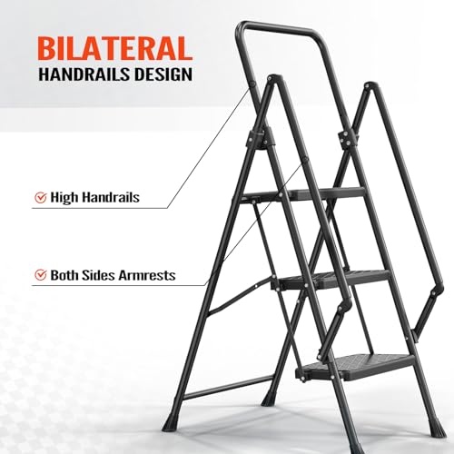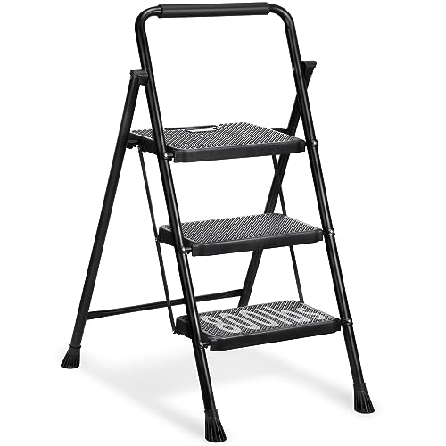 LUISLADDERS 3 Step Ladder with Handrails, Folding Step Stool with Widened Anti-Slip Pedal, 500lbs Lightweight Step Ladder 3 Step Folding, Multi-use for Home Kitchen Pantry Office, Black
