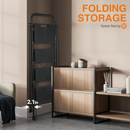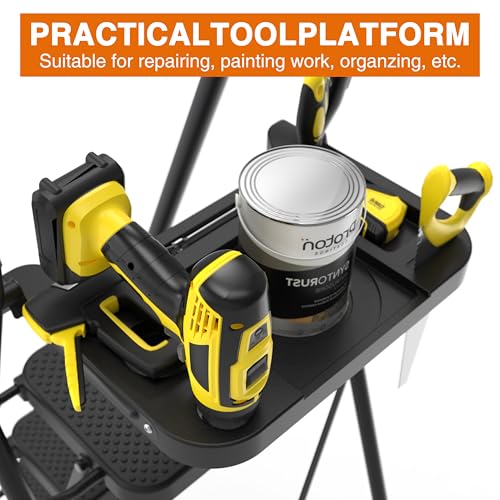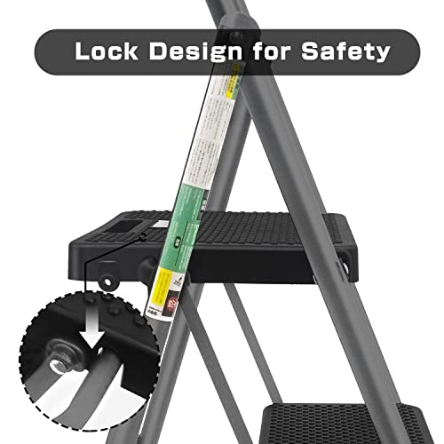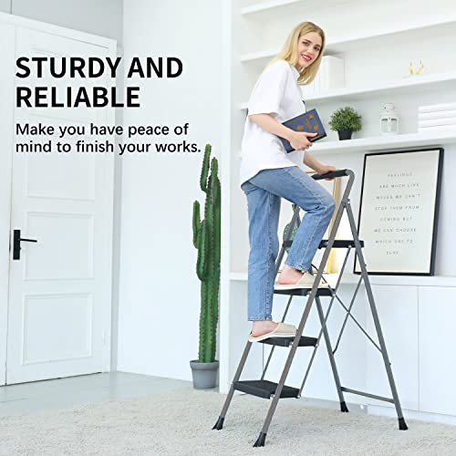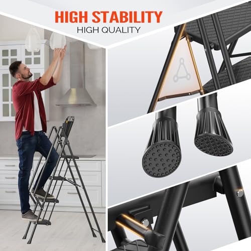 3 Step Ladder, Protable Steel Folding Stool with Wide Anti-Slip Pedal, 500lbs Sturdy Steel Ladder, Black