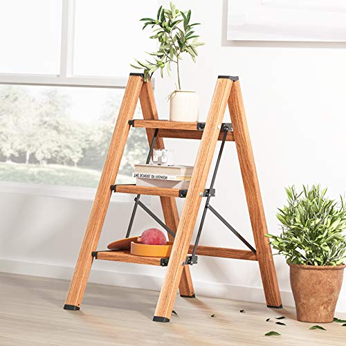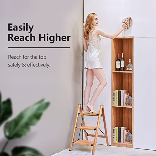 3 Step Ladder, Folding Step Stool with Anti-Slip Wide Sturdy Pedal and Handgrip, Multi-Use for Home and Kitchen Use, Space Saving-Woodgrain(300 lbs Capacity)