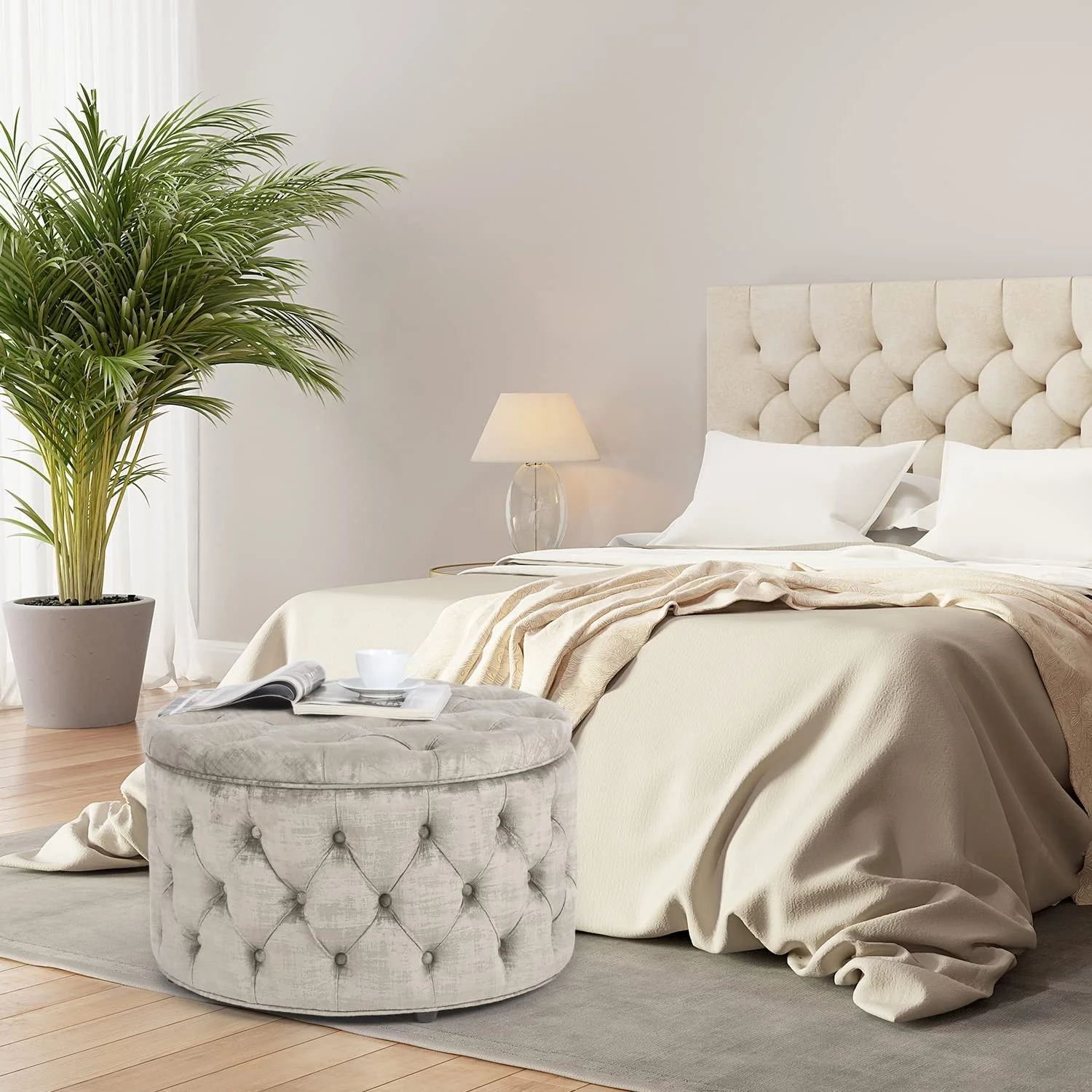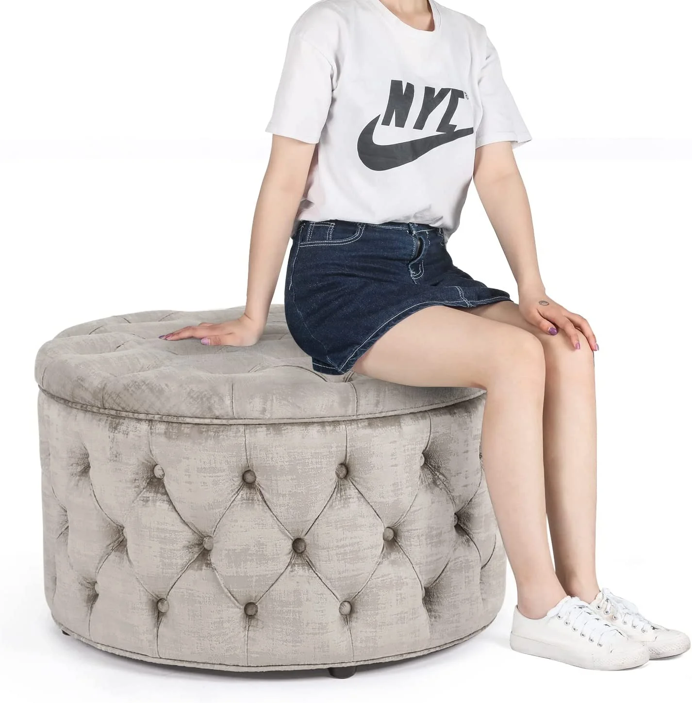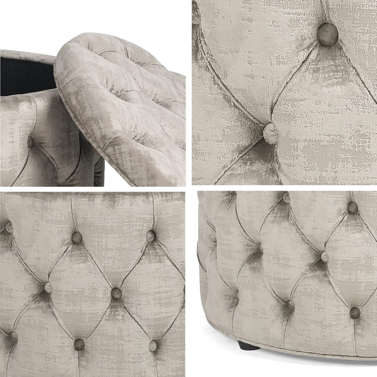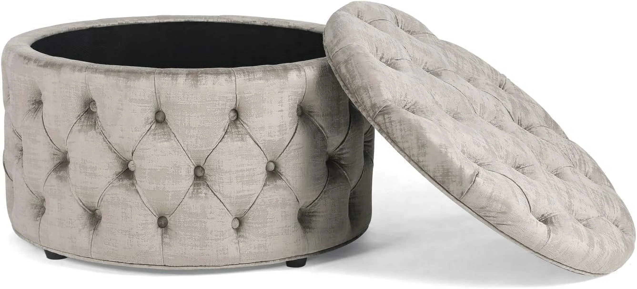 Round Storage Ottoman, Button Tufted Upholstered Ottoman With Removable Top, Storage Bench Coffee Table Footrest Stool For Living Room Bedroom Entryway (Beige)
