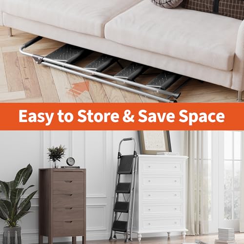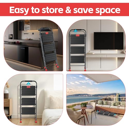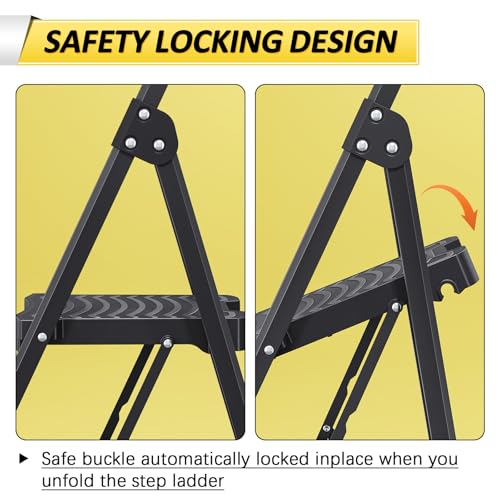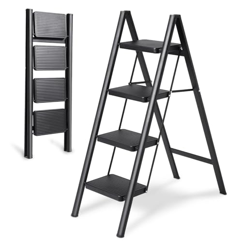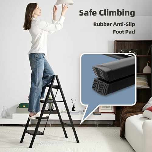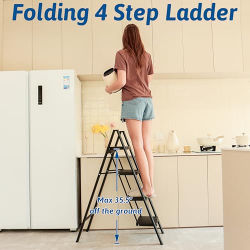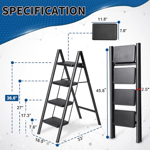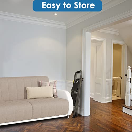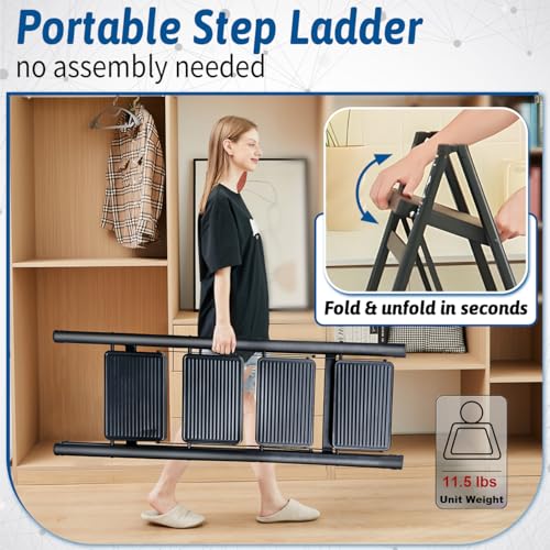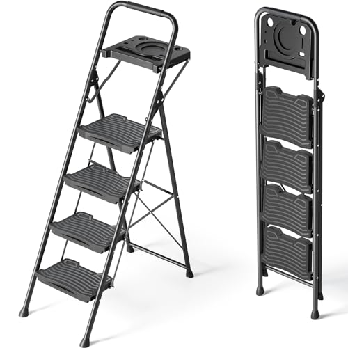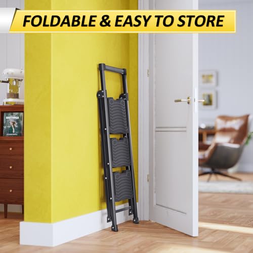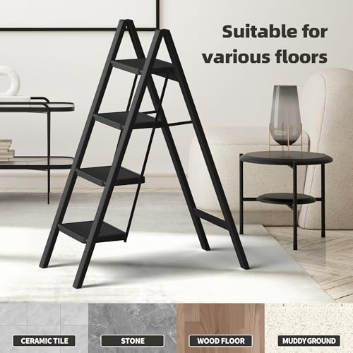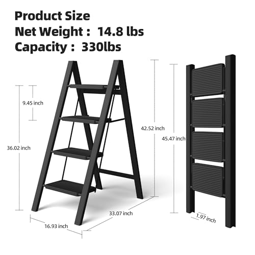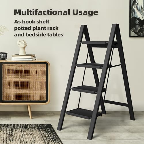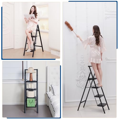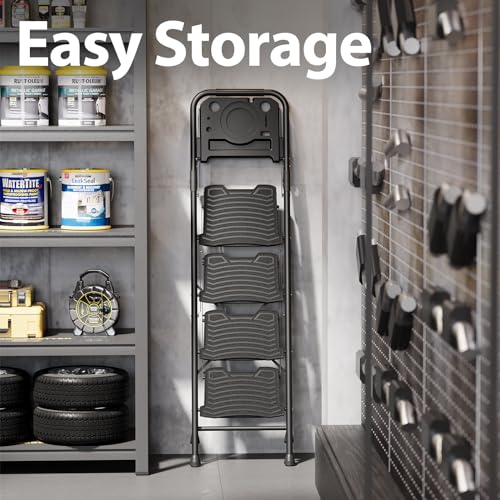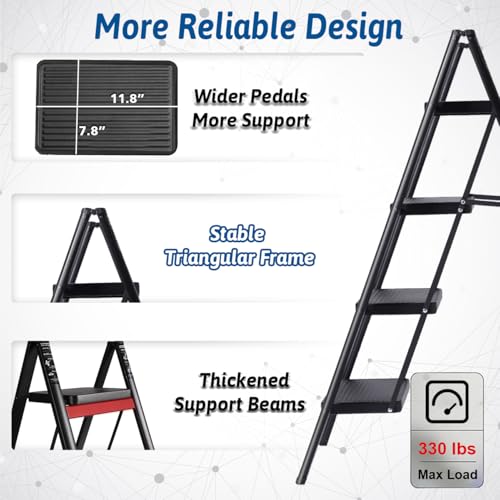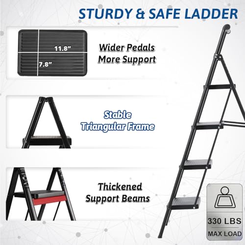 4 Step Ladder, Lightweight Folding Ladder with Anti-Slip Wide Pedal, Portable Multi-use Steel Step Stool for Adults, 330lbs Capacity Stepladder for Home, Office, Kitchen, Library (Black)