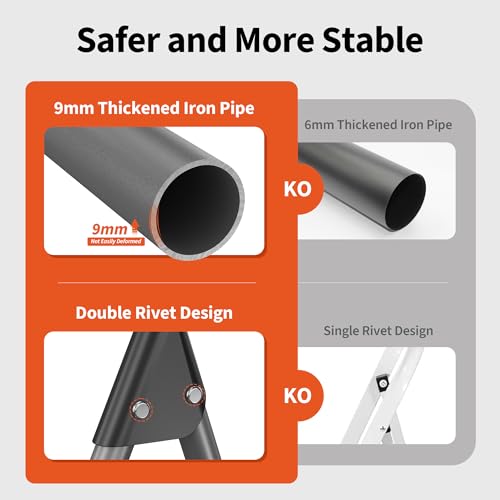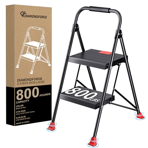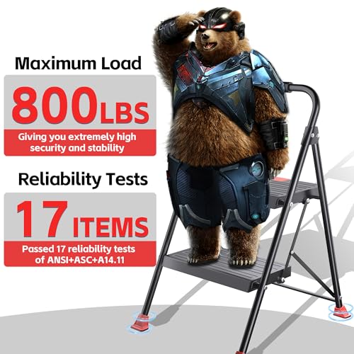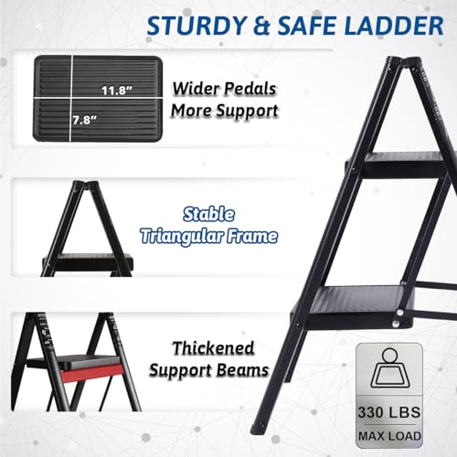 Double Elite Step Ladder 2 Step Folding, Sturdy 330 Lbs Load Folding Step Stool for Adults, Safer Full Steel Frame, Multi-use Closet/Home Kitchen Small Step Ladder with Wide Pedals, Black