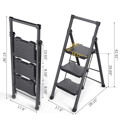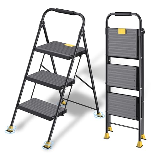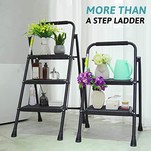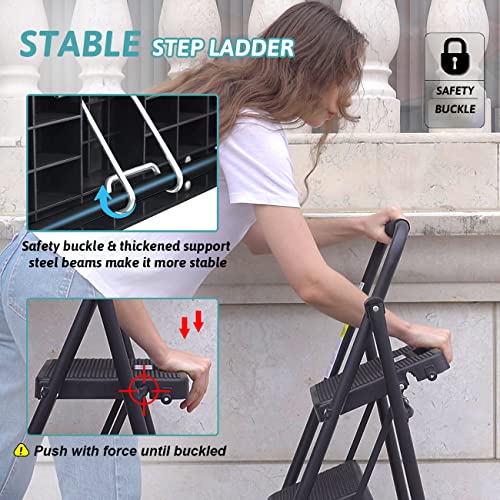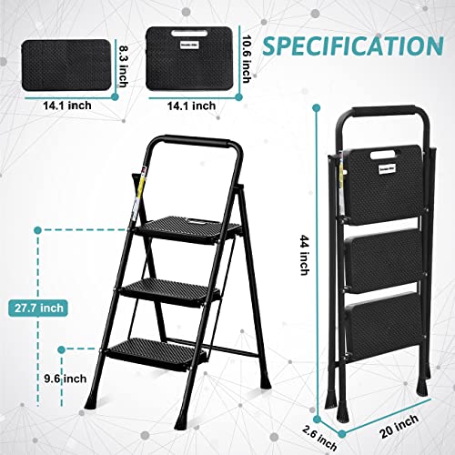 Double Elite Step Ladder 3 Step Folding with Handgrip, 500 Lbs Load Heavy Duty Steel Step Stool, Multi-use Folding Ladder with Anti-Slip Wide Pedals, Portable Kitchen/Closet Small Step Ladder, Black