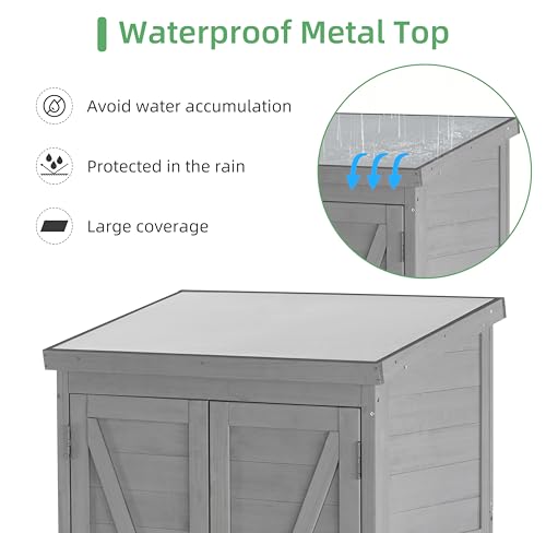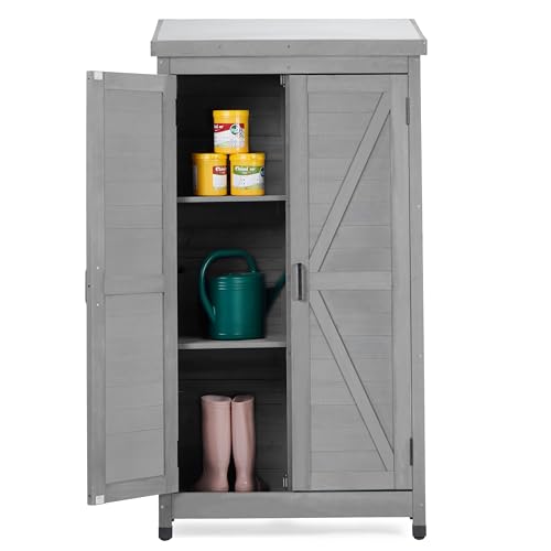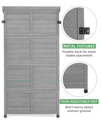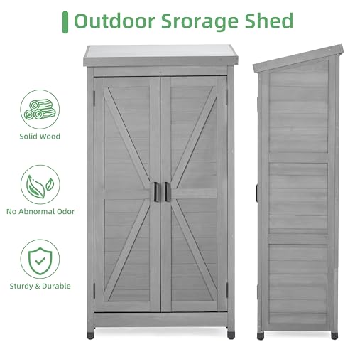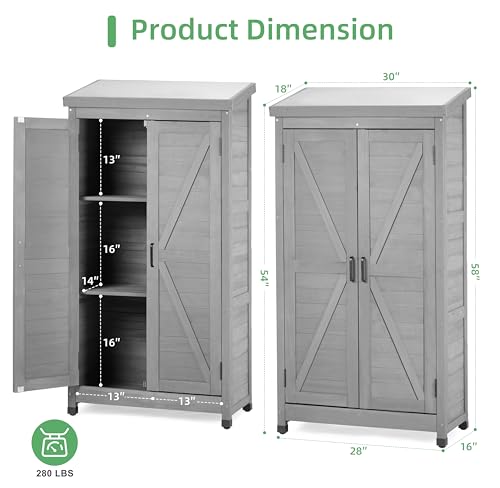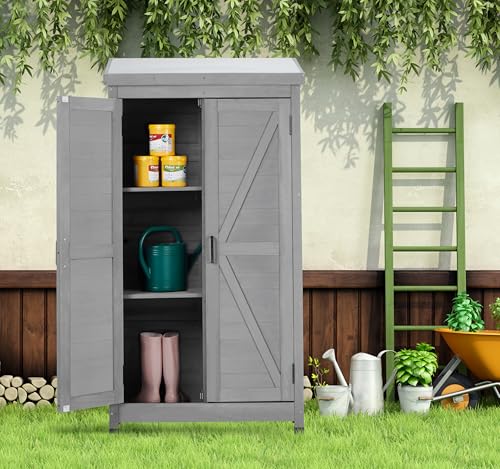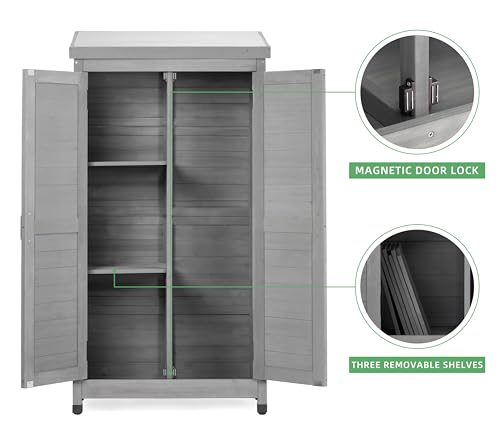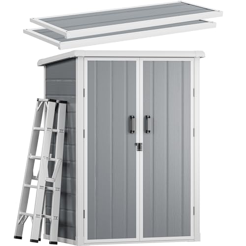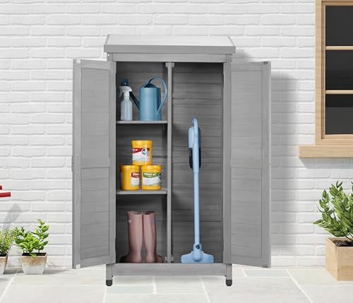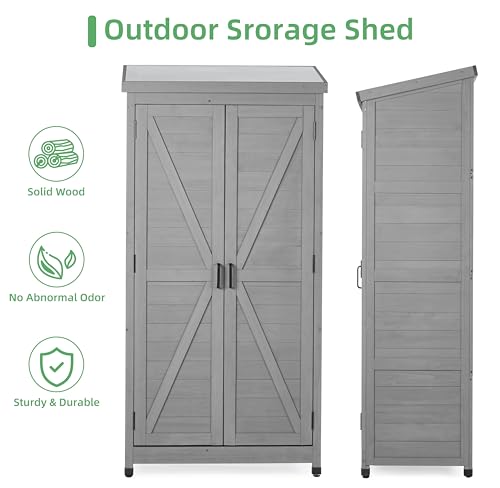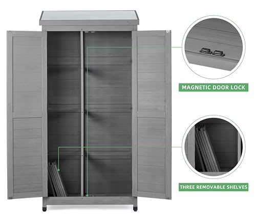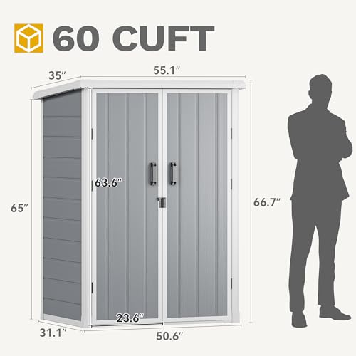 DWVO 60 Cuft Outdoor Tall Storage Shed with 2 Shelves, Weatherproof Vertical Tool Shed with Floor & Lockable Doors, Sturdy Double-Wall Plastic Cabinet for Garbage Cans and Garden Equipment (Gray)