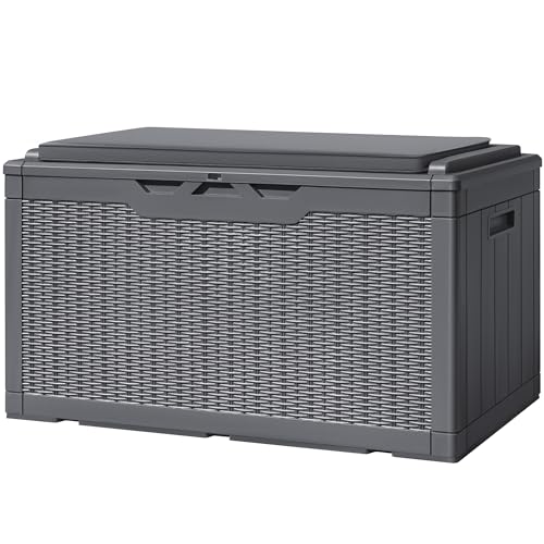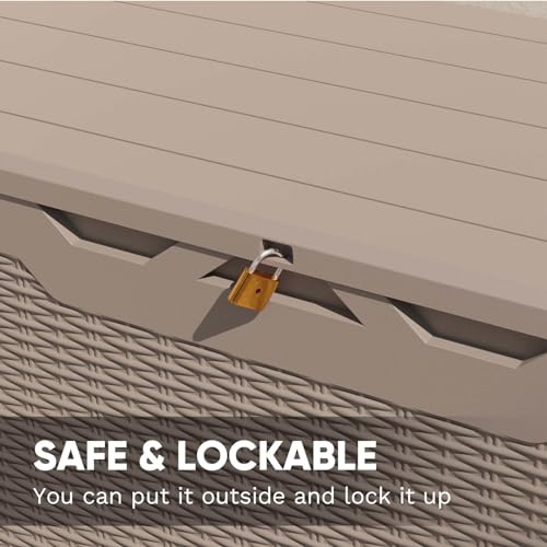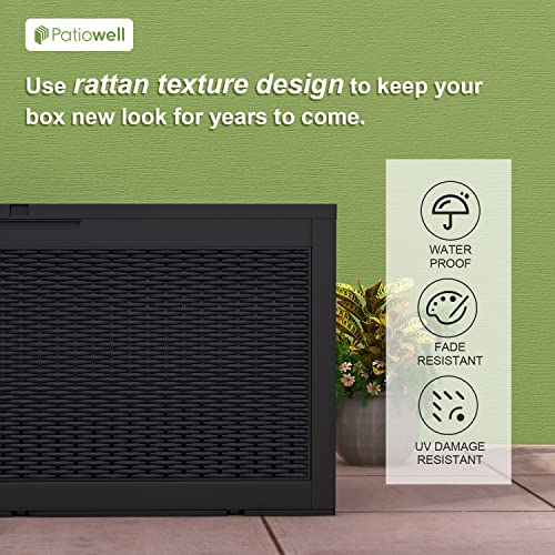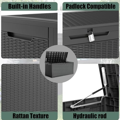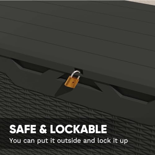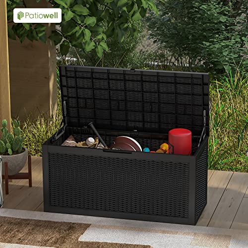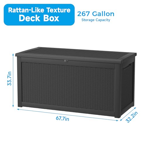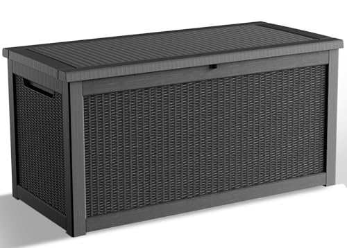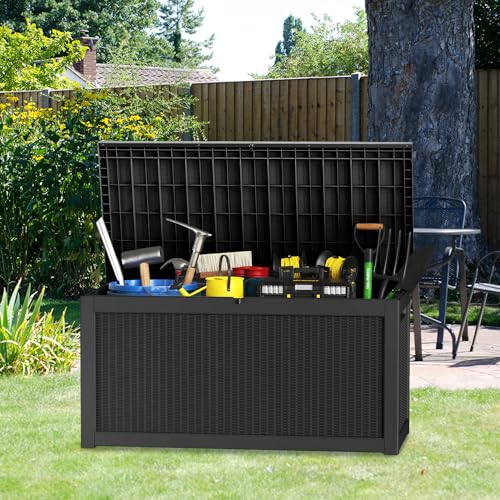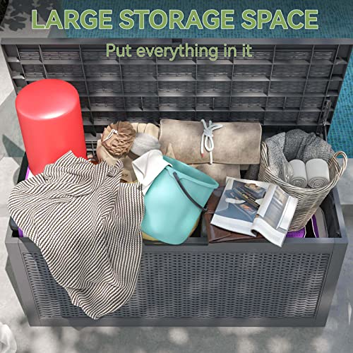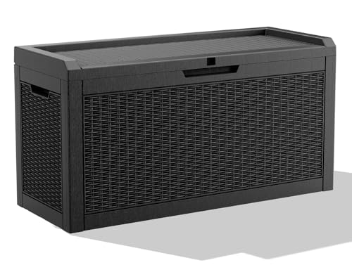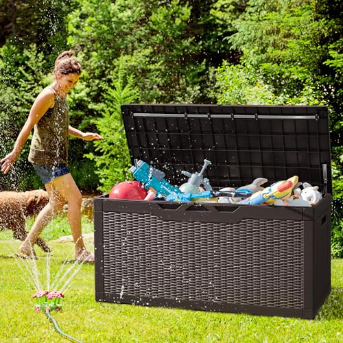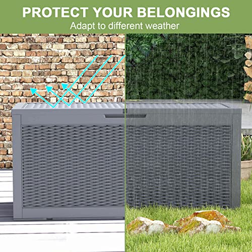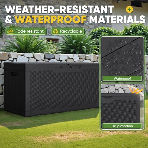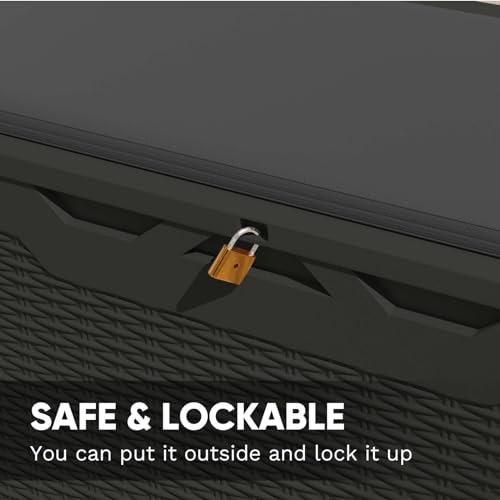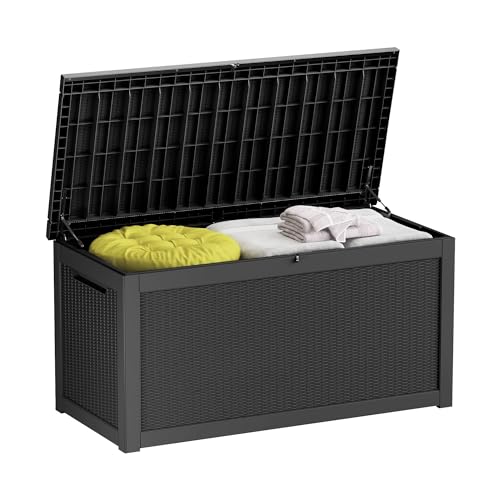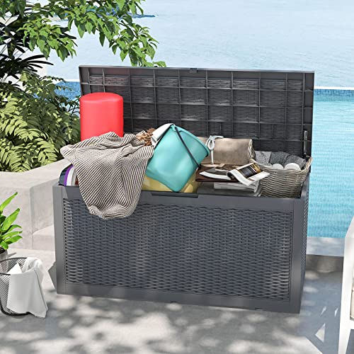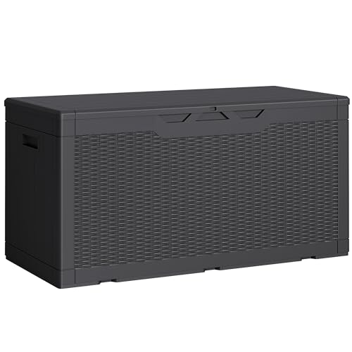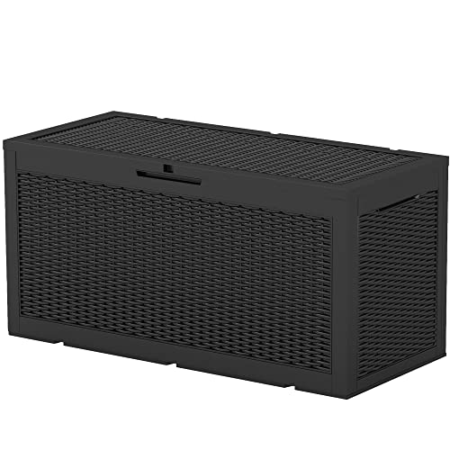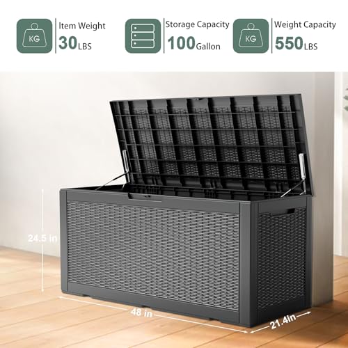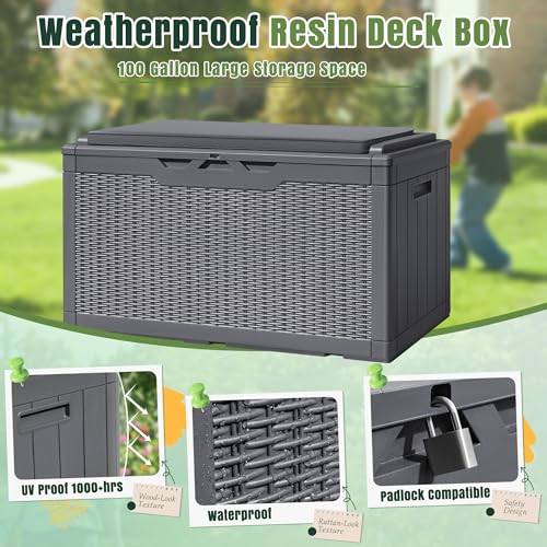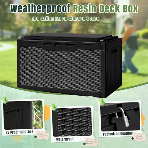 100 Gallon Outdoor Storage Box,Large Waterproof Resin Deck Box,Lockable Storage Container with Reinforced Support for Patio Cushions,Garden Tools,UV-Resistant(Black Rattan)