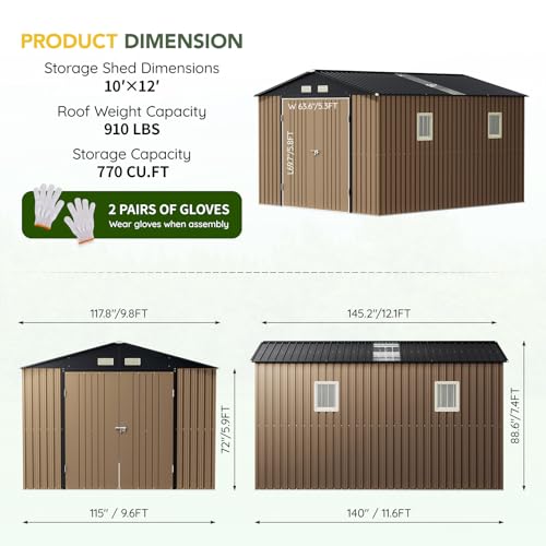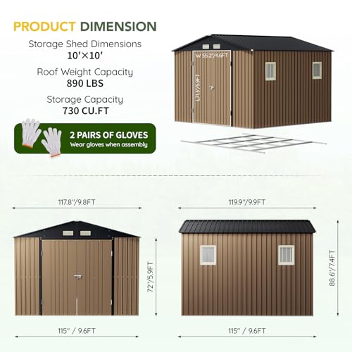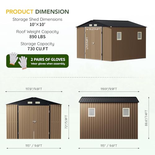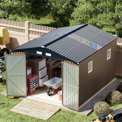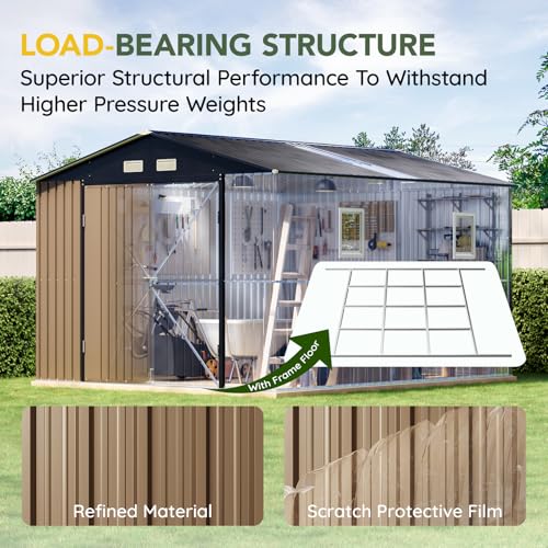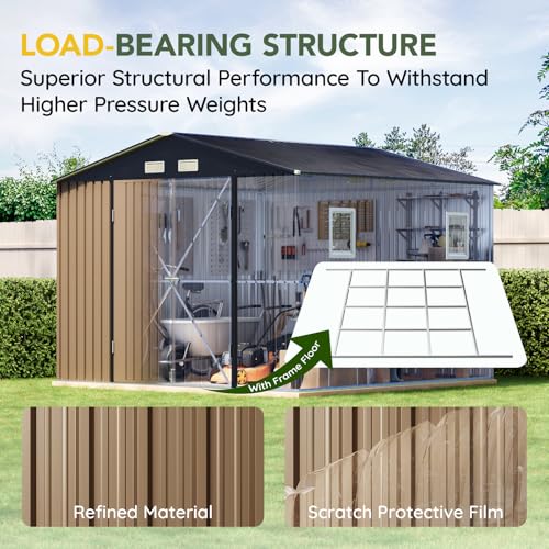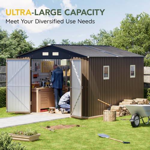 Outdoor Storage Shed 10 x 12ft. Utility Tool Shed Metal Storage Garden Shed with Lockable Doors, Windows & Metal Frame Floor for Patio Storage,Brown