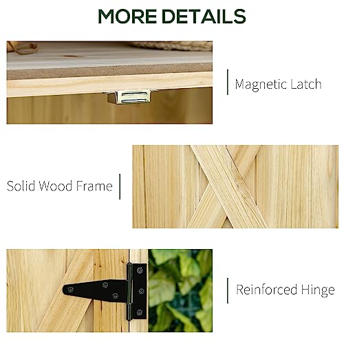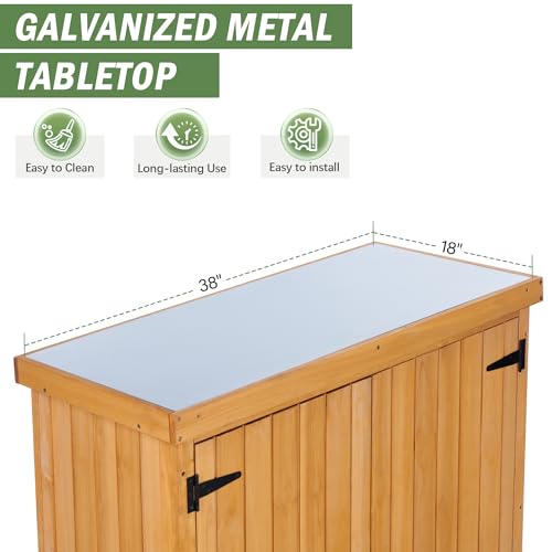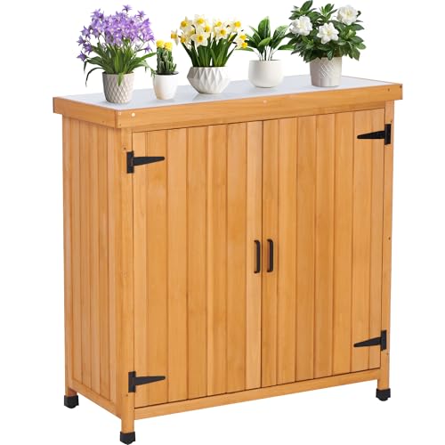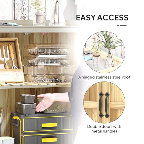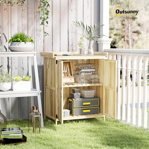 Outsunny Outdoor Storage Cabinet, Garden Tool Shed with Metal Tabletop and Shelf, Wooden Potting Bench with 2 Doors for Backyard, Patio, Lawn, Natural Wood