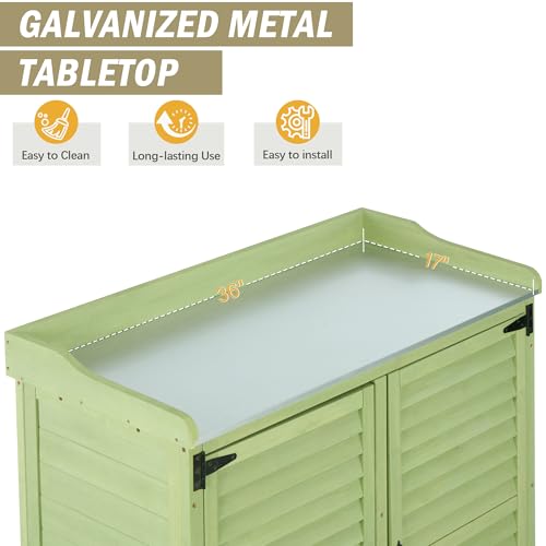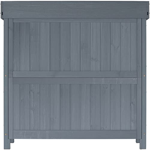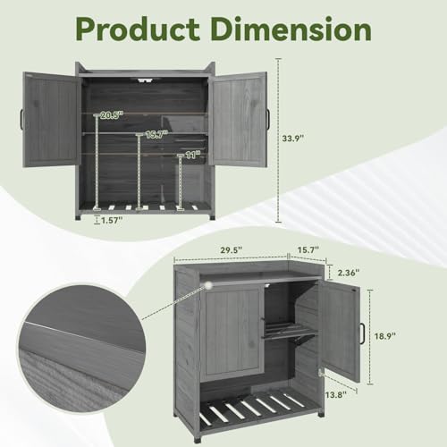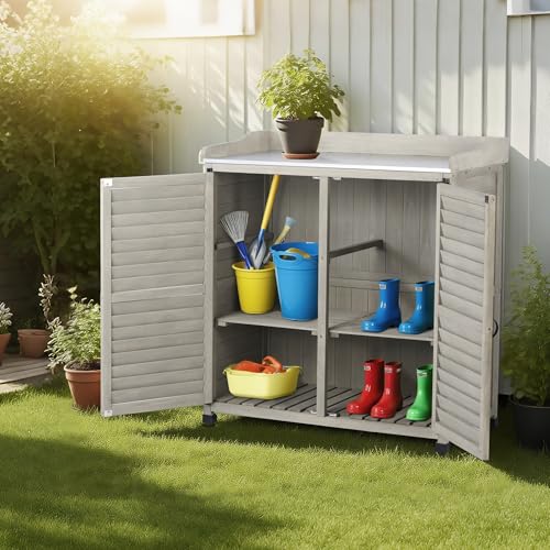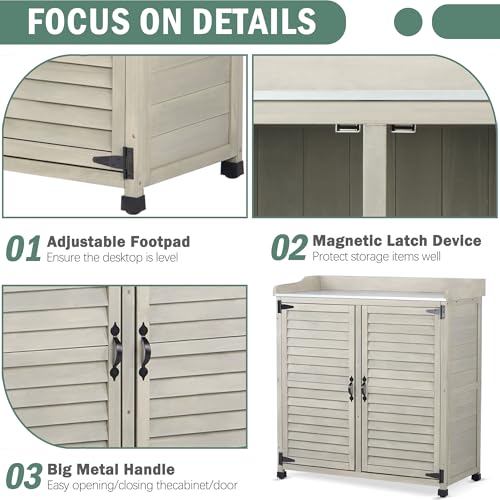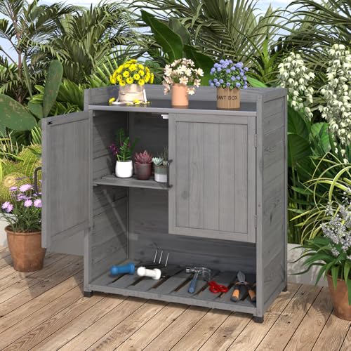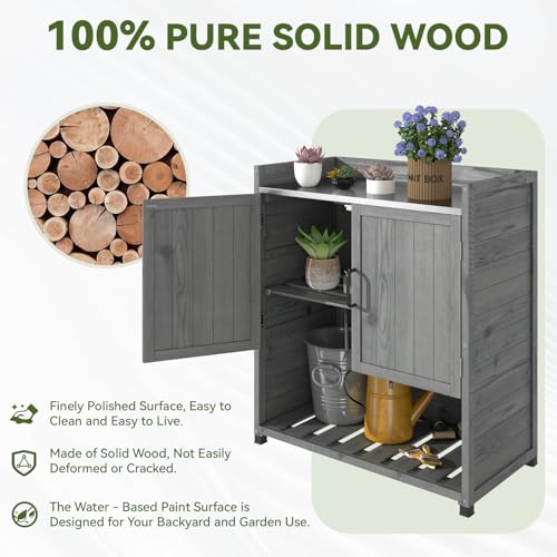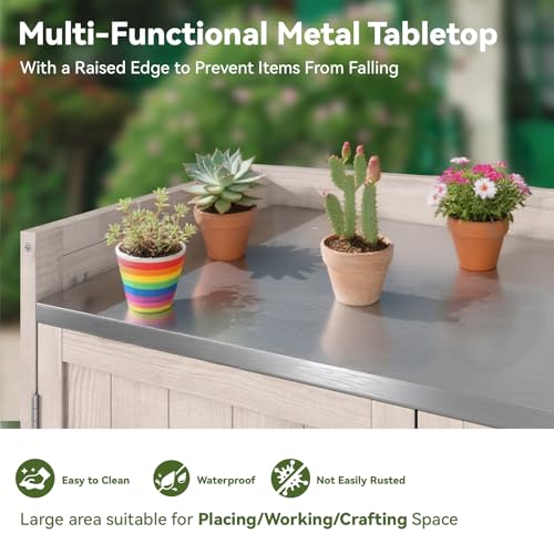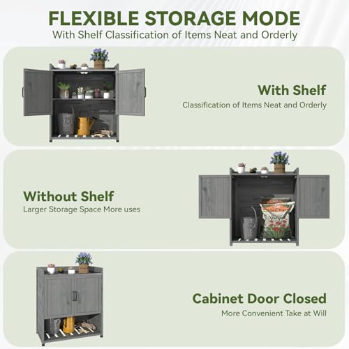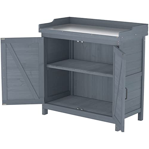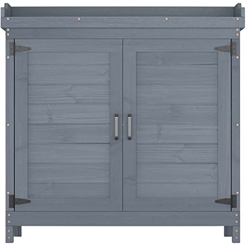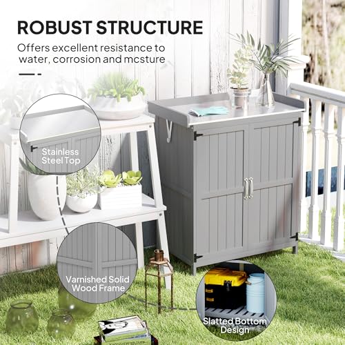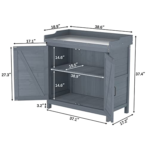 AECOJOY Outdoor Storage Cabinet&Potting Bench Table, Garden Wooden Work Bench with Adjustable Shelf, Patio Tool Work Station Planting Table with Metal Tabletop, Grey