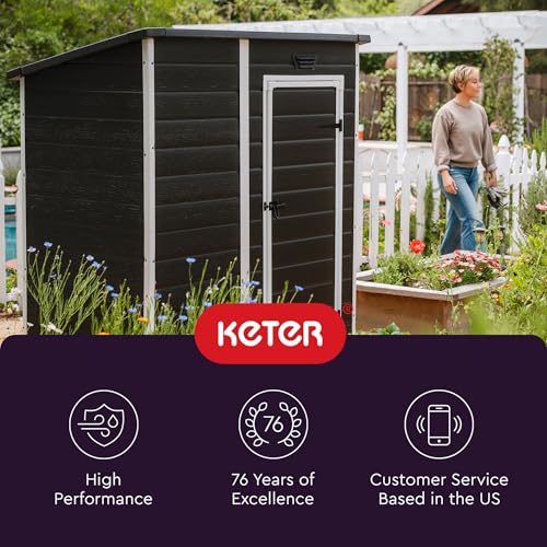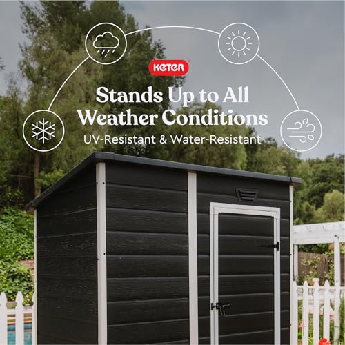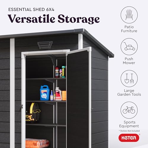 Keter Essential Shed 4x6 Resin Outdoor Storage Shed Ideal Storage for Patio Furniture, Garden Tools Bike Accessories, Beach Chairs and Lawn Mower, Black and White