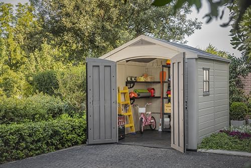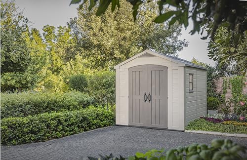 Keter Factor (8x6 ft) Large Resin Outdoor Storage Shed for Patio Furniture, Lawn Mower, Garden Accessories Yard Tools, and Pool Toys, Taupe
